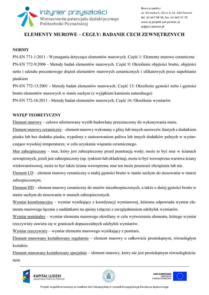 ELEMENTY MUROWE – CEGŁY: BADANIE CECH ZEWNĘTRZNYCH NORMY PN-EN 771-1:2011 - Wymagania dotyczące elementów murowych. Część 1: Elementy murowe ceramiczne PN-EN 772-9:2006 - Metody badań elementów murowych. Część 9: Określenie objętości brutto, objętości netto i udziału procentowego drążeń elementów murowych ceramicznych i silikatowych przez napełnianie piaskiem PN-EN 772-13:2001 - Metody badań elementów murowych. Część 13: Określenie gęstości netto i gęstości brutto elementów murowych w stanie suchym (z wyjątkiem kamienia naturalnego) PN-EN 772-16:2011 - Metody badań elementów murowych. Część 16: Określenie wymiarów WSTĘP TEORETYCZNY Element murowy – celowo uformowany wyrób budowlany przeznaczony do wykonywania muru. Element murowy ceramiczny – element murowy wykonany z gliny lub innych surowców ilastych z dodatkiem piasku lub bez dodatku piasku, wypalony z zastosowaniem paliwa lub innych dodatków palnych w wystarczająco wysokiej temperaturze, w celu uzyskania wiązania ceramicznego. Mur zabezpieczony – mur, który jest zabezpieczony przed penetracją wody; może to być mur w ścianach zewnętrznych, jeżeli jest zabezpieczony (np. tynkiem lub okładziną), może to być wewnętrzna warstwa ściany wielowarstwowej, może to być także ściana wewnętrzna; mur ten może przenosić obciążenia lub nie. Element LD – element murowy ceramiczny o małej gęstości brutto w stanie suchym do stosowania w murze zabezpieczonym. Element HD – element murowy ceramiczny do murów niezabezpieczonych, a także o dużej gęstości brutto w stanie suchym do stosowania w murach zabezpieczonych. Wymiar koordynacyjny – wymiar wynikający z koordynacji wymiarowej, któremu odpowiada wymiar elementu murowego łącznie z naddatkami na spoiny (złącza) z uwzględnieniem odchyłek wymiarów. Wymiar nominalny – wymiar elementu murowego określany w celu wytworzenia elementu, którego wymiar rzeczywisty zawiera się w granicach dopuszczalnych odchyłek wymiarów. Wymiar rzeczywisty – wymiar elementu murowego wynikający z pomiaru. Element murowany kształtowany regularnie – element murowy o całkowicie prostokątnym, równoległym kształcie. Element murowany kształtowany specjalnie – element murowy, który nie jest prostokątnym równoległościanem. Element uzupełniający – element murowy o kształcie dostosowanym do spełnienia szczególnej funkcji, np. do uzupełnienia geometrii muru. Złącze – odpowiednio ukształtowane i dopasowane występy oraz wgłębienia na elementach murowych, np. system wpustów i wypustów. Drążenie pionowe – uformowana wolna przestrzeń przechodząca przez cały element murowy prostopadle do powierzchni kładzenia (wspornej). Drążenie poziome – uformowana wolna przestrzeń przechodząca przez cały element murowy równolegle do powierzchni kładzenia (wspornej). Komora - uformowana wolna przestrzeń nie przechodząca przez cały element murowy. Zagłębienie – obniżenie uformowane na jednej powierzchni lub obu powierzchniach kładzenia elementu; objętość wszystkich takich obniżeń nie powoduje zmiany wartości określanej objętości całkowitej elementu, tj. długość * szerokość * wysokość. Wnęka – obniżenie lub wcięcie na jednej powierzchni lub kilku powierzchniach wewnętrznych elementu murowego (np. wnęka lub wycięcie na zaprawę, rowek zwiększający przyczepność do zaprawy, otwór chwytowy). Otwór chwytowy – wolna przestrzeń przechodząca przez cały element murowy prostopadle do powierzchni kładzenia (wspornej) uformowana w celu ułatwienia chwytania elementu murowego. Ścianka zewnętrzna – materiał ceramiczny zawarty między drążeniami a powierzchniami zewnętrznymi elementu murowego. Ścianka wewnętrzna – materiał ceramiczny zawarty miedzy drążeniami w elemencie murowym. Wartość deklarowana – wartość, której osiągnięcie zapewni producent, biorąc pod uwagę dokładność badania i zmienność procesu produkcji. Wytrzymałość średnia na ściskanie elementów murowych – średnia arytmetyczna wytrzymałości na ściskanie elementów murowych. Znormalizowana wytrzymałość na ściskanie – wytrzymałość na ściskanie elementów murowych przeliczona na wytrzymałość na ściskanie w stanie powietrznosuchym równoważnego elementu murowego o szerokości 100 mm i wysokości 100 mm. Element odporny na przenikanie wilgoci – element murowy ceramiczny, który ułożony w dwóch warstwach połączonych trwale zaprawą cementową jest odporny na przenikanie wilgoci w murze. Element murowy ceramiczny o dużej dokładności – element murowy ceramiczny o małych odchyłkach wymiarów, w szczególności dotyczących wysokości elementu. Element murowy ceramiczny pionowo drążony lub pustak ceramiczny – element murowy ceramiczny z co najmniej jednym uformowanym drążeniem, które całkowicie przechodzi przez element murowy prostopadle do powierzchni kładzenia. Element murowy ceramiczny poziomo drążony lub pustak ceramiczny – element murowy ceramiczny z co najmniej jednym uformowanym drążeniem, które całkowicie przechodzi przez element murowy równolegle do powierzchni kładzenia. Element murowy ceramiczny do wypełnienia betonem lub zaprawą – element murowy ceramiczny ze specjalnymi drążeniami przeznaczonymi do wypełnienia betonem lub zaprawą. Element murowy ceramiczny przeznaczony do prefabrykatów ściennych – element murowy ceramiczny przeznaczony do produkcji murów zbrojonych lub prefabrykatów ściennych o wysokości kondygnacji z pionowymi kanałami przeznaczonymi do wypełnienia zaprawą lub betonem. Element murowy ceramiczny narażony na działanie warunków surowych – element murowy lub elementy muru, które w warunkach docelowego zastosowania są narażone na nasycanie wodą (zacinający deszcz, woda gruntowa) połączone z częstymi cyklami zamrażania-odmrażania, spowodowanymi warunkami klimatycznymi i brakiem 