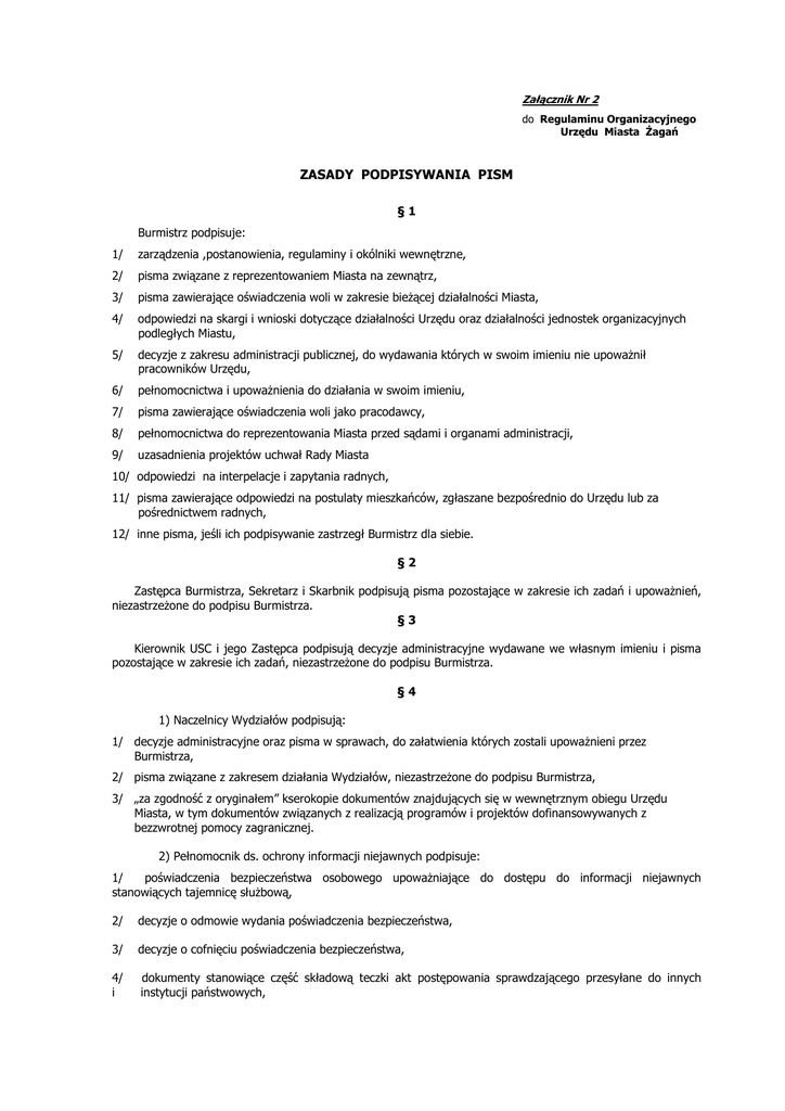 Załącznik Nr 2 do Regulaminu Organizacyjnego Urzędu Miasta śagań ZASADY PODPISYWANIA PISM §1 Burmistrz podpisuje: 1/ zarządzenia ,postanowienia, regulaminy i okólniki wewnętrzne, 2/ pisma związane z reprezentowaniem Miasta na zewnątrz, 3/ pisma zawierające oświadczenia woli w zakresie bieŜącej działalności Miasta, 4/ odpowiedzi na skargi i wnioski dotyczące działalności Urzędu oraz działalności jednostek organizacyjnych podległych Miastu, 5/ decyzje z zakresu administracji publicznej, do wydawania których w swoim imieniu nie upowaŜnił pracowników Urzędu, 6/ pełnomocnictwa i upowaŜnienia do działania w swoim imieniu, 7/ pisma zawierające oświadczenia woli jako pracodawcy, 8/ pełnomocnictwa do reprezentowania Miasta przed sądami i organami administracji, 9/ uzasadnienia projektów uchwał Rady Miasta 10/ odpowiedzi na interpelacje i zapytania radnych, 11/ pisma zawierające odpowiedzi na postulaty mieszkańców, zgłaszane bezpośrednio do Urzędu lub za pośrednictwem radnych, 12/ inne pisma, jeśli ich podpisywanie zastrzegł Burmistrz dla siebie. §2 Zastępca Burmistrza, Sekretarz i Skarbnik podpisują pisma pozostające w zakresie ich zadań i upowaŜnień, niezastrzeŜone do podpisu Burmistrza. §3 Kierownik USC i jego Zastępca podpisują decyzje administracyjne wydawane we własnym imieniu i pisma pozostające w zakresie ich zadań, niezastrzeŜone do podpisu Burmistrza. §4 1) Naczelnicy Wydziałów podpisują: 1/ decyzje administracyjne oraz pisma w sprawach, do załatwienia których zostali upowaŜnieni przez Burmistrza, 2/ pisma związane z zakresem działania Wydziałów, niezastrzeŜone do podpisu Burmistrza, 3/ „za zgodność z oryginałem” kserokopie dokumentów znajdujących się w wewnętrznym obiegu Urzędu Miasta, w tym dokumentów związanych z realizacją programów i projektów dofinansowywanych z bezzwrotnej pomocy zagranicznej. 2) Pełnomocnik ds. ochrony informacji niejawnych podpisuje: 1/ poświadczenia bezpieczeństwa osobowego upowaŜniające do dostępu do informacji niejawnych stanowiących tajemnicę słuŜbową, 2/ decyzje o odmowie wydania poświadczenia bezpieczeństwa, 3/ decyzje o cofnięciu poświadczenia bezpieczeństwa, 4/ i dokumenty stanowiące część składową teczki akt postępowania sprawdzającego przesyłane do innych instytucji państwowych, 2 5/ 6/ zaświadczenia o przeszkoleniu z zakresu ochrony informacji niejawnych, „za zgodność z oryginałem” kserokopie dokumentów bezpieczeństwa osobowego. §5 Pracownicy Wydziałów posiadają upowaŜnienie do podpisywania korespondencji w obiegu wewnętrznym Urzędu. §6 Pracownicy przygotowujący projekty pism, w tym decyzji administracyjnych, parafują je swoim podpisem, umieszczonym na końcu tekstu projektu z lewej strony egzemplarza pozostającego w aktach Urzędu. §7 Postanowienia niniejszego załącznika nie naruszają postanowień „Instrukcji kancelaryjnej”.