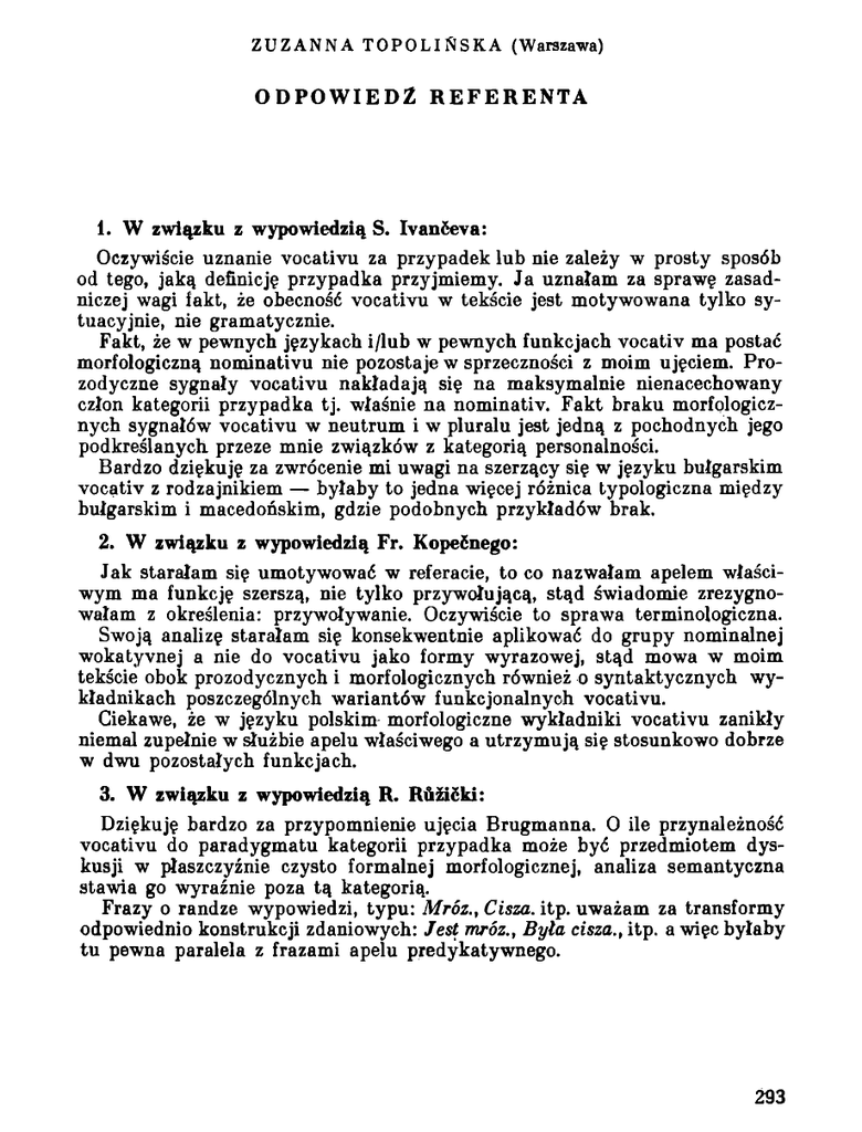 Z U Z A N N A T O P O L I N S K A (Warszawa) ODPOWIEDZ REFERENTA 1. W związku z wypowiedzią S. Ivanceva: Oczywiście uznanie vocativu za przypadek lub nie zależy w prosty sposób od tego, jaką definicję przypadka przyjmiemy. Ja uznałam za sprawę zasad niczej wagi fakt, że obecność vocativu w tekście jest motywowana tylko sy tuacyjnie, nie gramatycznie. Fakt, że w pewnych językach i/lub w pewnych funkcjach vocativ ma postać morfologiczną nominativu nie pozostaje w sprzeczności z moim ujęciem. Prozodyczne sygnały vocativu nakładają się na maksymalnie nienacechowany człon kategorii przypadka tj. właśnie na nominativ. Fakt braku morfologicz nych sygnałów vocativu w neutrum i w pluralu jest jedną z pochodnych jego podkreślanych przeze mnie związków z kategorią personalności. Bardzo dziękuję za zwrócenie mi uwagi na szerzący się w języku bułgarskim vocativ z rodzajnikiem — byłaby to jedna więcej różnica typologiczna między bułgarskim i macedońskim, gdzie podobnych przykładów brak. 2. W związku z wypowiedzią Fr. Kopećnego: Jak starałam się umotywować w referacie, to co nazwałam apelem właści wym ma funkcję szerszą, nie tylko przywołującą, stąd świadomie zrezygno wałam z określenia: przywoływanie. Oczywiście to sprawa terminologiczna. Swoją analizę starałam się konsekwentnie aplikować do grupy nominalnej wokatyvnej a nie do vocativu jako formy wyrazowej, stąd mowa w moim tekście obok prozodycznych i morfologicznych również o syntaktycznych wy kładnikach poszczególnych wariantów funkcjonalnyoh vocativu. Ciekawe, że w języku polskim morfologiczne wykładniki vocativu zanikły niemal zupełnie w służbie apelu właściwego a utrzymują się stosunkowo dobrze w dwu pozostałych funkcjach. 3. W związku z wypowiedzią R. Ruźićki: Dziękuję bardzo za przypomnienie ujęcia Brugmanna. O ile przynależność vocativu do paradygmatu kategorii przypadka może być przedmiotem dys kusji w płaszczyźnie czysto formalnej morfologicznej, analiza semantyczna stawia go wyraźnie poza tą kategorią. Frazy o randze wypowiedzi, typu: Mróz., Cisza. itp. uważam za transformy odpowiednio konstrukcji zdaniowych: Jest mróz., Była cisza., itp. a więc byłaby tu pewna paralela z frazami apelu predykatywnego. 293