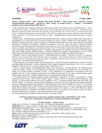 WRÓBEL 11 lipca 2009 Srebro: Grzegorz Eitej – judo, Klaudia Jans/Alicja Rosolska - debel tenisa, brąz: siatkarki, Justyna Mospinek/Rafał Dobrowolski – łucznictwo, mikst. Mamy 16 medali (5-5-6) i 7. miejsce w klasyfikacji medalowej universjady Belgrad 2009. Brawo! * Piąty medal dla judo! Srebrnym medalistą został Grzegorz Eitel w kat. open po walce z Koreańczykiem. - Jest to jego największy sukces, a jednocześnie potwierdza jego przynaleŜność do światowej czołówki – powiedział trener Radosław Laskowski. Mało brakowało do wygranej, ale popełnił błąd. My to nazywamy, Ŝe zawodnik skontrował akurat techniką.Ten błąd kosztował go przegraną. Nie była to przegrana przed czasem, poniewaŜ walczył do końca. NaleŜy podkreślić, Ŝe był bardzo zmotywowany do walki – uzupełnił trener. Dzisiaj zobaczymy panie w turnieju druŜynowym. * Klaudia Jans i Alicja Rosolska przegrały finał turnieju deblowego i zdobyły srebrne medale. Polki rozpoczęły od prowadzenia 2:0 w pierwszym secie, ale potem przegrały trzy gemy z rzędu i zrobiło się 4:3 dla Rosjanek. Alicja Rosolska i Klaudia Jans były wyraźnie zmęczone wcześniejszymi meczami. Pierwszego seta przegrały przy podaniu Rosolskiej. W drugim to Diachenko i Makarova rozpoczęły od 2:0, po czym trzy gemy z rzędu wywalczyła pierwsza para turnieju deblowego. Rywalizacja wyrównała się, z tym, Ŝe to Polkom, które grały najsłabszy mecz w całych zawodach, przytrafiały się powaŜniejsze błędy. Przy 4:5 Diachenko zmarnowała pierwszego meczbola, a przy 5:6 drugiego. Rosjanki dopięły swego w tie-breaku, wygrywając go do jednego. Na postawę w deblu na pewno miał wpływ takŜe poranny półfinał singlowy, w którym Klaudia Jans wygrała z Nikolą Frankovą 7:6, 6:2. Polka stanie więc przed drugą szansą na złoto, o które powalczy z turniejową "trójką" Rosjanką Ksenią Lykiną. * Siatkarki w meczu o brąz pokonały Rosję 3:1. Rafał Błaszczyk powiedział: - Zrobiliśmy wszystko, co mogliśmy. Więcej się po prostu nie dało. Serbia była poza naszym zasięgiem. - To był bardzo trudny mecz. MoŜna było przecieŜ odjechać z niczym. Wiedziałyśmy jednak, jak zagrać z Rosjankami. Byłyśmy od nich szybsze i przez to niewiele nam mogły zrobić – komentowała Karolina Kosek * Niepowodzenia w łucznictwie udało się zrekompensować w ostatniej łucznicej konkurencji - mixtach. Do walki przystąpił Rafał Dobrowolski i Justyna Mospinek, którzy najpierw pokonali Amerykanów (14:11), by w połfinale przegrać z Ukrainą (12:14), a w meczu o brąz wygrać z Tajwanem 15:12. * Horror w pięciu aktach. Tak określilibyśmy ostatni mecz koszykarek z Wielką Brytanią. W regulaminowym czasie był rezultat remisowy 66:66. Dogrywkę rewelacyjnie zaczęły Brytyjki, trafiając trzy rzuty pod rząd za 2 punkty. Na szczęście udało się odrobić te straty, i mecz zakończył sie 4. punktowym zwycięstwem. Mecz był zupełnie inny niŜ w fazie grupowej (zakończony 10. punktową przewagą). W tym meczu przeciwniczki zagrały bardzo agresywną obronę z wielkim zaangaŜowaniem, co zdecydowanie zaskoczyło Polki. * Wczorajszy dzień był kolejnym dniem zmagań lekkoatletów. Sprinterzy na 200 m wystartowali w biegu finałowym; Marta Jeszke, AZS AWFiS Gdańsk, zajęła 5. miejsce (23.56 s), natomiast Robert Kubaczyk, AZS Poznań – po ustanowieniu rekordu Ŝyciowego w półfinale 21.02 s - nie ukończył biegu finałowego. Igor Janik, AZS AWFiS Gdańsk, w konkursie oszczepu swoim najdłuŜszym rzutem (79.16 m) nie zapewniło mu miejsa na podium, tak jak w poprzednich dwóch universjadach, a Paweł Rakoczy (AZS AWFiS Gdańsk był szósty.( 77.22). Kamila Stepaniuk, studentka WSZiF w Białynstoku, awansowała do finału skoku wzwyŜ (185 cm), i wystąpi w niedzielnym finale. DuŜe nadzieje wiązaliśmy z występem tyczkarki Joanny Piwowarskiej z AZS AWF Warszawa. Kiedy pokonała poprzeczkę na wysokości 4.45 byliśmy pewni medalu. Na wysokości 4.50 zmieniła tyczkę, nie dało to pozytywnej prób na tej wysokości, i tym samym znalazła się na 4. miejscu. śyczymy lekkoatletom wszystkich udanych startów. Trzymamy kciuki! * UWAGA! Zapraszamy serdecznie na spotkanie polskiej ekipy POD BZEM o godz. 21.00. Będzie ono poŜegnaniem z Belgradem i z naszymi medalistami. Do miłego! Występy Polaków - sobota 11 lipca Tenis: godz. 10.00 Jans – Lykina (finał), godz. 10; Milan Gate Muskatirovic, dojazd linia E i nr 6 Siatkówka M (o 7. miejsce): Polska – Turcja, godz. 12.00, Pionir SH, dojazd linia 5 Gimnastyka artystyczna: godz. 17.15 – finał ćwiczeń ze wstęgą, Belgrad Fair, hala nr 1, dojazd linie C, 2, 3 LA: od godz. 11.30 elim. skoku w dal M, godz. 15.40 elim. sztafety 4x100 m KiM, 16.10 finał kuli K, 18.10 elim. sztafety 4x400m M, Red Star, dojazd linie A, 3, 4 Judo: od godz. 10.00 turniej druŜynowy kobiet (Polska – Korea Płn.), finały od godz. 16.00 Belgrad Fair, hala nr 3, dojazd linie C, 2, 3 Pływanie: od godz. 9.00 kwalifikacje, od godz. 18.00 finały (18.23 finał 50 m klasykiem kobiet), SRC Tasmajdan, dojazd linia D i nr 6