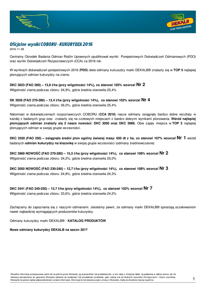 Oficjalne wyniki COBORU - KUKURYDZA 2016 2016-11-28 Centralny Ośrodek Badania Odmian Roślin Uprawnych opublikował wyniki Porejestrowych Doświadczeń Odmianowych (PDO) oraz wyniki Doświadczeń Rozpoznawczych (CCA) za 2016 rok. W wynikach doświadczeń porejestrowych 2016 (PDO) dwie odmiany kukurydzy marki DEKALB® znalazły się w TOP 5 najlepiej plonujących odmian kukurydzy na ziarno. DKC 3623 (FAO 260) – 13,8 t/ha (przy wilgotności 14%), co stanowi 105% wzorca! Nr 2 Wilgotność ziarna podczas zbioru: 24,9%, gdzie średnia stanowiła 25,4% DK 3939 (FAO 270-280) – 13,4 t/ha (przy wilgotności 14%), co stanowi 102% wzorca! Nr 4 Wilgotność ziarna podczas zbioru: 26,0%, gdzie średnia stanowiła 25,4% Natomiast w doświadczeniach rozpoznawczych COBORU (CCA 2016) nasze odmiany osiągnęły bardzo dobre rezultaty w każdej z badanych grup oraz znalazły się na czołowych miejscach z bardzo dobrymi wynikami plonowania. Wśród najlepiej plonujących odmian znalazły się 2 nasze nowości: DKC 3050 oraz DKC 3969. Obie zajęły miejsca w TOP 3 najlepiej plonujących odmian w swojej grupie wczesności. DKC 3350 (FAO 250) – osiągnęła średni plon ogólny świeżej masy: 650 dt z ha, co stanowi 107% wzorca! Nr 1 wśród badanych odmian kukurydzy na kiszonkę w swojej grupie wczesności (odmiany średniowczesne) DKC 3969 NOWOŚĆ (FAO 270-280) – 15,5 t/ha (przy wilgotności 14%), co stanowi 108% wzorca! Nr 2 Wilgotność ziarna podczas zbioru: 24,2%, gdzie średnia stanowiła 25,0% DKC 3050 NOWOŚĆ (FAO 230-240) – 12,7 t/ha (przy wilgotności 14%), co stanowi 108% wzorca! Nr 3 Wilgotność ziarna podczas zbioru: 24,8%, gdzie średnia stanowiła 24,3% DKC 3441 (FAO 240-250) – 13,7 t/ha (przy wilgotności 14%), co stanowi 102% wzorca! Nr 7 Wilgotność ziarna podczas zbioru: 23,6%, gdzie średnia stanowiła 24,2% Zachęcamy do zapoznania się z naszymi odmianami. Jesteśmy pewni, że odmiany marki DEKALB® sprostają oczekiwaniom nawet najbardziej wymagających producentów kukurydzy. Odmiany kukurydzy marki DEKALB® - KATALOG PRODUKTÓW Nowe odmiany kukurydzy DEKALB na sezon 2017 Wszelkie informacje przekazywane ustnie lub na piśmie przez Monsanto, jej pracowników lub przedstawicieli, w tym dane z niniejszej tabeli, są podawane w dobrej wierze, ale nie stanowią oświadczenia ani gwarancji Monsanto odnośnie do wydajności lub przydatności produktów, gdyż zależą one od lokalnych warunków klimatycznych i innych czynników. Monsanto nie ponosi żadnej odpowiedzialności za takie informacje. Informacje te nie stanowią części umowy z Monsanto, chyba że określono inaczej na piśmie. 1