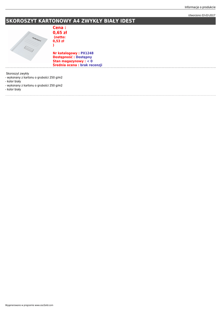 Informacje o produkcie Utworzono 03-03-2017 SKOROSZYT KARTONOWY A4 ZWYKŁY BIAŁY IDEST Cena : 0,65 zł (netto: 0,53 zł ) Nr katalogowy : PX1248 Dostępność : Dostępny Stan magazynowy : < 0 Średnia ocena : brak recenzji Skoroszyt zwykły - wykonany z kartonu o grubości 250 g/m2 - kolor biały - wykonany z kartonu o grubości 250 g/m2 - kolor biały Wygenerowano w programie www.oscGold.com