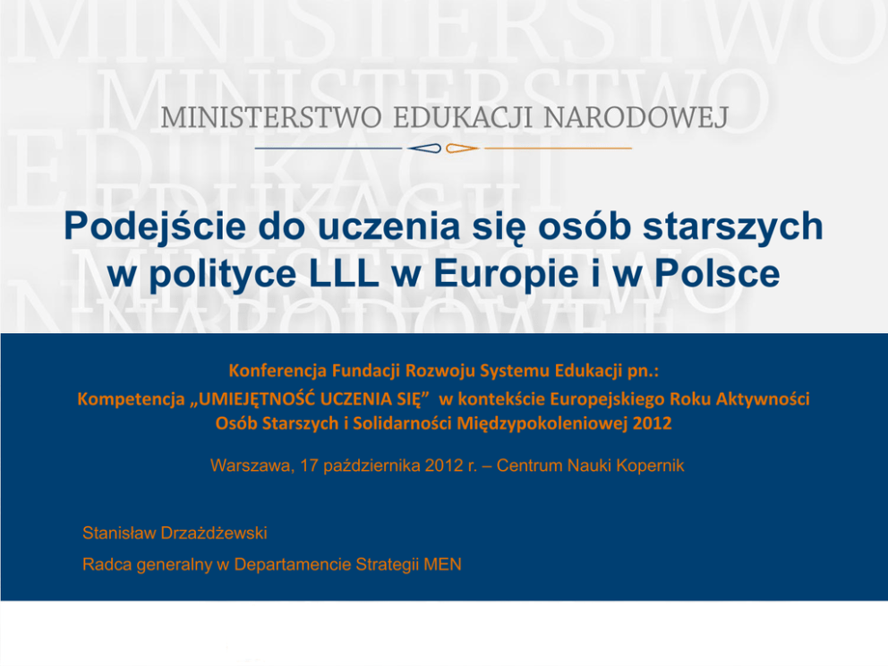 Podejście do uczenia się osób starszych w polityce LLL w Europie i w Polsce Konferencja Fundacji Rozwoju Systemu Edukacji pn.: Kompetencja „UMIEJĘTNOŚĆ UCZENIA SIĘ” w kontekście Europejskiego Roku Aktywności Osób Starszych i Solidarności Międzypokoleniowej 2012 Warszawa, 17 października 2012 r. – Centrum Nauki Kopernik Stanisław Drzażdżewski Radca generalny w Departamencie Strategii MEN Podejście do uczenia się osób starszych w polityce LLL w Europie i w Polsce 1. Wyzwania demograficzne 2. Stan uczenia się dorosłych 3. Europejska agenda na rzecz uczenia się dorosłych 4. Kompleksowe podejście do uczenia się dorosłych w projekcie polskiej polityki LLL Wyzwania demograficzne 1. Wyzwania dla systemów emerytalnych – według informacji Komisji Europejskiej większość państw UE reformuje systemy emerytalne w ostatnich 2 latach 2. Wyzwania dla systemów ochrony zdrowia 3. Zagrożenie niskimi dochodami osób starszych 4. Szczególne zagrożenie dotyczy osób starszych: • z niskim poziomem wykształcenia • mniej skłonnych do stałego uczenia się i adaptowania do zmian w swoim otoczeniu Stan uczenia się dorosłych 1. Systemy edukacji i wspierania uczenia się dotychczas nie nadążają za wymienionymi wyzwaniami i zagrożeniami 2. W ocenie Rady UE oraz Komisji Europejskiej uczenie się dorosłych jest obecnie najsłabszym ogniwem w rozwoju krajowych systemów uczenia się przez całe życie (LLL) Uczenie się dorosłych w Polce i w UE na tle edukacji dzieci i młodzieży Uczestnictwo dzieci od 4 roku życia do wieku obowiązku szkolnego we wczesnej edukacji w Polsce i w UE w latach 2000-2010 Odsetek osób w wieku 30-34 lat z wykształceniem wyższym w Polsce i w UE w latach 2000-2011 Stan uczenia się dorosłych w Polsce i w UE w latach 2000-2011 (uczestnictwo osób w wieku 25-64 lat w kształceniu i szkoleniu) Uczenie się dorosłych w Polce i w UE na tle rozwoju edukacji dzieci i młodzieży Odsetek osób w wieku 50-74 lat uczestniczących w kształceniu lub szkoleniu w UE, 2011 25% 20% 15% 10% HU GR PL SK LV LT IT FR DE IE MT CY BE UE27 PT EE ES CZ LU AT SI NL UK SE DK 0% FI 5% Używanie Internetu przez osoby w wieku 55-64 lat w UE, 2011 100% 90% 80% 70% 60% 50% 40% 30% 20% GR CY PT BG IT PL LT ES SI MT LV SK IE HU CZ UE27 EE AT FR DE BE UK LU DK NL SE 0% FI 10% Europejska agenda na rzecz uczenia się dorosłych 1. W związku z powyższym, uwaga w Europie nie koncentruje się jedynie na młodszych osobach (choć młodzież jest grupą priorytetową m.in. ze względu na duże bezrobocie) 2. Podczas polskiej prezydencji Rada Unii Europejskiej przyjęła Rezolucję w sprawie odnowionej europejskiej agendy na rzecz uczenia się dorosłych Europejska agenda na rzecz uczenia się dorosłych 1. Agenda na rzecz uczenia się dorosłych ma uzupełnić dwa duże obszary współpracy europejskiej w edukacji - tzw. Proces Kopenhaski (rozwój kształcenia i szkolenia zawodowego) oraz Proces Boloński (modernizacja szkolnictwa wyższego) 2. W Agendzie główną grupą odniesienia są osoby dorosłe pozostające w niekorzystnej sytuacji, w tym z niskim poziomem wykształcenia Europejska agenda na rzecz uczenia się dorosłych Agenda ma dwie perspektywy czasowe: • rok 2020 - w perspektywie którego postuluje się m.in. rozwijanie nowego podejścia do uczenia się dorosłych, niezredukowanego do podejścia "szkolnego„ • lata 2012-2014 - w latach tych realizowane będą działania zgrupowane w 5 priorytetach Europejska agenda na rzecz uczenia się dorosłych W perspektywie roku 2020 Agenda zakłada m.in.: • rozwijanie nowego podejścia do edukacji dorosłych opartego na odpowiedzialności i autonomii uczącego się • zapewnienia elastycznych rozwiązań dostosowanych do różnych potrzeb dorosłych • rozwijanie oferty usług związanych z uczeniem się seniorów, tak by promować ich aktywność, niezależność i zdrowy styl życia oraz wykorzystanie ich wiedzy i doświadczenia Europejska agenda na rzecz uczenia się dorosłych W perspektywie roku 2014 r. Agenda zakłada: 1. wdrażanie polityki na rzecz LLL i mobilności 2. poprawę jakości i skuteczności edukacji 3. promowanie równości i spójności społecznej oraz aktywności obywatelskiej 4. zwiększanie kreatywności i innowacyjności dorosłych 5. poszerzenie wiedzy na temat uczenia się dorosłych i monitorowanie tego sektora Kompleksowe podejście do uczenia się dorosłych w projekcie polskiej polityki LLL 1. Polska polityka LLL tworzy się w ramach nowego uporządkowania strategii rozwoju 2. W nowych, zintegrowanych strategiach rozwoju odchodzi się od podejścia resortowego – obecnie trwa proces przyjmowania kolejnych strategii przez Rząd 3. Plan uporządkowania strategii przewiduje, że każda z 9 strategii zintegrowanych określających rozwój całego państwa powinna zawierać działania na rzecz uczenia się przez całe życie (LLL), w tym rozwoju kompetencji i kwalifikacji osób Kompleksowe podejście do uczenia się dorosłych w projekcie polskiej polityki LLL 1. Plan uporządkowania strategii przewiduje możliwość tworzenia dodatkowych dokumentów strategicznych o ile wynikają one ze zobowiązań międzynarodowych 2. Takim dokumentem będzie projekt krajowej strategii LLL pn. „Perspektywa uczenia się przez całe życie” (PLLL) 3. Główną funkcją tego dokumentu jest poprawa spójności działań na rzecz rozwoju kompetencji i kwalifikacji we wszystkich, nowych strategiach rozwoju Kompleksowe podejście do uczenia się dorosłych w projekcie polskiej polityki LLL PLLL promować będzie nowe podejście do uczenia się dorosłych w Polsce, a w tym: 1. Rozwijanie mechanizmu koordynacji działań resortów na rzecz uczenia się dorosłych 2. Tworzenie systemu walidacji, jako podstawy nowoczesnego modelu edukacji dorosłych 3. Rozwijanie modelu uczenia się dorosłych, którego podstawą jest uczenie praktyczne 4. Promowanie nowych standardów szkolenia dorosłych 5. Wspieranie