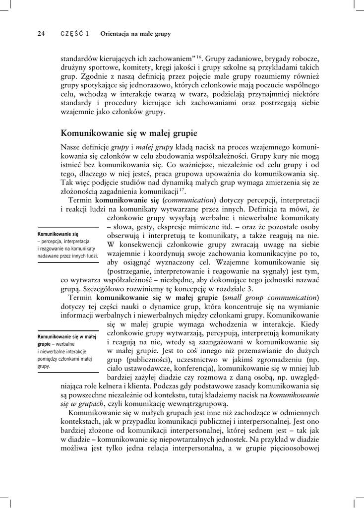 24 CZĘŚĆ 1 Orientacja na małe grupy standardów kierujących ich zachowaniem” 16. Grupy zadaniowe, brygady robocze, drużyny sportowe, komitety, kręgi jakości i grupy szkolne są przykładami takich grup. Zgodnie z naszą definicją przez pojęcie małe grupy rozumiemy również grupy spotykające się jednorazowo, których członkowie mają poczucie wspólnego celu, wchodzą w interakcje twarzą w twarz, podzielają przynajmniej niektóre standardy i procedury kierujące ich zachowaniami oraz postrzegają siebie wzajemnie jako członków grupy. Komunikowanie się w małej grupie Nasze definicje grupy i małej grupy kładą nacisk na proces wzajemnego komunikowania się członków w celu zbudowania współzależności. Grupy kury nie mogą istnieć bez komunikowania się. Co ważniejsze, niezależnie od celu grupy i od tego, dlaczego w niej jesteś, praca grupowa upoważnia do komunikowania się. Tak więc podjęcie studiów nad dynamiką małych grup wymaga zmierzenia się ze złożonością zagadnienia komunikacji 17. Termin komunikowanie się (communication) dotyczy percepcji, interpretacji i reakcji ludzi na komunikaty wytwarzane przez innych. Definicja ta mówi, że członkowie grupy wysyłają werbalne i niewerbalne komunikaty – słowa, gesty, ekspresje mimiczne itd. – oraz że pozostałe osoby Komunikowanie się obserwują i interpretują te komunikaty, a także reagują na nie. – percepcja, interpretacja W konsekwencji członkowie grupy zwracają uwagę na siebie i reagowanie na komunikaty wzajemnie i koordynują swoje zachowania komunikacyjne po to, nadawane przez innych ludzi. aby osiągnąć wyznaczony cel. Wzajemne komunikowanie się (postrzeganie, interpretowanie i reagowanie na sygnały) jest tym, co wytwarza współzależność – niezbędne, aby dokonujące tego jednostki nazwać grupą. Szczegółowo rozwiniemy tę koncepcję w rozdziale 3. Termin komunikowanie się w małej grupie (small group communication) dotyczy tej części nauki o dynamice grup, która koncentruje się na wymianie informacji werbalnych i niewerbalnych między członkami grupy. Komunikowanie się w małej grupie wymaga wchodzenia w interakcje. Kiedy członkowie grupy wytwarzają, percypują, interpretują komunikaty Komunikowanie się w małej i reagują na nie, wtedy są zaangażowani w komunikowanie się grupie – werbalne w małej grupie. Jest to coś innego niż przemawianie do dużych i niewerbalne interakcje pomiędzy członkami małej grup (publiczności), uczestnictwo w jakimś zgromadzeniu (np. grupy. ciało ustawodawcze, konferencja), komunikowanie się w mniej lub bardziej zażyłej diadzie czy rozmowa z daną osobą, np. uwzględniająca role kelnera i klienta. Podczas gdy podstawowe zasady komunikowania się są powszechne niezależnie od kontekstu, tutaj kładziemy nacisk na komunikowanie się w grupach, czyli komunikację wewnątrzgrupową. Komunikowanie się w małych grupach jest inne niż zachodzące w odmiennych kontekstach, jak w przypadku komunikacji publicznej i interpersonalnej. Jest ono bardziej złożone od komunikacji interpersonalnej, której sednem jest – tak jak w diadzie – komunikowanie się niepowtarzalnych jednostek. Na przykład w diadzie możliwa jest tylko jedna relacja interpersonalna, a w grupie pięcioosobowej