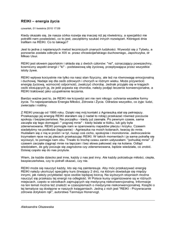 REIKI – energia życia czwartek, 01 kwietnia 2010 17:09 Kiedy okazało się, że nasza córka rozwija się inaczej niż jej rówieśnicy, a specjaliści nie potrafili nam powiedzieć, co to jest, zaczęliśmy szukać innych rozwiązań. Któregoś dnia trafiłam na REIKI. Co to takiego? Jest to jedna z najstarszych metod leczniczych znanych ludzkości. Wywodzi się z Tybetu, a ponownie została odkryta w XIX w. przez chrześcijańskiego duchownego, Japończyka, dr Mikao Usui. REIKI jest słowem japońskim i składa się z dwóch członów: "rei", oznaczający powszechny, kosmiczny aspekt energii i "ki" - podstawową siłę życiową, przepływająca przez wszystkie istoty żywe. REIKI wpływa korzystnie nie tylko na nasz stan fizyczny, ale też na równowagę emocjonalną i duchową. Nadaje się dla osób zdrowych i chorych w różnym wieku. Może przywrócić energię życiową, wzmocnić odporność, zwalczyć chorobę. Jednak przyjęło się w kręgach osób stosujących ją, że jeśli pojawia się choroba, należy podjąć leczenie konwencjonalne, a REIKI traktować jako uzupełnienie leczenia. Bardzo ważne jest to, że REIKI nie krzywdzi ani nie rani nikogo: ochrania wszelkie formy życia. To najwspanialsza Energia Miłości, Zdrowia i Życia. Odradza wszystko, co żyje: ludzi, zwierzęta i rośliny. Z REIKI pracuję od 1995 roku. Dzięki niej mój kontakt z Agnieszką stał się pełniejszy. Przekazując jej energię REIKI starałam się (i nadal to robię) przekazać również poczucie spokoju i bezpieczeństwa. Na początku - kiedy już zasnęła. Po pewnym czasie, sama zaczęła się tego domagać: " pogrzej mnie" - kiedy leżała w łóżku, lub gdy była zdenerwowana. REIKI pomogła nam w opanowaniu napadów płaczu i krzyku. Czasem siadałyśmy na podłodze (tapczanie) - Agnieszka na moich kolanach, twarzą do mnie. Huśtałam się z nią w przód i w tył, nucąc coś cicho, spokojnie i monotonnie. Jednocześnie trzymałam ręce na jej plecach przekazując REIKI. W takich momentach i ja sama potrafię się wyciszyć, to pomaga nam obu. Trwało to trochę czasu zanim usłyszałam: "pohuśtaj mnie". Z czasem zaczęła ciągnąć mnie na tapczan i bez słowa pakować się na kolana. Odtąd wiedziałam, że gdy poczuje się zagrożona czy zdenerwowana, będzie wiedziała, co zrobić. Dzisiaj często się do nas przytula. Wiem, że każde dziecko jest inne, każdy z nas jest inny. Ale każdy potrzebuje miłości, ciepła, bezpieczeństwa, czy to potrafi okazać, czy nie. REIKI może się nauczyć każdy, kto się nią zainteresuje. Aby móc przekazywać energię REIKI należy ukończyć specjalny kurs (trwający 2 dni), na którym dowiaduje się między innymi, jak należy przykładać ręce osobie będącej biorcą. Na wyższych stopniach można nauczyć się przekazu tej energii na odległość. W Polsce kursy organizowane są w różnych miejscach, często w ośrodkach zajmujących się medycyną niekonwencjonalną. Informacje na ten temat można też znaleźć w czasopismach o medycynie niekonwencjonalnej. Książki o tej tematyce są dostępne w naszych księgarniach. Jedną z nich jest "REIKI - Przywracanie zdrowia dotykiem rąk", autorstwa Tanmaya Honervogt. Aleksandra Olszewska