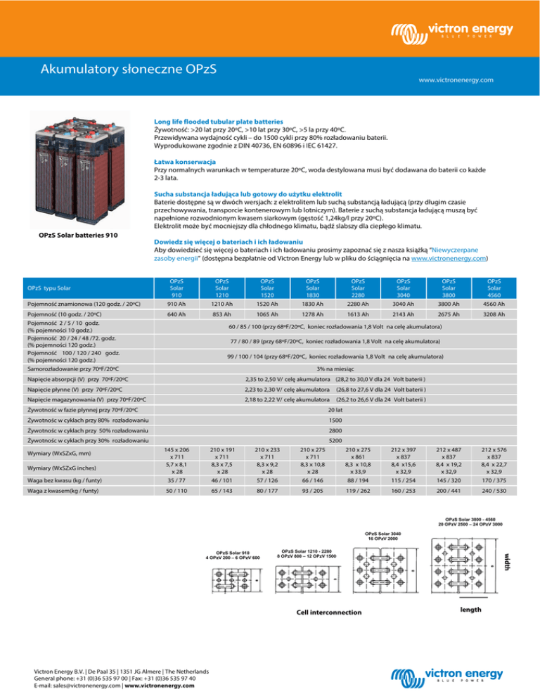 Akumulatory słoneczne OPzS www.victronenergy.com Long life flooded tubular plate batteries Żywotność: >20 lat przy 20ºC, >10 lat przy 30ºC, >5 la przy 40ºC. Przewidywana wydajność cykli – do 1500 cykli przy 80% rozładowaniu baterii. Wyprodukowane zgodnie z DIN 40736, EN 60896 i IEC 61427. Łatwa konserwacja Przy normalnych warunkach w temperaturze 20ºC, woda destylowana musi być dodawana do baterii co każde 2-3 lata. Sucha substancja ładująca lub gotowy do użytku elektrolit Baterie dostępne są w dwóch wersjach: z elektrolitem lub suchą substancją ładującą (przy długim czasie przechowywania, transporcie kontenerowym lub lotniczym). Baterie z suchą substancja ładującą muszą być napełnione rozwodnionym kwasem siarkowym (gęstość 1,24kg/l przy 20ºC). Elektrolit może być mocniejszy dla chłodnego klimatu, bądź slabszy dla ciepłego klimatu. OPzS Solar batteries 910 Dowiedz się więcej o bateriach i ich ładowaniu Aby dowiedzieć się więcej o bateriach i ich ładowaniu prosimy zapoznać się z nasza książką “Niewyczerpane zasoby energii” (dostępna bezpłatnie od Victron Energy lub w pliku do ściągnięcia na www.victronenergy.com) OPzS Solar 910 OPzS Solar 1210 OPzS Solar 1520 OPzS Solar 1830 OPzS Solar 2280 OPzS Solar 3040 OPzS Solar 3800 OPzS Solar 4560 Pojemność znamionowa (120 godz. / 20ºC) 910 Ah 1210 Ah 1520 Ah 1830 Ah 2280 Ah 3040 Ah 3800 Ah 4560 Ah Pojemność (10 godz. / 20ºC) 640 Ah 853 Ah 1065 Ah 1278 Ah 1613 Ah 2143 Ah 2675 Ah 3208 Ah OPzS typu Solar Pojemność 2 / 5 / 10 godz. (% pojemności 10 godz.) Pojemność 20 / 24 / 48 /72. godz. (% pojemności 120 godz.) Pojemność 100 / 120 / 240 godz. (% pojemności 120 godz.) 60 / 85 / 100 (przy 68ºF/20ºC, koniec rozładowania 1,8 Volt na celę akumulatora) 77 / 80 / 89 (przy 68ºF/20ºC, koniec rozładowania 1,8 Volt na celę akumulatora) 99 / 100 / 104 (przy 68ºF/20ºC, koniec rozładowania 1,8 Volt na celę akumulatora) Samorozładowanie przy 70ºF/20ºC 3% na miesiąc Napięcie absorpcji (V) przy 70ºF/20ºC 2,35 to 2,50 V/ celę akumulatora (28,2 to 30,0 V dla 24 Volt baterii ) Napięcie płynne (V) przy 70ºF/20ºC 2,23 to 2,30 V/ celę akumulatora (26,8 to 27,6 V dla 24 Volt baterii ) Napięcie magazynowania (V) przy 70ºF/20ºC 2,18 to 2,22 V/ celę akumulatora (26,2 to 26,6 V dla 24 Volt baterii ) Żywotność w fazie plynnej przy 70ºF/20ºC 20 lat Żywotnośc w cyklach przy 80% rozładowaniu 1500 Żywotnośc w cyklach przy 50% rozładowaniu 2800 Żywotnośc w cyklach przy 30% rozładowaniu 5200 145 x 206 x 711 5,7 x 8,1 x 28 210 x 191 x 711 8,3 x 7,5 x 28 210 x 233 x 711 8,3 x 9,2 x 28 210 x 275 x 711 8,3 x 10,8 x 28 Waga bez kwasu (kg / funty) 35 / 77 46 / 101 57 / 126 Waga z kwasem(kg / funty) 50 / 110 65 / 143 80 / 177 Wymiary (WxSZxG, mm) Wymiary (WxSZxG inches) 210 x 275 x 861 8,3 x 10,8 x 33,9 212 x 397 x 837 8,4 x15,6 x 32,9 212 x 487 x 837 8,4 x 19,2 x 32,9 212 x 576 x 837 8,4 x 22,7 x 32,9 66 / 146 88 / 194 115 / 254 145 / 320 170 / 375 93 / 205 119 / 262 160 / 253 200 / 441 240 / 530 OPzS Solar 3800 - 4560 20 OPzV 2500 – 24 OPzV 3000 OPzS Solar 3040 16 OPzV 2000 OPzS Solar 1210 - 2280 8 OPzV 800 – 12 OPzV 1500 Cell interconnection Victron Energy B.V. | De Paal 35 | 1351 JG Almere | The Netherlands General phone: +31 (0)36 535 97 00 | Fax: +31 (0)36 535 97 40 E-mail: [email protected] | www.victronenergy.com width OPzS Solar 910 4 OPzV 200 – 6 OPzV 600 length