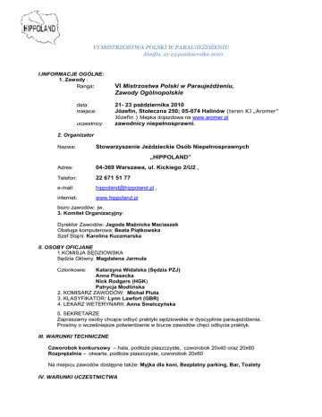 VI MISTRZOSTWA POLSKI W PARAUJEŻDŻENIU Józefin, 21-23 października 2010 I.INFORMACJE OGÓLNE: 1. Zawody : Ranga: VI Mistrzostwa Polski w Paraujeżdżeniu, Zawody Ogólnopolskie data: miejsce: 21- 23 października 2010 Józefin, Stołeczna 250; 05-074 Halinów (teren KJ „Aromer” uczestnicy: Józefin ) Mapka dojazdowa na www.aromer.pl zawodnicy niepełnosprawni. 2. Organizator Nazwa: Stowarzyszenie Jeździeckie Osób Niepełnosprawnych „HIPPOLAND” Adres: 04-369 Warszawa, ul. Kickiego 2/U2 , Telefon: 22 671 51 77 e-mail: [email protected] , internet: www.hippoland.pl biuro zawodów: jw. 3. Komitet Organizacyjny: Dyrektor Zawodów: Jagoda Maźnicka Maciaszek Obsługa komputerowa: Beata Piątkowska Szef Stajni: Karolina Kuczmarska II. OSOBY OFICJANE 1.KOMISJA SĘDZIOWSKA Sędzia Główny. Magdalena Jarmuła Członkowie: Katarzyna Widalska (Sędzia PZJ) Anna Piasecka Nick Rodgers (HGK) Patrycja Modlińska 2. KOMISARZ ZAWODÓW: Michał Pluta 3. KLASYFIKATOR: Lynn Lawfort (GBR) 4. LEKARZ WETERYNARII: Anna Smelczyńska 5. SEKRETARZE Zapraszamy osoby chcące odbyć praktyki sędziowskie w dyscyplinie paraujeżdżenia. Prosimy o wcześniejsze potwierdzenie w biurze zawodów chęci odbycia praktyk. III. WARUNKI TECHNICZNE Czworobok konkursowy – hala, podłoże piaszczyste, czworobok 20x40 oraz 20x60 Rozprężalnia – otwarta, podłoże piaszczyste, czworobok 20x60 Na miejscu zawodów dostępne także: Myjka dla koni, Bezpłatny parking, Bar, Toalety IV. WARUNKI UCZESTNICTWA Zawody zostaną rozegrane zgodnie z aktualnymi przepisami i regulaminami dyscypliny paraujeżdżenia (edycje 2010) oraz pozostałymi przepisami PZJ. W zawodach mogą brać udział zawodnicy niepełnosprawni w wieku od 10 lat, Zawodnicy startują na własnych koniach. Wszystkich obowiązują numery startowe dla koni (do wypożyczenia w biurze zawodów za kaucją) W przypadku dzielenia koni - należy pamiętać o zmianie numeru wraz ze zmianą zawodnika. Minimalny wiek koni: Grupa A – 6 lat, Grupa B – 5 lat Dokumentacja zawodników i koni zgodnie z wymogami dyscypliny. V. ZGŁOSZENIA Zgłoszeń należy dokonywać na specjalnych drukach („zgłoszenie ekipy” oraz „zgłoszenie zawodnika” dostępnych na stronie www.hippoland.pl Termin zgłoszeń ostatecznych upływa 30.09.2010 WPISOWE: 100 zł od zawodnika w całości przeznaczone na nagrody. W przypadku zgłoszeń po terminie wpisowe wzrasta o 50% Opłatę prosimy wpłacać do 10 października 2010 na konto Stowarzyszenia „Hippoland”: BRE BANK 79 1140 1010 0000 5227 9500 1001 : VI. OFEROWANE ŚWIADCZENIA Wszyscy zawodnicy którzy dokonają prawidłowego i terminowego zgłoszenia są ubezpieczani przez organizatora od NNW. Hippoland pokrywa koszty boksów dla koni oraz obiadów dla zawodników, pod warunkiem zaznaczenia odpowiedniej opcji na formularzu zgłoszeniowym oraz dokonania zgłoszenia w terminie. Boksy będą dostępne od 20.października od godziny 18.00. W przypadku przyjazdu wcześniejszego koszt boksu pokrywa zawodnik w wysokości 50 zł za dobę. Obrządek (karmienie, sprzątanie itp.) przez cały czas trwania imprezy we własnym zakresie. Prosimy o zabranie żłobów i wiader dla koni. Hippoland pokrywa częściowo koszty transportu uczestników na zawody. Warunkiem otrzymania dofinansowania jest wypełnienie odpowiednich rubryk w formularzu zgłoszeniowym wraz z podaniem odległości, szacowanych kosztów oraz dostarczenie faktury/rachunku za transport do 5 dniu po zakończeniu zawodów. Wysokość dofinansowania będzie znana dopiero po wpłynięciu wszystkich zgłoszeń. Istnieje możliwość wypożyczenia koni na miejscu. W tym celu niezbędny jest jak najszybszy kontakt z organizatorem. Wypożyczony koń przez cały okres zawodów będzie traktowany jako koń własny zawodnika. Każdy koń może startować w 4 programach dziennie i być dzielony między zawodników z dwóch różnych poziomów (grupa A). Istnieje możliwość pokrycia częściowych kosztów zakwaterowania zawodników. – w tej sprawie niezbędny jak najwcześniejszy kontakt z organizatorem. Najbliższe hotele: AMIGO (4 km) Sulejówek, Trakt Brzeski 100, tel. 22-7831534, www.amigohotel.pl MORFEUSZ (9 km) 05-077 Warszawa - Wesoła, Szosa Lubelska 20, Tel 0-508128892, 0-22 7890699 Gościniec (8 km) 05-077 Warszawa-Wesoła, ul. Trakt Brzeski 90, tel: (022) 773-20-98 tel/fax: (022) 773-30-02, E-mail: [email protected], www.gosciniec.net Bella Vista (7 km), Trakt Brzeski 99, tel. 0-22 7833027 VII. PROGRAM ZAWODÓW Programy paraujeżdżeniowe, obowiązujące podczas zawodów (do pobrania na stronie www.hippoland.pl,) Grupa A ; Międzynarodowy Program Drużynowy (Team Test 2010) oraz Program Dowolny 2010 Grupa B ; Międzynarodowy Program Drużynowy (Team Test 2010). Zawodnicy z Grupy B wykonują go dwukrotnie 22.10 (piątek) oraz 23.10 (sobota). Poziom I a Poziom I b Poziom II Poziom III Poziom IV Międzynarodowy Program Drużynowy 2010 oraz Program Dowolny 2010 Międzynarodowy Program Drużynowy 2010 oraz Program Dowolny 2010 Międzynarodowy Program Drużynowy 2010 oraz Program Dowolny 2010 Międzynarodowy Program Drużynowy 2010 oraz Program Dowolny 2010 Międzynarodowy Program Drużynowy 2010 oraz Program Dowolny 2010 Konkursy poziomu VI rozgrywane będą na czworoboku 20X60 Program ramowy Mistrzostw 21. 10 2010: 9.00 - 20.00 rejestracja ekip, treningi na czworoboku konkursowym 10.00 – 18.00 Klasyfikacja zawodników przez zaproszonego klasyfikatora panią Lynn Lawfort.(GBR) Przy klasyfikacjach asystować będą wybrani uczestnicy kursu dla klasyfikatorów. 22.10.2010 9.00 Przegląd weterynaryjny 10.00 Odprawa Techniczna 11.30 Programy indywidualne Grupa B 15.00 Uroczyste otwarcie zawodów 16.00 Programy indywidualne Grupa A 23.10.2010 9.30 Programy indywidualne Grupa B 12.00 Programy dowolne Grupa A 16.00 Ceremonia Dekoracji Podane godziny mają charakter orientacyjny. Szczegółowy plan zawodów – po zamknięciu zgłoszeń. VIII . NAGRODY Flots , medale i puchary oraz
