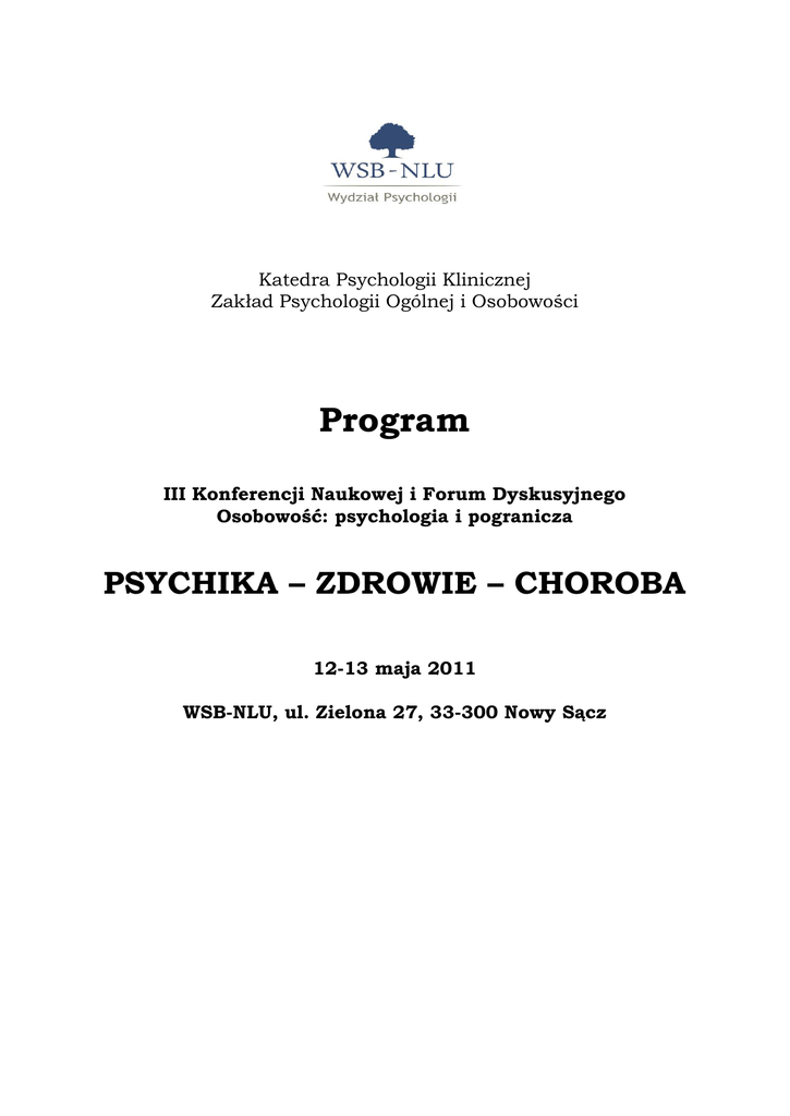Katedra Psychologii Klinicznej Zakład Psychologii Ogólnej i Osobowości Program III Konferencji Naukowej i Forum Dyskusyjnego Osobowość: psychologia i pogranicza PSYCHIKA – ZDROWIE – CHOROBA 12-13 maja 2011 WSB-NLU, ul. Zielona 27, 33-300 Nowy Sącz 12 maja, czwartek 11:30-13:00 rejestracja Uczestniczek i Uczestników – hol budynku C 12:00-13:00 lunch – „Złoty Indeks”, budynek B 13:00-13:30 Otwarcie III Konferencji Naukowej i Forum Dyskusyjnego „Osobowość: psychologia i pogranicza” – sala C010 dr Krzysztof Pawłowski, Rektor WSB-NLU; ks. dr hab. Zenon Uchnast, prof. WSB-NLU, Dziekan Wydziału Psychologii; dr hab. Stanisława Tucholska, prof. WSB-NLU, Honorowa Przewodnicząca III Konferencji Naukowej i Forum Dyskusyjnego „Osobowość: psychologia i pogranicza” 13:30-16:00 SESJA PLENARNA I JEDNOŚĆ PSYCHOSPOŁECZNA Sala C010 Przewodniczący sesji: dr hab. Ryszard Stocki, prof. WSB-NLU 13:30-14:00 Frederic Widlak, Ph. D., prof. WSB-NLU, Individual Identity and Social Identity: Conflict or Confluence? 14:00-14:30 dr hab. Ryszard Stocki, prof. WSB-NLU, Pacjent jako podmiot w instytucjach służby zdrowia: nowe rozwiązania organizacyjne 14:30-15:00 dr hab. Marek Motyka, Grupowy Trening Balintowski jako forma promocji zdrowia psychicznego w zawodach pomocowych 15:00-15:30 dr Barbara Mróz, Rola hierarchii wartości w poczuciu jakości życia u kierowników wyższego szczebla 15:30-16:00 DYSKUSJA 16:00-16:30 przerwa na kawę 16:30-18:30 SESJA PLENARNA II PSYCHIKA: EMOCJONALNOŚĆ Sala C010 Przewodniczący sesji: ks. dr hab. Zenon Uchnast, prof. WSB-NLU 16:30-17:00 dr Urszula Chowaniec, Melancholiczki, histeryczki: o poszukiwaniu języka dla niewypowiadalnego w najnowszej literaturze polskiej 17:00-17:30 dr Izabella Kucharczyk, Inteligencja emocjonalna a sposób radzenia sobie ze stresem matek dzieci niepełnosprawnych 17:30-18:00 dr n. med. Adam Pawlak, Ocena natężenia bólu i stylów radzenia sobie ze stresem w okresie okołooperacyjnym u chorych poddawanych rewaskularyzacji mięśnia sercowego 18:00-18:30 DYSKUSJA 19:30 kolacja – „Biznes Klub”, Nowy Sącz, ul. Grottgera 3 21:00 koncert zespołu Fotel, zwycięzcy tegorocznej edycji FoKuSa (nowosądeckiego Festiwalu Kultury Studenckiej) – „Biznes Klub” 13 maja, piątek 8:00-8:45 śniadanie – „Złoty Indeks”, budynek B 8:45-11:30 8:45-11:30 Sesje i dyskusje tematyczne SESJA I Sala C128 Przewodniczący sesji: dr Michał Grygielski 8:45-9:15 dr Dagmara Musiał, Test Kolorów M. Lüschera w diagnozie rozwoju zdrowia psychicznego w świetle teorii dezintegracji pozytywnej K. Dąbrowskiego 9:15-9:45 mgr Marta Kuty, Patologia i zdrowie psychiczne w psychoanalityczno-egzystencjalnej koncepcji człowieka B. Wyszesławcewa 9:45-10:15 mgr Marta Andrałojć, Rozumienie własnej psychiki a normalny vs zaburzony rozwój osobowości 10:15-10:45 mgr Ewa Kliza, Proces zmiany psychicznej u bezrobotnych kobiet uczestniczących w projekcie „DAFNE – szansa na pracę” 10:45-11:15 mgr Dominka Ochnik, Identyfikacja osób żyjących w pojedynkę z kategorią społeczną singiel 11:15-11:30 DYSKUSJA SESJA II 8:45-11:30 Sala C129 Przewodniczący sesji: dr Andrzej Bulzak 8:45-9:15 Dr Agata Celińska-Miszczuk, mgr Lidia Wiśniewska, Ciało a psyche – perspektywa jakościowa i ilościowa w poznawaniu relacji body-mind 9:15-9:45 dr Agata Woźniak-Krakowian, Uzależnienia behawioralne związane z kultem ciała 9:45-10:15 Małgorzata Kozłowska, Wpływ uszkodzeń mózgu na osobowość 10:15-10:45 mgr Adam Zajączkowski, Schizofrenia – choroba czy niepełnosprawność? Pytanie o możliwości rehabilitacji osób chorych psychicznie. 10:45-11:15 mgr Agata Wons, Psychiczna siła w obliczu choroby przewlekłej 11:15-11:30 DYSKUSJA SESJA III 8:45-11:30 Sala C010 Przewodnicząca sesji: dr hab. Małgorzata Radkiewicz 8:45-9:15 dr hab. Małgorzata Radkiewicz, Psychika i ciało kobiety w teorii oraz filmowych reprezentacjach 9:15-9:45 mgr Ewa Opałka, Poza metaforę - ucieleśniony (kobiecy) podmiot a doświadczenie choroby w filmach „Moje życie beze mnie”, „Życie ukryte w słowach” oraz „Elegia” w reżyserii Isabel Coixet 9:45-11:30 projekcja filmu pt. „Moje życie beze mnie”, reż. Isabel Coixet, 2003 r., produkcja Hiszpania, Kanada. 11:30-12:00 przerwa na kawę 12:00-14:30 SESJA PLENARNA III Sala C010 JEDNOŚĆ PSYCHO-FIZYCZNO-DUCHOWA Przewodnicząca sesji: dr hab. Stanisława Tucholska, prof. WSB-NLU 12:00-12:30 dr Joanna Trzópek, Podmiot i „ja” a neurobiologia. Neurobiologiczne podstawy psychologicznego doświadczenia siebie 12:30-13:00 dr Edyta Nieduziak, Arteterapia jako pomoc w terapii zaburzeń psychosomatycznych 13:00-13:30 dr Andrzej Molenda, Nerwice eklezjogenne – ich etiologia, przebieg, uwagi psychoterapeutów 13:30-14:30 DYSKUSJA PLENARNA 14:30-15:30 obiad – „Złoty Indeks”, budynek B SESJA PLAKATOWA Plakaty będą dostępne na stojakach w holu budynku C w trakcie wszystkich przerw, zachęcamy do ich oglądania i dyskusji z Autorami. dr Marta Brachowicz, Funkcjonowanie psychospołeczne a ocena poznawcza choroby. Badania empiryczne osób niepłodnych. mam nadzieje ze nie ulegnie on zmianie mgr Magdalena Gruza, Jak choruję będąc chorym? O rozumieniu własnego stanu u osób z diagnozą onkologiczną dr Kinga Tucholska, Aktualizacja siebie a charakter dr Kinga Tucholska, dr Anna Tylikowska, Siły i cnoty w filmach dr Anna Tylikowska, Spiralna dynamika rozwoju Organizatorzy zastrzegają sobie możliwość zmian w programie konferencji.