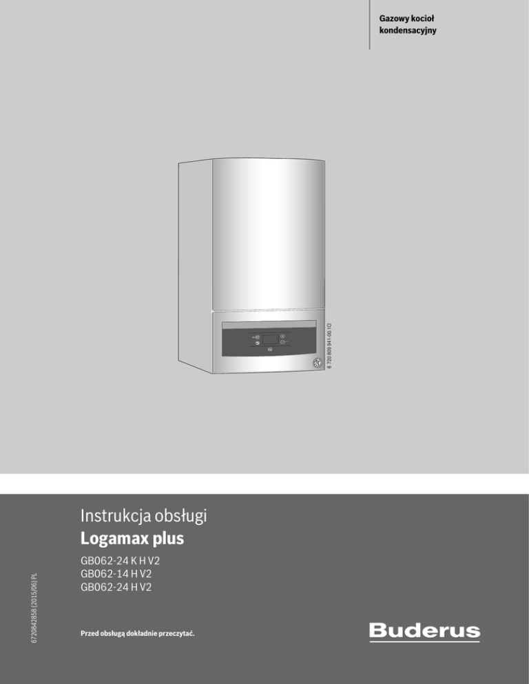 reset press 5s ok mode 6720842858 (2015/06) PL Instrukcja obsługi Logamax plus GB062-24 K H V2 GB062-14 H V2 GB062-24 H V2 Przed obsługą dokładnie przeczytać. 6 720 809 941-00.1O Gazowy kocioł kondensacyjny Spis treści Spis treści 1 Objaśnienie symboli i wskazówki dotyczące bezpieczeństwa . . . . . . . . . . . . . . . . . . . . . . . . . . . . . . . . . . . . . . 2 1.1 1.2 2 Informacje o produkcie . . . . . . . . . . . . . . . . . . . . . . . . . . . . . . . . 3 2.1 2.2 2.3 2.4 3 3.3 .....3 .....3 .....4 .....4 Otwieranie zaworów konserwacyjnych . . . . . . . . . . . . . . 5 Sprawdzenie ciśnienia roboczego instalacji ogrzewczej . . . . . . . . . . . . . . . . . . . . . . . . . . . . . . . . . . . . 5 Uzupełnianie wody grzewczej . . . . . . . . . . . . . . . . . . . . . 5 Obsługa . . . . . . . . . . . . . . . . . . . . . . . . . . . . . . . . . . . . . . . . . . . . . 5 4.1 4.2 4.3 4.4 4.5 4.6 5 Deklaracja zgodności . . . . . . . . . . . . . . . . . . . . . . . Przegląd typoszeregu. . . . . . . . . . . . . . . . . . . . . . . Dane produktu dotyczące zużycia energii. . . . . . . Dane systemowe dotyczące zużycia energii . . . . . Przygotowanie do eksploatacji . . . . . . . . . . . . . . . . . . . . . . . . . 5 3.1 3.2 4 Objaśnienie symboli. . . . . . . . . . . . . . . . . . . . . . . . . . . . . 2 Ogólne zalecenia bezpieczeństwa. . . . . . . . . . . . . . . . . . 2 Przegląd panelu obsługi. . . . . . . . . . . . . . . . . . . . . Włączenie urządzenia . . . . . . . . . . . . . . . . . . . . . . Ustawianie temperatury zasilania . . . . . . . . . . . . . Ustawienie temperatury c.w.u. . . . . . . . . . . . . . . . Regulacja instalacji ogrzewczej . . . . . . . . . . . . . . . Ustawienie trybu letniego . . . . . . . . . . . . . . . . . . . .....6 .....6 .....6 .....6 .....6 .....6 1 Objaśnienie symboli i wskazówki dotyczące bezpieczeństwa 1.1 Objaśnienie symboli Polecenia ostrzegawcze We wskazówkach ostrzegawczych zastosowano hasła ostrzegawcze oznaczające rodzaj i ciężar gatunkowy następstw zaniechania działań zmierzających do uniknięcia niebezpieczeństwa. Zdefiniowane zostały następujące wyrazy ostrzegawcze używane w niniejszym dokumencie: NIEBEZPIECZEŃSTWO: NIEBEZPIECZEŃSTWO oznacza poważne ryzyko wystąpienia obrażeń ciała zagrażających życiu. OSTRZEŻENIE: OSTRZEŻENIE oznacza możliwość wystąpienia ciężkich obrażeń ciała, a nawet zagrożenie życia . OSTROŻNOŚĆ: OSTROŻNOŚĆ oznacza ryzyko wystąpienia obrażeń ciała w stopniu lekkim lub średnim. WSKAZÓWKA: Wyłączenie z eksploatacji. . . . . . . . . . . . . . . . . . . . . . . . . . . . . . 7 WSKAZÓWKA oznacza ryzyko wystąpienia szkód materialnych. 5.1 5.2 5.3 Ważne informacje Wyłączenie/Tryb czuwania . . . . . . . . . . . . . . . . . . . . . . . 7 Ustawienie ochrony przed zamarzaniem . . . . . . . . . . . . 7 Włączanie/wyłączanie przygotowania c.w.u. . . . . . . . . . 7 6 Dezynfekcja termiczna . . . . . . . . . . . . . . . . . . . . . . . . . . . . . . . . 7 7 Wskazówki dotyczące oszczędzania energii . . . . . . . . . . . . . . 7 8 Usuwanie usterek. . . . . . . . . . . . . . . . . . . . . . . . . . . . . . . . . . . . . 8 9 Konserwacja . . . . . . . . . . . . . . . . . . . . . . . . . . . . . . . . . . . . . . . . . 8 Ważne informacje, które nie zawierają ostrzeżeń przed zagrożeniami dotyczącymi osób lub mienia, oznaczono symbolem informacji przedstawionym obok. Inne symbole 10 Ochrona środowiska i utylizacja . . . . . . . . . . . . . . . . . . . . . . . . 8 11 Pojęcia specjalistyczne . . . . . . . . . . . . . . . . . . . . . . . . . . . . . . . . 9 Symbol ▶ • – Znaczenie Czynność Odsyłacz do innych fragmentów dokumentu Pozycja/wpis na liście Pozycja/wpis na liście (2. poziom) Tab. 1 1.2 Ogólne zalecenia bezpieczeństwa HWskazówki dla grupy docelowej Niniejsza instrukcja obsługi jest skierowana do użytkownika instalacji ogrzewczej. Należy przestrzegać wskazówek zawartych we wszystkich instrukcjach. Ignorowanie tych wskazówek grozi szkodami materialnymi i urazami cielesnymi ze śmiercią włącznie. ▶ Przed obsługą należy przeczytać instrukcje obsługi (źródeł ciepła, regulatorów ogrzewania itp.) i zachować je. ▶ Postępować zgodnie ze wskazówkami dotyczącymi bezpieczeństwa oraz ostrzegawczymi. HZastosowanie zgodne z przeznaczeniem Produktu wolno używać tylko do podgrzewania wody grzewczej i przygotowania c.w.u. 2 Logamax plus – 6720842858 (2015/06) Informacje o produkcie Jakiekolwiek inne użytkowanie uważane jest za niezgodne z przeznaczeniem. Szkody powstałe w wyniku takiego stosowania są wyłączone z odpowiedzialności producenta. HPostępowanie w razie stwierdzenia zapachu gazu W przypadku ulatniania się gazu występuje niebezpieczeństwo wybuchu. W razie stwierdzenia zapachu gazu przestrzegać poniższych zasad postępowania. ▶ Nie dopuszczać do powstawania płomieni i iskier: – Nie palić, nie używać zapalniczek ani zapałek. – Nie obsługiwać wyłączników elektrycznych, nie wyciągać wtyczek. – Nie używać telefonu ani dzwonka. ▶ Zamknąć dopływ gazu na głównym zaworze odcinającym lub na liczniku gazu. ▶ Otworzyć okna i drzwi. ▶ Ostrzec wszystkich mieszkańców i opuścić budynek. ▶ Zapobiec wchodzeniu do budynku osób trzecich. ▶ Wezwać straż pożarną, policję i pogotowie gazowe, korzystając z telefonu znajdującego się poza budynkiem. HNiebezpieczeństwo utraty życia wskutek zaczadzenia spalinami W przypadku ulatniania się spalin występuje zagrożenie dla życia. W razie uszkodzenia lub nieszczelności przewodów spalinowych albo stwierdzenia zapachu spalin przestrzegać poniższych zasad postępowania. ▶ Odłączyć źródła ciepła. ▶ Otworzyć okna i drzwi. ▶ W razie potrzeby ostrzec wszystkich mieszkańców i opuścić budynek. ▶ Zapobiec wchodzeniu do budynku osób trzecich. ▶ Zawiadomić uprawnioną firmę instalacyjną. ▶ Zlec
