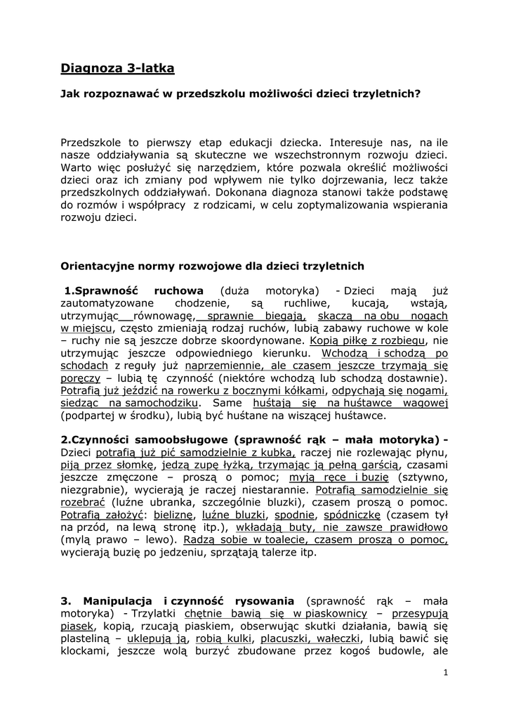 Diagnoza 3-latka Jak rozpoznawać w przedszkolu możliwości dzieci trzyletnich? Przedszkole to pierwszy etap edukacji dziecka. Interesuje nas, na ile nasze oddziaływania są skuteczne we wszechstronnym rozwoju dzieci. Warto więc posłużyć się narzędziem, które pozwala określić możliwości dzieci oraz ich zmiany pod wpływem nie tylko dojrzewania, lecz także przedszkolnych oddziaływań. Dokonana diagnoza stanowi także podstawę do rozmów i współpracy z rodzicami, w celu zoptymalizowania wspierania rozwoju dzieci. Orientacyjne normy rozwojowe dla dzieci trzyletnich 1.Sprawność ruchowa (duża motoryka) - Dzieci mają już zautomatyzowane chodzenie, są ruchliwe, kucają, wstają, utrzymując równowagę, sprawnie biegają, skaczą na obu nogach w miejscu, często zmieniają rodzaj ruchów, lubią zabawy ruchowe w kole – ruchy nie są jeszcze dobrze skoordynowane. Kopią piłkę z rozbiegu, nie utrzymując jeszcze odpowiedniego kierunku. Wchodzą i schodzą po schodach z reguły już naprzemiennie, ale czasem jeszcze trzymają się poręczy – lubią tę czynność (niektóre wchodzą lub schodzą dostawnie). Potrafią już jeździć na rowerku z bocznymi kółkami, odpychają się nogami, siedząc na samochodziku. Same huśtają się na huśtawce wagowej (podpartej w środku), lubią być huśtane na wiszącej huśtawce. 2.Czynności samoobsługowe (sprawność rąk – mała motoryka) Dzieci potrafią już pić samodzielnie z kubka, raczej nie rozlewając płynu, piją przez słomkę, jedzą zupę łyżką, trzymając ją pełną garścią, czasami jeszcze zmęczone – proszą o pomoc; myją ręce i buzię (sztywno, niezgrabnie), wycierają je raczej niestarannie. Potrafią samodzielnie się rozebrać (luźne ubranka, szczególnie bluzki), czasem proszą o pomoc. Potrafią założyć: bieliznę, luźne bluzki, spodnie, spódniczkę (czasem tył na przód, na lewą stronę itp.), wkładają buty, nie zawsze prawidłowo (mylą prawo – lewo). Radzą sobie w toalecie, czasem proszą o pomoc, wycierają buzię po jedzeniu, sprzątają talerze itp. 3. Manipulacja i czynność rysowania (sprawność rąk – mała motoryka) - Trzylatki chętnie bawią się w piaskownicy – przesypują piasek, kopią, rzucają piaskiem, obserwując skutki działania, bawią się plasteliną – uklepują ją, robią kulki, placuszki, wałeczki, lubią bawić się klockami, jeszcze wolą burzyć zbudowane przez kogoś budowle, ale 1 potrafią ułożyć wieżę z około10–12 klocków (drewnianych lub plastikowych), potrafią zbudować most wg wzoru (patrzą, jak ktoś buduje lub budują, patrząc na gotowy most z 3 klocków). Dzieci trzymają jeszcze ołówek, kredki pełną garścią, chętnie bazgrzą, rysują linie pionowe, poziome, potrafią narysować wg pokazanego wzoru koło (może być krzywe, nie do końca domknięte, ale narysowane jedną linią), krzyżyk. Zachęcane do kolorowania zwykle kolorują obrazki jedną kredką, niezgrabnie, wychodząc poza kontury, szybko męczą się. 4. Spostrzeganie wzrokowe - Dzieci chętnie i w skupieniu oglądają obrazki w książce, mówią o nich; potrafią rozpoznać wg wzoru figury lub klocki: koło, kwadrat, trójkąt, romb (popatrz na różne klocki i podaj mi taki sam, jak ten – trzymany w ręce); potrafią złożyć w całość obrazek rozcięty na 4 równe części; patrząc na obrazek potrafią go opisać, wymieniając 5–10 elementów (popatrz na obrazek i opowiedz o nim, powiedz, co obrazek przedstawia). Dzieci w tym wieku potrafią spostrzec i wskazać 6 do 8 różnic między podobnymi obrazkami; patrząc na układane przez nas wzory potrafią ułożyć z patyczków wg wzoru takie same (domek ze spadzistym dachem, dwa trójkąty przylegające do siebie podstawami, a trzeci miedzy nimi podstawą do góry, romb). Są spostrzegawcze, mówią, co zauważyły, komentują to, są ciekawe. 5. Spostrzeganie słuchowe (funkcje słuchowo-językowe) - Dzieci słuchają poleceń, wskazówek, informacji – rozumieją je. Potrafią uważnie słuchać przez 5–10 minut (zależnie od sytuacji i zmęczenia dzieci) opowiadań, czytanej książeczki; potrafią powiedzieć, o czym lub o kim było opowiadanie i co się wydarzyło, rozumieją używane słowa i w opowiadaniu powtarzają je. Trzylatki potrafią chodzić w rytm śpiewanej piosenki lub melodii (zabawy w kole), uderzając rączką lub pałeczką w stół, odtwarzają także proste rytmy, które my wystukamy. Dzieci potrafią także, po ćwiczeniach, podzielić zdanie na wyrazy (Posłuchajcie, powiem Wam krótką bajkę o kotku: kotek pije mleko, a teraz tę bajkę podzielę na kawałki, na słowa: kotek – pije – mleko. Wyklaszczemy to razem, jeszcze raz i jeszcze raz. A teraz posłuchajcie (posłuchaj) innej bajki, o piesku: piesek macha ogonem. Podziel tę bajkę na kawałki, na słowa i zaklaszcz. A inna bajka – mała krówka szuka mamy, albo latem mocno świeci słonko itp.). Potrafią także, po ćwiczeniach, podzielić wyraz na sylaby (posłuchaj, takie piękne słowo: mama, podzielę na takie kawałki, jak otwiera mi się buzia: ma – ma, daj rączki, razem będziemy klaskać: ma – ma, dobrze. A teraz inne słowo- posłuchaj i też klaszcz dzieląc to słowo na kawałki, tak, jak otwiera się buzia: piłka, okno, stolik, kotek itd.). Dzieci dość szybko uczą się krótkich wierszyków ( 4 do 8 powtórzeń) i powtarzają je, utrzymując rymy i rytm. 2 6. Mowa (funkcje słuchowo-językowe) - Wśród dzieci trzyletnich zachodzą duże różnice w zakresie rozwoju mowy – niektóre z nich mówią zrozumiale, swobodnie i dużo, inne zaś dopiero zaczynają mówić. Te ostatnie dość szybko wyrównują opóźnienia, m.in. dzięki naśladowaniu innych dzieci. Poniżej podaję normy rozwoju mowy typowe dla przeciętnie rozwiniętych dzieci trzyletnich. Wszystkie dzieci mówią jeszcze niezbyt wyraźnie (tzw. mowa dziecięca), ale mają do tego prawo i w trakcie dalszego rozw