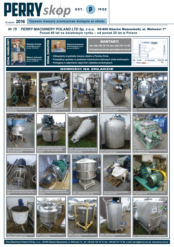 Grudzień Sebastian Grzybek [email protected] tel. kom. 512 369 724 Mateusz Jankowski [email protected] tel. kom. 512 369 721 DZIAŁ ZAKUPÓW DZIAŁ HANDLOWY Nr 79 Wojciech Kuśmierski [email protected] tel. kom. 512 369 725 KONTAKT: tel. (22) 722 32 70, fax: (22) 721 13 48 www.perry.com.pl, [email protected] • Odkupujemy za gotówkę maszyny zbędne w Państwa firmie. • Prowadzimy sprzedaż na podstawie indywidualnie dobranych umów komisowych. • Pomagamy w upłynnieniu całych linii i zakładów produkcyjnych. NOWOŚCI NA SKŁADZIE U2215-1 - Mieszalnik homogenizujący BROGTEC MH 125. Pojemność robocza 125 l. Zakres ciśnień -1/2 bar. Temperatura do 160C. L1229-01 – Wibracyjna Mieszalnik planetarny MOLTENI typ I 600 wraz z kadzią. Części kontaktowe ze stali ko. Kadź 600 l, płaszcz grzewczy. Napęd 22 kW. U802V-1 – Mieszadło homogenizujące ze stali ko. Stator o średnicy 350 mm, rotor o średnicy 330 mm. Napęd o mocy 30 kW. U2210-1 - Pionowy zbiornik mieszający 300 l. Mieszadło propellerowe, napedzane silnikiem 1.5 kW. U2215-2 – Laboratoryjny młynek odśrodkowy RETSCH ZM 200 wyposażony w podajnik wibracyjny. L1229-03 – Pionowy mieszalnik ze stali ko do gestych cieczy LUMPP. Całkowita pojemność 2000 l. Płaszcz grzewczy. Mieszadło ramowe – napęd 11 kW. Mieszadło dyskowe – napęd 45 kW. U2214 – Młyn klasyfikujący NEA GROUP typ ICM 2.4-75/158 CX. Wydajność do 40 kg/godz. L1229-04 – Pionowy mieszalnik stożkowy NAUTAMIX do substancji sypkich. Pojemność robocza 1500 l. Posiada wężownicę grzewczo/chlodzacą. U802V-2 – Nieużywana pompa wirnikowa HILGE typ HYGIA SUPER II 70 B. Wydajność do 108 m3/godz, wysokość podnoszenia do 70 m. U2208-1 – Pionowy zbiornik magazynowy o pojemnosci 500 l. Dwie sztuki dostępne. U2203-1 – Jednopokładowe sito wibracyjne TERAZZINI. Średnica 1150 mm. Napęd silnikiem 1.2 kW. U2204-2 - Pionowy zbiornik magazynowy o pojemności 500 l. Dwie sztuki dostępne. U2212-2 – Homogenizator tłokowy RANNIE LAB 18.51H. Wydajnosc do 500 l/godz. Ciśnienie 345 bar. Dwustopniowa homogenizacja. U2208-5 – Pionowy zbiornik mieszajacy z plaszczem. Pojemność robocza 3000 l. Mieszadło łopatowe. U2203-2 –Sito cylindryczne/przesiewacz SIM BIANCA. Części kontaktowe ze stali ko. U2205-2 – Pionowy zbiornik magazynowy o całkowitej pojemności 1050 l. Dno skośne. U2205-1 –suszarnia fluidalna do pracy ciągłej VENTILEX typ FBD/C 2.0/1.0. U804V – Mieszalnik typu „zet” do mas gęstych/ mixtruder, poj 100 l. Płaszcz grzewczy. Rozładunek przez ślimak. U2206 – Młyn typu "turbo" MLYNPOL. Tarcza mieląca o średnicy 250 mm. Napęd silnikiem 7.5 kW U2211 – Pionowy zbiornik magazynowy o roboczej pojemności 1000 l. Perry Machinery Poland LTD Sp. z o.o. - 05-850 Ożarów Mazowiecki, ul. Wolności 1a - tel: +48 (22) 722 32 70, fax: +48 (22) 721 13 48; e-mail: [email protected], www.perry.com.pl REAKTORY CHEMICZNE I MIESZALNIKI CIECZY Numer urządzenia: Opis urządzenia: U2200-2 Reaktor laboratoryjny RENATO BRIGNOLE SRL. Poj. 3 l. Wykonanie ze stopu NIKIEL 200. Ciśnienie robocze: 50 bar/ 350C. Mieszadło kotwicowe. U2196-9 Reaktor emaliowany THALE. Poj. 470 l. Zakres ciśnień od -0.8 /10 bar. Temperatura do 200C. Mieszadło kotwicowe. U2195 Zbiornik mieszający PROFARB. Poj. 500 l. Mieszadło turbninowe. Grzanie elektryczne. U2196-7 Reaktor emaliowany THALE. Poj. 980 l. Zakres ciśnień od -0.8 /10 bar. Temperatura do 200C. Mieszadło kotwicowe. 2 szt dostepne. Reaktor kwasoodporny JEDINSTWO. Poj. 2000 l. Ciśnienie do 6 bar. Temperatura do 200C. Mieszadło kotwicowe. U2196-6 U2167-1 - Mieszalnik kosmetyczny OLSA ze stali ko (AISI 316). Poj. robocza 750l. U2199-5 - Zbiornik mieszający z płaszczem TERLET. Poj. 1000 l. Mieszadło wstęgowo-ślimakowe. Brak napędu. U2157-11 – Reaktor ze stali ko. JEDINSTWO. Pojemność 3200l. Mieszadło kotwicowe. U2201-5- Zbiornik mieszający z płaszczem CMG INOX. Poj. 4300 l. Części kontaktowe ze stali ko. Mieszadło kotwicowo-ramowe. Napęd 7.5 kW. 2 szt dostępne. URZĄDZENIA DO FILTRACJI I SEPARACJI Numer urządzenia: Opis urządzenia: 20479-2 Wirówka dekantacyjna FLOTTWEG typ Z4D-3/409. Napęd 30 kW. U2157-9 Wirówka koszowa LAMPART , model ALTA 10R. Bąk o średnicy 1000 mm. 2 szt dostępne. U2074 Wirówka talerzowa WSK KRAKOW UVPX 207. Napęd 7.5 kW. Wydajność do 1500 l/godz. U2054-1 Wirówka talerzowa WESTFALIA typ HSA 200. Robocza wydajność do 60000 l/godz. U2157-1 Wirówka koszowa SANGERHAUSEN, model FZPO 1000C. Bąk o średnicy 1000 mm. U2196-5 – Pozioma wirówka koszowa ESCHER WYSS model HS700 PLkEx. Typ "peeler". Bąk o średnicy 700 mm, wsad do 50 kg. Wykonanie Ex U2137-1 – Wirówka dekantacyjna HYSEP model MD43C. Napęd o mocy 12.5 kW. U2200-8 - Filtr ciśnieniowy ze stali ko VESSEL SRL. Powierzchnia filtracji 1.4 m2. Robocze ciśnienie do 5 bar. U2200-1 - Zestaw filtrów pyłowych WAM. Powierzchnia filtracji: Filtr kartridżowy – 22 m2. Filtr workowy - 21 m2. Wykonanie Ex. U2189 - Młyn młotkowy typ OMT4. Napęd 45 kW U2197 - Młyn palcowy MŁYNPOL. Tarcze mielące o średnicy 330 mm ze stali ko. MŁYNY I ROZDRABNIACZE Numer urządzenia: Opis urządzenia: U2198 Młyn dwuwałowy (szreder). Wykonanie części kontaktowych ze stali ko. Napęd 3 kW. U2194-1 Młyn palcowy typ REKORD rozmiar C. Napęd 15 kW. U2149-8 Młyn młotkowy ze stali węglowej. Napęd 11 kW, 24 ruchome bijaki. U2207 Jednowałowy młyn rozcierający STRECKEL & SCHRADER KG. Napęd 11 kW. U2186 Młynek palcowy MUT model 160 ze stali ko. Napęd 4 kW. U2199-4 - Rozdrabniacz dwuwałowy (szreder) LINCO. Napęd 2 x 4 Kw U2200-3 - Młyn uniwersalny DAGNONI MILANO. Rotor o średnicy 440 mm. Napęd 15 kW, Wykonanie Ex. URZĄDZENIA DO OBRÓBKI SUBSTANCJI SYPKICH Numer urządzenia: Opis urządzenia: U2194-2 Mieszalnik wstęgowy W&P. Poj. robocza 350l. Części kontaktowe stal ko. Płaszcz grzewczy. U2188-3 Nieużywany przenośnik ślimakowy typ "U". Szer. 26 cm x dł. 650 cm. Wyłożony 