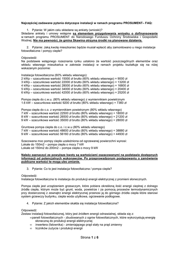 Najczęściej zadawane pytania dotyczące instalacji w ramach programu PROSUMENT– FAQ: 1. Pytanie: W jakim celu składane są ankiety (wnioski)? Składane ankiety i umowy wstępne są elementem przygotowania wniosku o dofinansowanie w ramach programu PROSUMENT do Narodowego Funduszu Ochrony Środowiska i Gospodarki Wodnej. Nie ma pewności, że gmina Skawina otrzyma środki na planowane działania. 2. Pytanie: Jaką kwotę mieszkaniec będzie musiał wpłacić aby zamontowano u niego instalacje fotowoltaiczne / pompy ciepła? Odpowiedź: Na podstawie wstępnego rozeznania rynku ustalono że wartość poszczególnych elementów oraz wkładu własnego mieszkańca w zakresie instalacji w ramach projektu kształtuje się na niżej wskazanym poziomie: Instalacja fotowoltaiczna (60% wkładu własnego): 2 kWp – szacunkowa wartość 15000 zł brutto (60% wkładu własnego) = 9000 zł 3 kWp – szacunkowa wartość 22000 zł brutto (60% wkładu własnego) = 13200 zł 4 kWp – szacunkowa wartość 28000 zł brutto (60% wkładu własnego) = 16800 zł 5 kWp – szacunkowa wartość 34000 zł brutto (60% wkładu własnego) = 20400 zł 6 kWp – szacunkowa wartość 42000 zł brutto (60% wkładu własnego) = 25200 zł Pompa ciepła do c.w.u. (80% wkładu własnego) z wymiennikiem powietrznym 1.6 kW – szacunkowa wartość 9200 zł brutto (80% wkładu własnego) = 7360 zł Pompa ciepła do c.o. z wymiennikiem powietrznym (80% wkładu własnego) 7 kW – szacunkowa wartość 22500 zł brutto (80% wkładu własnego) = 18000 zł 8 kW – szacunkowa wartość 26500 zł brutto (80% wkładu własnego) = 21200 zł 9 kW – szacunkowa wartość 35000 zł brutto (80% wkładu własnego) = 28000 zł Gruntowa pompa ciepła do c.o. i c.w.u (80% wkładu własnego) 7 kW – szacunkowa wartość 48600 zł brutto (80% wkładu własnego) = 38880 zł 9 kW – szacunkowa wartość 56160 zł brutto (80% wkładu własnego) = 44930 zł Szacowana moc pompy ciepła uzależniona od ogrzewanej powierzchni wynosi: Lokale do 150m2 – pompa ciepła o mocy 7 kW Lokale od 150m2 do 200m2 – pompa ciepła o mocy 9 kW Należy zaznaczyć ze powyższe kwoty są wartościami oszacowanymi na podstawie dostępnych informacji od potencjalnych wykonawców. Po przeprowadzonym postępowaniu o zamówienie publiczne wartości te mogą ulec zmianie. 3. Pytanie: Co to jest instalacja fotowoltaiczna / pompa ciepła? Odpowiedź: Instalacja fotowoltaiczna to instalacja do produkcji energii elektrycznej z promieni słonecznych. Pompa ciepła jest urządzeniem grzewczym, które pobiera określoną ilość energii cieplnej z dolnego źródła ciepła, którym może być grunt, woda, powietrze i za pomocą procesów termodynamicznych przy dostarczonej z zewnątrz energii elektrycznej przenosi ją do górnego źródła ciepła które stanowi system grzewczy budynku, ciepła woda użytkowa, ogrzewanie podłogowe. 4. Pytanie: Z jakich elementów skałda się instalacja fotowoltaiczna? Odpowiedź: Zestaw instalacji fotowoltaicznej, który jest źródłem energii odnawialnej, składa się z: • paneli fotowoltaicznych - zbudowanych z ogniw fotowoltaicznych, które wykorzystują energię słoneczną do produkcji energii elektrycznej • inwertera (falownika) - zmieniającego prąd stały na prąd zmienny • liczników zużycia i produkcji energii Strona 1 z 6 • okablowania. Połączenie tych elementów ma zapewnić ciągłość przesyłu energii elektrycznej. 5. Pytanie: Jak wygląda serwis instalacji fotowoltaicznych? Odpowiedź: Instalacje fotowoltaiczne uchodzą za mało awaryjne i bezobsługowe. Gwarancja producenta na efektywność prądotwórczą systemów wynosi nawet około 25 lat. Instalacja fotowoltaiczna nie wymaga stałej, ani cyklicznej konserwacji. Podobnie jak każde inne urządzenie elektryczne warto sprawdzić inwerter i akumulatory raz na kilka lat. Raczej nie powinny one wymagać interwencji użytkownika. Same panele nie wymagają konserwacji wcale. 6. Pytanie: Dlaczego zalecane jest dopasowanie instalacji fotowoltaicznej do istniejącego zapotrzebowania na energię elektryczną? Odpowiedź: Należy zaznaczyć, że najszybszy zwrot kosztów inwestycji następuje w przypadku gdy instalacja pozwala na zaspokojenie potrzeb mieszkańców. Wynika to z faktu, że nadmiar energii wynikający z rozliczenia z zakładem energetycznym na podstawie net meteringu od 2016r. będzie kupowany po cenie 100% średniej ceny sprzedaży energii elektrycznej na rynku konkurencyjnym w poprzednim kwartale (około 0,18 zł za 1 kWh) 7. Pytanie: Czy w przypadku gdy mam zamontowane solary dofinansowanych w ramach programu szwajcarskiego mogę otrzymać dofinansowanie na instalacje fotowoltaiczna i pompy ciepła? Odpowiedź: Tak. 8. Pytanie: Co to jest net metering? Odpowiedź: W ramach programu PROSUMENT z zakładem energetycznym będzie należało się rozliczać na podstawie tzw. net meteringu. Zgodnie z nim, energia elektryczna wytwarzana we własnej instalacji i dostarczana do lokalnej sieci dystrybucyjnej rozliczana jest poprzez odejmowanie jej od ilości zużytej energii z sieci elektroenergetycznej (na podstawie zainstalowanego licznika dwukierunkowego). Idea net meteringu polega na rozliczaniu się za energię w systemie kWh za kWh – w Polsce w okresie półrocznym. Z instalacji fotowoltaicznych można pozyskać więcej energii elektrycznej aniżeli w danym momencie będzie się jej zużywało. W takim przypadku nadmiar energii będzie odprowadzany do istniejącej sieci energetycznej zakładu energetycznego. Należy pamiętać, że w ramach poboru energii zakład energetyczny zawsze naliczy nam stałe opłaty abonamentowe oraz opłaty za przesył energii. 9. Ile wynosi okres zwrotu inwestycji w przypadku instalacji fotowoltaicznej / pompy ciepła? Odpowiedź: Dla oszacowania okresu zwrotu inwestycji w instalację fotowoltaiczną polecamy kalkulator umieszczony na stronie internetowej TAURON S.A. - opcja: Mikroinstalacja finansowana kredytem z dotac
