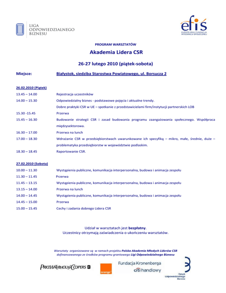 PROGRAM WARSZTATÓW Akademia Lidera CSR 26-27 lutego 2010 (piątek-sobota) Miejsce: Białystok, siedziba Starostwa Powiatowego, ul. Borsucza 2 26.02.2010 (Piątek) 13.45 – 14.00 14.00 – 15.30 Rejestracja uczestników Odpowiedzialny biznes ‐ podstawowe pojęcia i aktualne trendy. Dobre praktyki CSR w UE – spotkanie z przedstawicielami firm/instytucji partnerskich LOB 15.30 ‐15.45 15.45 – 16.30 Przerwa Budowanie strategii CSR i zasad budowania programu zaangażowania społecznego. Współpraca międzysektorowa. 16.30 – 17.00 17.00 – 18.30 Przerwa na lunch Wdrażanie CSR w przedsiębiorstwach uwarunkowane ich specyfiką – mikro, małe, średnie, duże – problematyka przedsiębiorstw w województwie podlaskim. 18.30 – 18.45 Raportowanie CSR. 27.02.2010 (Sobota) 10.00 – 11.30 Wystąpienia publiczne, komunikacja interpersonalna, budowa i animacja zespołu 11.30 – 11.45 Przerwa 11.45 – 13.15 Wystąpienia publiczne, komunikacja interpersonalna, budowa i animacja zespołu 13.15 – 14.00 Przerwa na lunch 14.00 – 14.45 Wystąpienia publiczne, komunikacja interpersonalna, budowa i animacja zespołu 14.45 – 15.00 Przerwa 15.00 – 15.45 Cechy i zadania dobrego Lidera CSR Udział w warsztatach jest bezpłatny. Uczestnicy otrzymają zaświadczenia o ukończeniu warsztatów. Warsztaty organizowane są w ramach projektu Polska Akademia Młodych Liderów CSR dofinansowanego ze środków programu grantowego Ligi Odpowiedzialnego Biznesu