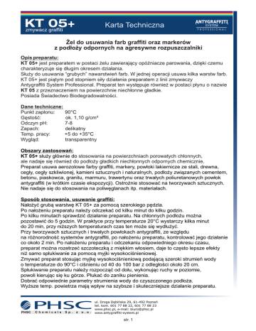 Żel do usuwania farb graffiti oraz markerów z podłoży odpornych na agresywne rozpuszczalniki Opis preparatu: KT 05+ jest preparatem w postaci żelu zawierający opóźniacze parowania, dzięki czemu charakteryzuje się długim okresem działania. Służy do usuwania “grubych” nawarstwień farb. W jednej operacji usuwa kilka warstw farb. KT 05+ jest piątym pod stopniem siły działania preparatem z linii zmywaczy Antygraffiti System Professional. Preparat ten występuje również w postaci płynu o nazwie KT 05 z przeznaczeniem na powierzchnie niechłonne gładkie. Posiada Świadectwo Biodegradowalności. Dane techniczne: Punkt zapłonu: 90°C Gęstość: ok. 1,10 g/cm³ Odczyn pH: 7-8 Zapach: delikatny Temp. pracy: +5 do +35°C Wygląd: transparentny Obszary zastosowań: KT 05+ służy głównie do stosowania na powierzchniach porowatych chłonnych, ale nadaje się również do podłoży gładkich niechłonnych odpornych chemicznie. Preparat usuwa aerozolowe farby graffiti, markery, powłoki lakiernicze ze stali, drewna, cegły, cegły szkliwionej, kamieni sztucznych i naturalnych, podłoży związanych cementem, betonu, piaskowca, granitu, marmuru, trawertynu oraz trwałych poliuretanowych powłok antygraffiti (w krótkim czasie ekspozycji). Ostrożnie stosować na tworzywach sztucznych. Nie nadaje się do stosowania na poliwęglanach itp. materiałach. Sposób stosowania, usuwanie graffiti: Nałożyć grubą warstwę KT 05+ za pomocą szerokiego pędzla. Po nałożeniu preparatu należy odczekać od kilku minut do kilku godzin. Po kilku minutach sprawdzić działanie preparatu. Na chłonnych podłożu można pozostawić do 5 godzin. W praktyce przy temperaturze 20°C wystarczy kilka minut do 20 min, przy niższych temperaturach czas ten może się wydłużyć. Przy tworzywach sztucznych i trwałych powłokach antygraffiti, ze względu na różnorodność systemów antygraffiti, po nałożeniu preparatu, kontrolować jego działanie co około 2 min. Po nałożeniu preparatu i odczekaniu odpowiedniego okresu czasu, preparat można rozetrzeć szczoteczką z miękkim włosiem, daje to często lepsze efekty niż samo spłukiwanie za pomocą myjki wysokociśnieniowej. Zmywać preparat stosując myjkę wysokociśnieniową podającą szeroki strumień wody o temperaturze do 90°C i ciśnieniu od 40 do 100 bar z odległości około 20 cm. Spłukiwanie preparatu należy rozpocząć od dołu, wykonując ruchy w poziomie, powoli kierując się ku górze. Płukać do zaniku pienienia. Dobrać odpowiednie parametry strumienia wody do czyszczonego podłoża. Wyższe temp. powietrza mają wpływ na szybsze i skuteczniejsze działanie preparatu. ul. Droga Dębińska 29, 61-492 Poznań tel. kom. 601 77 88 22, 601 77 88 23 www.phsc.pl, e-mail: [email protected] www.antygraffiti-system.pl str. 1 Powinno się zawsze wykonać próbę dla określenia czasu działania preparatu, a w szczególności w przypadku nieznanych materiałów sprawdzić reakcję preparatu z podłożem. Skuteczność działania preparatu zależy od podłoża, grubości warstw, rodzaju farby, okresu “istnienia” danej farby na powierzchni podłoża oraz od temp. otoczenia. W razie trudności całą operacje powtórzyć. Używać jako koncentrat. Czas kontaktu preparatu z czyszczoną powierzchnią ograniczyć do minimum. Uwaga nie usunięte w porę zacieki mogą spowodować, trudne do usunięcia ślady. Wydajność: Minimalna: 3,3 m² / L, (0,3 L /m²) Maksymalna: 10 m² / L, (0,1 L /m²) Opakowania: Tworzywo sztuczne: 1 kg, 5 kg, 10 kg, 20 kg. Przechowywanie: W temperaturze + 5 do + 25°C. Nie wystawiać na działanie promieni słonecznych. Trwałość: 12 miesięcy w zamkniętym oryginalnym opakowaniu. Uwagi dotyczące zagrożeń i bezpieczeństwa: Zwracać uwagę na otoczenie i stosować się do zasad pracy z chemikaliami. Podczas pracy nosić rękawice z butylu, okulary i ubranie ochronne, ochrony dróg oddechowych. Preparat trzymać z dala od dzieci. Oznakowanie: Niebezpieczeństwo. Działa drażniąco na skórę. Działa szkodliwie po połknięciu. Powoduje poważne uszkodzenie oczu. Może wywoływać uczucie senności lub zawroty głowy. ADR/RID: preparat nie klasyfikowany jako niebezpieczny Dalsze informację: Informację na temat bezpieczeństwa podczas transportu, składowania i stosowania oraz na temat usuwania i ochrony środowiska znajdują się w Karcie Charakterystyki preparatu. Powyższe informacje zostały sporządzone w naszym dziale produkcji według naszego stanu wiedzy i techniki stosowania, ponieważ rodzaje zastosowań i sposób użycia są poza naszą kontrolą, z treści tej instrukcji nie wynika żadna odpowiedzialność producenta. Z uwagi na rozliczne czynniki występujące przy stosowaniu produktu, użytkownik nie powinien odstępować od przeprowadzenia prób oraz na własną odpowiedzialność winien przestrzegać obowiązujące przepisy. Data sporządzenia instrukcji: 10 kwiecień 2015 r. Z wydaniem niniejszej Karty Technicznej poprzednie tracą ważność. ul. Droga Dębińska 29, 61-492 Poznań tel. kom. 601 77 88 22, 601 77 88 23 www.phsc.pl, e-mail: [email protected] www.antygraffiti-system.pl str. 2