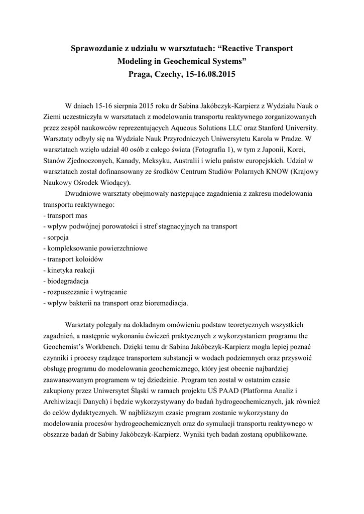 Sprawozdanie z udziału w warsztatach: “Reactive Transport Modeling in Geochemical Systems” Praga, Czechy, 15-16.08.2015 W dniach 15-16 sierpnia 2015 roku dr Sabina Jakóbczyk-Karpierz z Wydziału Nauk o Ziemi uczestniczyła w warsztatach z modelowania transportu reaktywnego zorganizowanych przez zespół naukowców reprezentujących Aqueous Solutions LLC oraz Stanford University. Warsztaty odbyły się na Wydziale Nauk Przyrodniczych Uniwersytetu Karola w Pradze. W warsztatach wzięło udział 40 osób z całego świata (Fotografia 1), w tym z Japonii, Korei, Stanów Zjednoczonych, Kanady, Meksyku, Australii i wielu państw europejskich. Udział w warsztatach został dofinansowany ze środków Centrum Studiów Polarnych KNOW (Krajowy Naukowy Ośrodek Wiodący). Dwudniowe warsztaty obejmowały następujące zagadnienia z zakresu modelowania transportu reaktywnego: - transport mas - wpływ podwójnej porowatości i stref stagnacyjnych na transport - sorpcja - kompleksowanie powierzchniowe - transport koloidów - kinetyka reakcji - biodegradacja - rozpuszczanie i wytrącanie - wpływ bakterii na transport oraz bioremediacja. Warsztaty polegały na dokładnym omówieniu podstaw teoretycznych wszystkich zagadnień, a następnie wykonaniu ćwiczeń praktycznych z wykorzystaniem programu the Geochemist’s Workbench. Dzięki temu dr Sabina Jakóbczyk-Karpierz mogła lepiej poznać czynniki i procesy rządzące transportem substancji w wodach podziemnych oraz przyswoić obsługę programu do modelowania geochemicznego, który jest obecnie najbardziej zaawansowanym programem w tej dziedzinie. Program ten został w ostatnim czasie zakupiony przez Uniwersytet Śląski w ramach projektu UŚ PAAD (Platforma Analiz i Archiwizacji Danych) i będzie wykorzystywany do badań hydrogeochemicznych, jak również do celów dydaktycznych. W najbliższym czasie program zostanie wykorzystany do modelowania procesów hydrogeochemicznych oraz do symulacji transportu reaktywnego w obszarze badań dr Sabiny Jakóbczyk-Karpierz. Wyniki tych badań zostaną opublikowane. Fotografia 1. Uczestnicy warsztatów „Reactive Transport Modeling in Geochemical Systems” w Pradze, 15-16.08.2015.