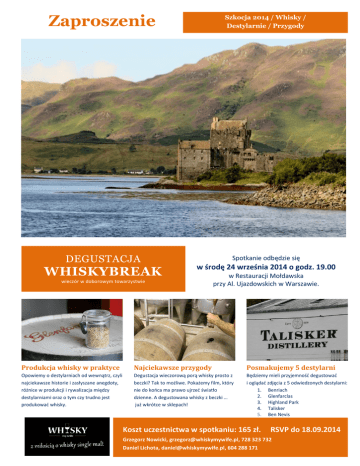 Zaproszenie Szkocja 2014 / Whisky / Destylarnie / Przygody DEGUSTACJA Spotkanie odbędzie się WHISKYBREAK w środę 24 września 2014 o godz. 19.00 wieczór w doborowym towarzystwie w Restauracji Mołdawska przy Al. Ujazdowskich w Warszawie. Produkcja whisky w praktyce Najciekawsze przygody Posmakujemy 5 destylarni Opowiemy o destylarniach od wewnątrz, czyli najciekawsze historie i zasłyszane anegdoty, różnice w produkcji i rywalizacja między destylarniami oraz o tym czy trudno jest produkować whisky. Degustacja wieczorową porą whisky prosto z beczki? Tak to możliwe. Pokażemy film, który nie do końca ma prawo ujrzeć światło dzienne. A degustowana whisky z beczki … już wkrótce w sklepach! Będziemy mieli przyjemność degustować i oglądać zdjęcia z 5 odwiedzonych destylarni: 1. Benriach 2. Glenfarclas 3. Highland Park 4. Talisker 5. Ben Nevis Koszt uczestnictwa w spotkaniu: 165 zł. RSVP do 18.09.2014 Grzegorz Nowicki, [email protected], 728 323 732 Daniel Lichota, [email protected], 604 288 171 Kto z nas nie potrzebuje chwili wytchnienia w tygodniu? Zapraszamy na WHISKYBREAK. Formuła spotkania Smaki Whisky Przypadkowi ludzie To krótkie spotkanie w środku tygodnia podczas którego w luźnej atmosferze będzie można odpocząć od codziennych trudów degustując dobrą i specjalnie dobraną whisky. Uczestnicy spotkania będą degustować różnorodne whisky, posłuchają opowieści o ich pochodzeniu, historii i produkcji. Uczestnicy spotkania będą mogli przeżyć coś na kształt podróży kulinarnej – poznają bogactwo i różnorodność zarówno smaków jak i aromatów whisky. Wraz z prowadzącymi wejdą w bogaty świat zapachu i smaku tego trunku. Whisky może być lekka i zwiewna jak polna łąka i ciężka, słona i wędzona jak wyładunek śledzia. Jaką lubisz? Nie degustują whisky. Spotkanie wspiera nawiązywanie relacji i budowanie networkingu. Wiadomo przecież, że przypadkowi ludzi nie degustują whisky. Warto ze sobą zabrać kilka wizytówek aby móc rozdać je na spotkaniu. Chociaż networking biznesowy nie jest celem samym w sobie to jest na pewno wartościowym uzupełnieniem każdego spotkania. WhiskyTour 2014 posłuchaj opowieści … Tak jak widać udało nam się poznać sporą część Szkocji. Co oprócz zabytków, zamków, kościołów nas zachwyciło? Dzika przyroda, piękne klify, cudowne góry. Czasami jadąc na siedzeniu pasażera nie miałem chwili spokoju. Co kilka minut krajobraz wymagał uwiecznienia na karcie aparatu. Już drugiego dnia jadąc do Speyside na degustację do Glenfarclasa przejeżdżaliśmy przez góry Cairngorm. Widoki przepiękne, a jeśli ktoś może się na chwilę zatrzymać to ma sporą szanse wypatrzenia wielu zwierząt, które tam żyją (takie jak żubry, niedźwiedzie czy dziki). Na najwyższej górze Cain Gorm (1245 m) znajduje się najlepszy ośrodek narciarski w całej Wielkiej Brytanii – narciarzem nie jestem ale jest to warte polecenie miejsce. Grzegorz Nowicki www.whiskymywife.pl Inwestowanie / Degustacje / Kieliszki do degustacji / Wyjazdy do Szkocji i na Festiwale ZAPRASZAMY