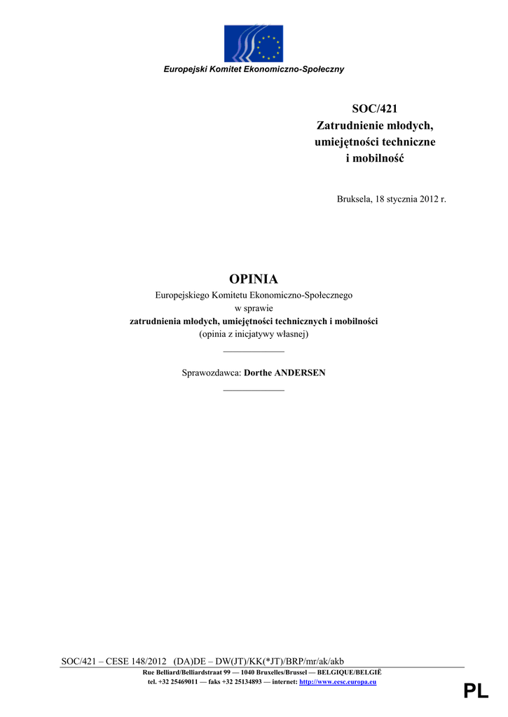 Europejski Komitet Ekonomiczno-Społeczny SOC/421 Zatrudnienie młodych, umiejętności techniczne i mobilność Bruksela, 18 stycznia 2012 r. OPINIA Europejskiego Komitetu Ekonomiczno-Społecznego w sprawie zatrudnienia młodych, umiejętności technicznych i mobilności (opinia z inicjatywy własnej) _____________ Sprawozdawca: Dorthe ANDERSEN _____________ SOC/421 – CESE 148/2012 (DA)DE – DW(JT)/KK(*JT)/BRP/mr/ak/akb Rue Belliard/Belliardstraat 99 — 1040 Bruxelles/Brussel — BELGIQUE/BELGIË tel. +32 25469011 — faks +32 25134893 — internet: http://www.eesc.europa.eu PL -1Dnia 14 lipca 2011 r. Europejski Komitet Ekonomiczno-Społeczny postanowił, zgodnie z art. 29 ust. 2 regulaminu wewnętrznego, sporządzić opinię z inicjatywy własnej w sprawie zatrudnienia młodych, umiejętności technicznych i mobilności. Sekcja Zatrudnienia, Spraw Społecznych i Obywatelstwa, której powierzono przygotowanie prac Komitetu w tej sprawie, przyjęła swoją opinię 16 grudnia 2011 r. Na 477. sesji plenarnej w dniach 18–19 stycznia 2012 r. (posiedzenie z 18 stycznia) Europejski Komitet Ekonomiczno-Społeczny stosunkiem głosów 173 do 1 – 4 osoby wstrzymały się od głosu – przyjął następującą opinię: * * * 1. Wnioski i zalecenia 1.1 Wskutek przemian demograficznych rynek pracy staje przed poważnymi wyzwaniami. Jak pokazują skutki kryzysu gospodarczego, rynki pracy doświadczają problemów strukturalnych. W szczególności ludziom młodym trudno jest, mimo posiadania odpowiednich kwalifikacji, na stałe wejść na rynek pracy. Dlatego też państwa członkowskie powinny przeprowadzić reformy określone w strategii „Europa 2020” i w krajowych programach reform zmierzających do przywrócenia wzrostu gospodarczego. 1.2 Bezrobocie ludzi młodych niesie z sobą znaczne szkody społeczne i gospodarcze dla społeczeństwa i dla samej młodzieży oraz ogranicza możliwości wzrostu. Konkurencyjność Europy będzie w znacznym stopniu zależała od wykwalifikowanej siły roboczej i istnieje ryzyko, że w walce o pracowników wykwalifikowanych i wysoko wykwalifikowanych Europa pozostanie w tyle za rywalami. 1.3 Nikt tak naprawdę nie wie, jak będą wyglądać miejsca pracy w przyszłości, niemniej jednak przygotowując programy kształcenia i szkolenia, należy przyjąć za podstawę zapotrzebowanie rynków pracy oraz zadania, które rzeczywiście trzeba podjąć. Jest niezbędne, by szerzej uznawano kwalifikacje uzyskiwane poza systemami kształcenia i szkolenia. W programach nauczania należy położyć większy nacisk na ogólne i innowacyjne umiejętności. 1.4 Należy usunąć bariery między systemem kształcenia i rynkiem pracy oraz uniknąć nadawania dominującego znaczenia względom finansowym. Partnerstwo między przedsiębiorstwami i systemem edukacji powinno zostać pogłębione, jeśli chodzi o opracowywanie programów nauczania i antycypowanie przyszłych potrzeb. Kształcenie i szkolenie powinno prowadzić do zatrudnienia. SOC/421 – CESE 148/2012 (DA)DE – DW(JT)/KK(*JT)/BRP/mr/ak/akb .../... -21.5 Kształcenie dualne i praktyki zawodowe powinny być wprowadzane do systemu edukacji w coraz większym stopniu – także w przypadku odpowiedniego szkolnictwa wyższego i kształcenia zawodowego. Synergie między zajęciami praktycznymi i szkoleniem w miejscu pracy oraz kształceniem teoretycznym wzmacniają zdolność młodzieży do zatrudnienia, ułatwiają wejście na rynek pracy i stanowią bodziec do rozwoju kształcenia. 1.6 Kraje, które chcą wprowadzić system dualny, powinny otrzymać subwencje z Europejskiego Funduszu Społecznego w celu pokrycia związanych z tym kosztów początkowych. 1.7 Otwarty i dynamiczny rynek pracy może wspierać mobilność, a zwłaszcza tworzyć możliwości zatrudnienia dla ludzi młodych. Zgodnie ze strategią „Europa 2020” i krajowymi programami reform państwa członkowskie są zobowiązane modernizować swoje rynki pracy, aby zwiększać ich zdolności absorpcji i poprawiać ich funkcjonowanie. 1.8 Aktywna polityka rynku pracy, motywująca poszukujących pracy i zatrudnionych do uczenia się przez całe życie, przyczynia się do zwiększenia mobilności zawodowej i geograficznej, i dzięki temu stwarza więcej możliwości zatrudnienia. 2. Cele i wstęp 2.1 Europejska młodzież jest przyszłością Europy. Wielu młodych ludzi nie ma jednak pracy albo odpowiednich kwalifikacji. Ponadto jest im trudno wejść na stałe na rynek pracy, nawet gdy posiadają odpowiednie kwalifikacje. 2.2 Przedmiotem niniejszej opinii są możliwości zatrudnienia dla młodych ludzi, a także kwestie przyszłego zapotrzebowania na pracowników technicznych i wykwalifikowaną siłę roboczą, dostępu młodzieży do rynku pracy oraz mobilności zawodowej. Mowa tu o podstawowej sile roboczej z wykształceniem technicznym czy zawodowym bądź też ze średnim poziomem kwalifikacji, która zdaniem CEDEFOP-u będzie w roku 2020 stanowić 50% osób aktywnych zawodowo. 2.3 W opinii przedstawione zostaną konkretne propozycje dotyczące poprawy możliwości zatrudnienia ludzi młodych oraz zapewnienia przedsiębiorstwom pracowników o właściwych kwalifikacjach. 2.4 Pojęcie „kwalifikacje” obejmuje wielorakie aspekty, np. umiejętności społeczne i ogólne, a także kompetencje techniczne i zawodowe, które są zdobywane zarówno w ramach systemu kształcenia ogólnego i zawodowego, jak i poprzez pracę oraz relacje i aktywność w społeczeństwie i w rodzinie. 2.5 Opinia ma na celu udzielenie odpowiedzi na dwa ściśle ze sobą powiązane pytania: 1) Jakie kwalifikacje będą potrzebne na rynku pracy w przyszłości? 2) Jak można zapewnić integrację ludzi młodych oraz możliwości mobilności zawodowej? SOC/421 – CESE 148/2012 (DA)DE – DW(JT)/KK(*JT)/BRP/mr/ak/akb .../... -32.6 Komisja Europejska zapoczątkowała w tym zakresie kilka inicjatyw przewodnich, a ostatnie z nich to „Mobilna młodzież” i „Program na rzec