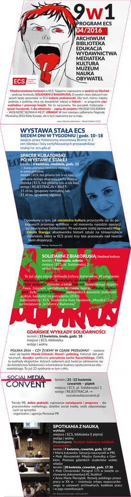 9w1 PROGRAM ECS 04/2016 ARCHIWUM BIBLIOTEKA EDUKACJA WYDAWNICTWA MEDIATEKA KULTURA MUZEUM NAUKA OBYWATEL Międzynarodowy kwiecień w ECS. Najpierw zapraszamy w podróż na Wschód – podczas festiwalu SOLIDARNI Z BIAŁORUSIĄ. O swoich nieco dalszych wojażach będą opowiadać w ECS kobiety podróżniczki. Dla tych, którzy między podróżą a podróżą chcą się dowiedzieć więcej o historii – w programie pięć wykładów i promocja książki. No to zaczynamy. Na początek tradycyjnie – spacer kuratorski. A dla młodzieży – zapisy do projektu MŁODZI SOLIDARNI – WOLNOŚĆ SŁOWA A HEJT. UWAGA! W tym miesiącu odbieramy Nagrodę Muzealną 2016 Rady Europy, ale o tym napiszemy już w maju. praca Adrianny Jaźwińskiej / Młodzi Solidarni 2015 WYSTAWA STAŁA ECS SIEDEM DNI W TYGODNIU | godz. 10–18 wejście przez historyczną stoczniową Bramę nr 2 cen biletów i listy certyfikowanych przewodników szukaj na: ecs.gda.pl SPACER KURATORSKI PO WYSTAWIE STAŁEJ termin | 3 kwietnia, niedziela, godz. 12 + każda pierwsza niedziela miesiąca w samo południe zbiórka | ECS, hol główny (vis-à-vis kas), szukajcie dużego długopisu Lecha Wałęsy zbiórka | ECS, hol główny (vis-à-vis kas) wstęp | REJESTRACJA + BILET: 15 zł/os. (grupowy normalny) lub 11 zł/os. (grupowy ulgowy) Opowiemy o tym, jak niezależna kultura przyczyniła się do pokojowych przemian w Polsce – od momentu narodzin opozycji po zwycięstwo Solidarności. Po wystawie stałej oprowadzi Magdalena Staręga, absolwentka historii sztuki na Uniwersytecie Gdańskim, która w ECS przez trzy lata pracowała nad tworzeniem ekspozycji. Fot. Grzegorz Mehring / Archiwum ECS SOLIDARNI Z BIAŁORUSIĄ | festiwal kultury termin | 9 kwietnia, sobota miejsce | ECS, pl. Solidarności 1 wstęp | wolny To już piąta edycja festiwalu kultury białoruskiej. W programie: warsztaty kulinarne i warsztaty językowe, spotkanie podróżnicze, projekcje filmowe, a także koncert białoruskiego zespołu Pawa. Gościem specjalnym festiwalu będzie Mikałaj Statkiewicz, były więzień polityczny Aleksandra Łukaszenki, białoruski polityk, kandydat na prezydenta (2010). organizatorzy | ECS, Studenckie Koło Naukowe „Mozaika”, Grupa Inicjatywna „Solidarni z Białorusią” GDAŃSKIE WYKŁADY SOLIDARNOŚCI termin | 13 kwietnia, środa, godz. 18 miejsce | ECS, biblioteka wstęp | wolny POLSKA 2016 – CZY ŻYJEMY W CZASIE PRZEŁOMU? – zastanawiać się będzie Marek Cichocki, filozof i politolog, historyk idei politycznych, doradca społeczny prezydenta Lecha Kaczyńskiego. GWS to wykłady ekspertów, których zadaniem jest twórcze odniesienie się do dziedzictwa Solidarności w kontekście budowy społeczeństwa obywatelskiego. To już 22 spotkanie w tym cyklu. termin | 21–22 kwietnia czwartek – piątek miejsce | ECS, pl. Solidarności 1 wstęp | REJESTRACJA → socialmediaconvent.pl Trendy PR, dobre praktyki, najnowsze rozwiązania i prognozy – dla pracowników marketingu, działów social media, osób odpowiadających za sprzedaż. organizator | agencja Personal PR SPOTKANIA Z NAUKĄ wykłady miejsce | ECS, biblioteka (I piętro) wstęp | wolny Prezentujemy dorobek badawczy młodych naukowców. termin | 7 kwietnia, czwartek, godz. 17.30 ▪ Marta Łukawska: Sytuacja nauczycieli w PRL ▪ Piotr Abryszeński: Między Gomułką a Gierkiem. Postawy gdańskich studentów wobec władzy termin | 28 kwietnia, czwartek, godz. 17.30 ▪ Piotr Chruścielski: Paragraf 175 w świetle zachowanej dokumentacji KL Stutthof ▪ Anna Maria Pieniążek: Rozwój polskiego prawa pracy w XX w. – instytucja urlopu wypoczynkowego w ustawach archiwalnych, kodeksie pracy i w jego nowelizacjach Fot. Katarzyna Granacka / Archiwum ECS TRAMPki | spotkanie podróżujących kobiet termin | 23–24 kwietnia, sobota – niedziela miejsce | ECS, pl. Solidarności 1 wstęp | REJESTRACJA → trampki.travel.pl O podróżach – rowerowych, pieszych, morskich, górskich, w pojedynkę i w grupie – opowiedzą wyłącznie kobiety – podróżniczki z całej Polski! Ci, którzy planują dalekie podróże, dowiedzą się, m.in. jak przygotować eskapadę do Iranu, Maroka czy Korei Północnej. organizator | Fundacja Podążaj Swoją Drogą, Urząd Miejski w Gdańsku, ECS Fot. Anita Dziemianowicz MŁODZI SOLIDARNI – WOLNOŚĆ SŁOWA A HEJT | zapisy na warsztaty zapisy | do 24 kwietnia 2016 → ecs.gda.pl/Mlodzi-Solidarni miejsce | ECS, pl. Solidarności 1 wstęp | wolny po dokonaniu zgłoszenia Warsztaty planowane są na 7–8 maja 2016. Zapraszamy młodzież w wieku 14–19 lat. Na warsztat bierzemy wolność słowa i hejt. Dla tych, którzy chcą się nauczyć, jak porozumiewać się bez nienawiści, przygotowaliśmy spotkania z artystami i prawnikami. Powstaną też m.in. kolaże, które w czerwcu zaprezentujemy na wystawie. To już 6 edycja projektu. SPOTKANIE Z ANDRZEJEM CHWALBĄ termin | 26 kwietnia, wtorek, godz. 18 miejsce | ECS, biblioteka (I piętro) wstęp | wolny Prof. Andrzej Chwalba to historyk i eseista, nauczyciel akademicki Uniwersytetu Jagiellońskiego, badacz dziejów Krakowa. Punktem wyjścia do rozmowy będzie jego książka SAMOBÓJSTWO EUROPY. WIELKA WOJNA 1914–1918. Spotkanie odbędzie się w ramach projektu AMBASADOR NOWEJ EUROPY. NIEFORMALNE OBLICZE EDUKACJI FORMALNEJ termin | 27 kwietnia, środa, godz. 9 miejsce | ECS, audytorium wstęp | wolny REJESTRACJA → edu-challenge.wix.com/konferencja Projekt realizują młodzi psycholodzy, pedagodzy oraz pasjonaci edukacji. Mowa będzie o systemie szkolnictwa publicznego w Polsce, problemach i pomysłach na zmiany w edukacji. organizator | Inicjatywa EDUCATIONAL CHA(LLE)NGE DYSKUSYJNY KLUB KSIĄŻKI CZARNEGO termin | 27 kwietnia, środa, godz. 18 miejsce | ECS, biblioteka (I piętro) wstęp | wolny dla klubowiczów zapisy do klubu | Magdalena Jedlicka, e-mail: m.jedlicka@ecs. gda.pl, tel.: 58 772 40 73 Bohaterem dnia będzie zbiór reportaży Michała Olszewskiego – NAJLEPSZE BUTY NA