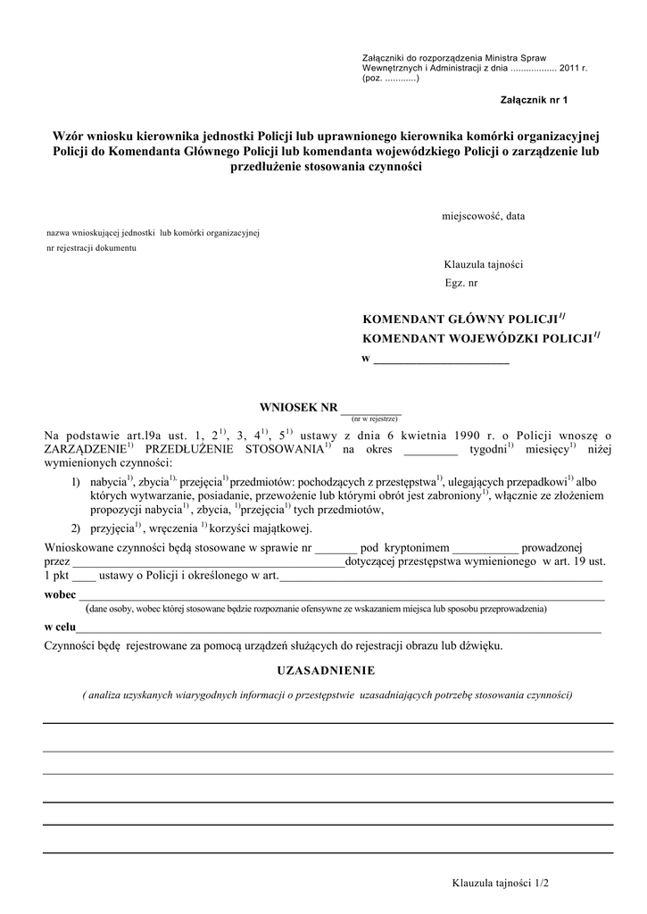 Załączniki do rozporządzenia Ministra Spraw Wewnętrznych i Administracji z dnia .................. 2011 r. (poz. ............) Załącznik nr 1 Wzór wniosku kierownika jednostki Policji lub uprawnionego kierownika komórki organizacyjnej Policji do Komendanta Głównego Policji lub komendanta wojewódzkiego Policji o zarządzenie lub przedłużenie stosowania czynności miejscowość, data nazwa wnioskującej jednostki lub komórki organizacyjnej nr rejestracji dokumentu Klauzula tajności Egz. nr KOMENDANT GŁÓWNY POLICJI 1] KOMENDANT WOJEWÓDZKI POLICJI 1] w ______________________ WNIOSEK NR (nr w rejestrze) Na podstawie art.l9a ust. 1, 2 , 3, 4 , 5 ustawy z dnia 6 kwietnia 1990 r. o Policji wnoszę o ZARZĄDZENIE1) PRZEDŁUŻENIE STOSOWANIA1) na okres _________ tygodni1) miesięcy1) niżej wymienionych czynności: 1) 1) 1) 1) nabycia1), zbycia1), przejęcia1) przedmiotów: pochodzących z przestępstwa1), ulegających przepadkowi1) albo których wytwarzanie, posiadanie, przewożenie lub którymi obrót jest zabroniony1), włącznie ze złożeniem propozycji nabycia1) , zbycia, 1)przejęcia1) tych przedmiotów, 2) przyjęcia1) , wręczenia 1) korzyści majątkowej. Wnioskowane czynności będą stosowane w sprawie nr _______ pod kryptonimem ___________ prowadzonej przez ______________________________________________dotyczącej przestępstwa wymienionego w art. 19 ust. 1 pkt ____ ustawy o Policji i określonego w art.______________________________________________________ wobec ________________________________________________________________________________________ (dane osoby, wobec której stosowane będzie rozpoznanie ofensywne ze wskazaniem miejsca lub sposobu przeprowadzenia) w celu________________________________________________________________________________________ Czynności będę rejestrowane za pomocą urządzeń służących do rejestracji obrazu lub dźwięku. UZASADNIENIE ( analiza uzyskanych wiarygodnych informacji o przestępstwie uzasadniających potrzebę stosowania czynności) Klauzula tajności 1/2 Strona 2 Klauzula tajności Egz. nr _______________________________________________________________________________________________________ _______________________________________________________________________________________________________ _______________________________________________________________________________________________________ _______________________________________________________________________________________________________ _______________________________________________________________________________________________________ _______________________________________________________________________________________________________ _______________________________________________________________________________________________________ _______________________________________________________________________________________________________ _______________________________________________________________________________________________________ _______________________________________________________________________________________________________ _______________________________________________________________________________________________________ ______________________________________________________________________________________ _____________ ______________________________________________________________________________________ _____________ ______________________________________________________________________________________ _____________ ___________________________________________________________________________________________________ KIEROWNIK JEDNOSTKI POLICJI1) KIEROWNIK KOMÓRKI ORGANIZACYJNEJ WŁAŚCIWEJ DO WYKONYWANIA CZYNNOŚCI OPERACYJNO-ROZPOZNAWCZYCH1) --------------------------------------------(podpis, data, pieczęć) Odmawiam akceptacji wniosku 1) KOMENDANT GŁÓWNY POLICJI1) Akceptuję wniosek1) KOMENDANT WOJEWÓDZKI POLICJI1) w _______________________________ Dnia ______________ godz.________ --------------------------------------------(podpis, pieczęć) 1) Niepotrzebne skreślić Wyk. w 2 egz. Egz. nr 1 Egz. nr 2. Opracował: Wykonał: Klauzula tajności 2/2 Załącznik nr 2 Wzór formularza zawierającego wniosek Komendanta Głównego Policji lub komendanta wojewódzkiego Policji o wyrażenie zgody na zarządzenie lub przedłużenie stosowania czynności, zgodę prokuratora okręgowego na zarządzenie lub przedłużenie ich stosowania oraz zarządzenie Komendanta Głównego Policji lub komendanta wojewódzkiego Policji o stosowaniu lub przedłużeniu stosowania czynności miejscowość, data nazwa wnioskującej jednostki lub komórki organizacyjnej nr rejestracji dokumentu Klauzula tajności Egz. nr PROKURATOR OKRĘGOWY w ________________________ WNIOSEK NR (nr w rejestrze) Na podstawie art.l9a ust. 1, 2 , 3, 4 , 5 ustawy z dnia 6 kwietnia 1990 r. o Policji wnoszę o wyrażenie zgody na ZARZĄDZENIE1) PRZEDŁUŻENIE STOSOWANIA1) na okres _________ tygodni1) miesięcy1) niżej wymienionych czynności: 1) 1) 1) 3) nabycia1), zbycia1), przejęcia1) przedmiotów: pochodzących z przestępstwa1), ulegających przepadkowi1) albo których wytwarzanie, posiadanie, przewożenie lub którymi obrót jest zabroniony 1), włącznie ze złożeniem propozycji nabycia1) , zbycia, 1)przejęcia1) tych przedmiotów, 4) przyjęcia1) , wręczenia 1) korzyści majątkowej. Wnioskowane czynności będą stosowane w sprawie nr _______ pod kryptonimem ___________ prowadzonej przez ______________________________________________dotyczącej przestępstwa wymienionego w art. 19 ust. 1 pkt ____ ustawy o Policji i określonego w art.______________________________________________________ wobec ________________________________________________________________________________________ (dane osoby, wobec której stosowane będzie rozpoznanie ofensywne ze wskazaniem miejsca lub sposobu przeprowadzenia) w celu_______________________________________________________
