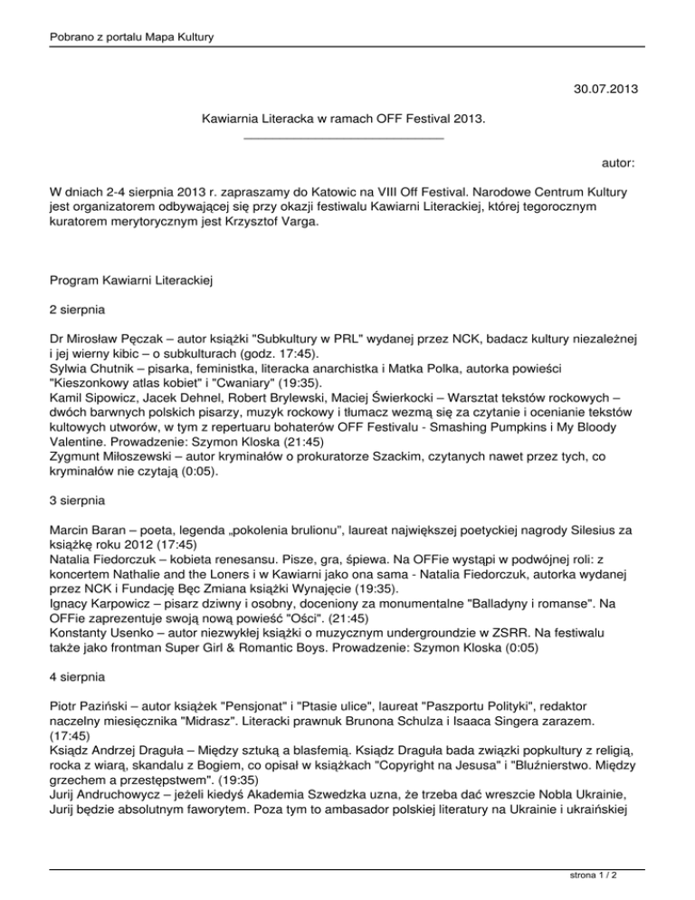 Pobrano z portalu Mapa Kultury 30.07.2013 Kawiarnia Literacka w ramach OFF Festival 2013. ____________________________ autor: W dniach 2-4 sierpnia 2013 r. zapraszamy do Katowic na VIII Off Festival. Narodowe Centrum Kultury jest organizatorem odbywającej się przy okazji festiwalu Kawiarni Literackiej, której tegorocznym kuratorem merytorycznym jest Krzysztof Varga. Program Kawiarni Literackiej 2 sierpnia Dr Mirosław Pęczak – autor książki "Subkultury w PRL" wydanej przez NCK, badacz kultury niezależnej i jej wierny kibic – o subkulturach (godz. 17:45). Sylwia Chutnik – pisarka, feministka, literacka anarchistka i Matka Polka, autorka powieści "Kieszonkowy atlas kobiet" i "Cwaniary" (19:35). Kamil Sipowicz, Jacek Dehnel, Robert Brylewski, Maciej Świerkocki – Warsztat tekstów rockowych – dwóch barwnych polskich pisarzy, muzyk rockowy i tłumacz wezmą się za czytanie i ocenianie tekstów kultowych utworów, w tym z repertuaru bohaterów OFF Festivalu - Smashing Pumpkins i My Bloody Valentine. Prowadzenie: Szymon Kloska (21:45) Zygmunt Miłoszewski – autor kryminałów o prokuratorze Szackim, czytanych nawet przez tych, co kryminałów nie czytają (0:05). 3 sierpnia Marcin Baran – poeta, legenda „pokolenia brulionu”, laureat największej poetyckiej nagrody Silesius za książkę roku 2012 (17:45) Natalia Fiedorczuk – kobieta renesansu. Pisze, gra, śpiewa. Na OFFie wystąpi w podwójnej roli: z koncertem Nathalie and the Loners i w Kawiarni jako ona sama - Natalia Fiedorczuk, autorka wydanej przez NCK i Fundację Bęc Zmiana książki Wynajęcie (19:35). Ignacy Karpowicz – pisarz dziwny i osobny, doceniony za monumentalne "Balladyny i romanse". Na OFFie zaprezentuje swoją nową powieść "Ości". (21:45) Konstanty Usenko – autor niezwykłej książki o muzycznym undergroundzie w ZSRR. Na festiwalu także jako frontman Super Girl & Romantic Boys. Prowadzenie: Szymon Kloska (0:05) 4 sierpnia Piotr Paziński – autor książek "Pensjonat" i "Ptasie ulice", laureat "Paszportu Polityki", redaktor naczelny miesięcznika "Midrasz". Literacki prawnuk Brunona Schulza i Isaaca Singera zarazem. (17:45) Ksiądz Andrzej Draguła – Między sztuką a blasfemią. Ksiądz Draguła bada związki popkultury z religią, rocka z wiarą, skandalu z Bogiem, co opisał w książkach "Copyright na Jesusa" i "Bluźnierstwo. Między grzechem a przestępstwem". (19:35) Jurij Andruchowycz – jeżeli kiedyś Akademia Szwedzka uzna, że trzeba dać wreszcie Nobla Ukrainie, Jurij będzie absolutnym faworytem. Poza tym to ambasador polskiej literatury na Ukrainie i ukraińskiej strona 1 / 2 Pobrano z portalu Mapa Kultury w Polsce. Prawdziwa gwiazda. (21:45) Krzysztof Siwczyk, Maciej Melecki, Marta Podgórnik, czyli "Śląski beat" - trójka poetów z Mikołowa i Gliwic, strażnicy dziedzictwa Rafała Wojaczka. (0:05) strona 2 / 2