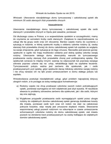 Wnioski do budżetu Opola na rok 2015. Wniosek: Utworzenie nieodpłatnego domu tymczasowej i całodobowej opieki dla minimum 30 osób starszych i/lub przewlekle chorych Uzasadnienie Utworzenie nieodpłatnego domu tymczasowej i całodobowej opieki dla osób starszych i przewlekle chorych w Opolu jest zasadne, ponieważ: Od dłuższego czasu w Polsce, a w województwie opolskim w szczególności, mamy do czynienia ze wzrostem liczby osób starszych. Zwiększa to zapotrzebowanie na usługi dla tej grupy osób oraz ich otoczenia. Bardzo często mamy do czynienia z sytuacją w rodzinie, w której opiekunki myślą o oddaniu członka rodziny (tj. osoby starszej i/lub przewlekle chorej) do domu całodobowej opieki lub szpitala ze względu na swoje zmęczenie, gdyż sytuacja je do tego zmusza. Nierzadko jest jeszcze gorzej: opiekunki w ogóle nie mają możliwości oddania pod dobrą opiekę członka swojej rodziny. Utworzenie takiego domu stworzyłoby warunki do tymczasowego przekazania osoby starszej i/lub przewlekle chorej pod profesjonalną opiekę. Dla opiekunek oznacza to między innymi: szansę na odpoczynek lub poprawę swojego zdrowia poprzez udanie się na: urlop, rehabilitację bądź na szpitalne leczenie. Tymczasowość pobytu ważna jest zarówno dla opiekunek, jak i osób przekazywanych pod opiekę, gdyż opiekunki darzą miłością członków swojej rodziny i nie chcą narażać ich na lęki przed umieszczeniem w domu stałego pobytu lub szpitalu. Wnioskodawca postuluje nieodpłatność usługi, gdyż problem najczęściej dotyczy ubogich rodzin, a to pociąga za sobą następujące konsekwencje: a) Rodziny często nie chcą przekazać członków swoich rodzin potrzebujących opieki, ponieważ wymagana od nich odpłatność jest zbyt wysoka. W rezultacie stwarza to problemy zdrowotne zarówno dla opiekunek, jak i dla osób, którymi się one zajmują. b) Wyjątkowe przypadki przekazania osób wymagających opieki przez ubogie rodziny do odpłatnych domów całodobowej opieki generują dodatkowe koszty dla miasta, ponieważ osób tych oraz ich rodzin nie stać na całościowe pokrycie kosztów, więc resztę jest zmuszone dopłacić miasto. Stworzenie wspomnianej usługi pozwoli rodzinom na odsunięcie w czasie umieszczenie schorowanych członków rodziny do domu całodobowej opieki, zaś miastu pozwoli na obniżenie kwot przekazywanych na osoby trafiające do odpłatnych domów całodobowej opieki. Wniosek: Sfinansowanie nieodpłatnej linii autobusowej numer 15 w okresie 2 stycznia 2015–31 sierpnia 2015 Uzasadnienie Idea nieodpłatnej komunikacji miejskiej cieszy się w Polsce coraz większym powodzeniem. Do tej pory wdrożono ją jedynie w gminach, których liczba mieszkańców nie przekracza 100 tysięcy, stąd też założeniem wnioskodawcy jest podjęcie próby odpowiedzi na pytanie: czy w Opolu – mieście wojewódzkim – również warto wprowadzić ten pomysł w życie? Mając na względzie różnicę uwarunkowań między Opolem a gminami, w których nieodpłatna komunikacja miejska już funkcjonuje, należy uruchomić nieodpłatną linię autobusową numer 15 w okresie 2 stycznia 2015–31 sierpnia 2015. Pozwoli to odpowiedzieć na szereg istotnych pytań: 1. Czy nieodpłatność komunikacji miejskiej wpłynie na liczbę pasażerów linii numer 15 oraz pozostałych? 2. Czy wpłynie na natężenie ruchu samochodowego? 3. Czy będzie miało znaczenie dla mobilności osób przemieszczających na terenie Opola? 4. Jaki wpływ idea ta będzie miała na budżet Opola z tytułu braku wpływów z biletów linii autobusowej numer 15? 5. Czy wpłynie na stan taboru części pasażerskiej? 6. Czy idea ta będzie miała znaczenie dla liczby kursów linii numer 15? 7. Czy nieodpłatność komunikacji wpłynie na zanieczyszczenie powietrza i poziom natężenia hałasu? 8. Czy będzie miała wpływ na wydatki na infrastrukturę związaną z poprawą jakości przystanków autobusowych? 9. Czy wpłynie na popularność instytucji znajdujących się na trasie linii numer 15? Najbardziej odpowiedni jest wybór linii autobusowej numer 15, gdyż: A) Jest najbardziej uczęszczaną linią (15% pasażerów w 2013 roku); B) W jej ciągu komunikacyjnym znajdują się istotne punkty aktywności miasta Opola: dwa kampusy Politechniki, szkoły (13 szkół ponadpodstawowych: ponad 6500 uczniów), dwa dworce kolejowe, dworzec PKS, Główny Urząd Pocztowy, Urząd Marszałkowski, biblioteki: miejska, wojewódzka, uniwersytecka, szpitale: wojewódzki, wojskowy, psychiatryczny, ginekologiczno-położniczy, miejsca rekreacji i wypoczynku: pływalnia Akwarium, basen Wodna Nuta, fontanna grająca przy stawku Barlickiego, lodowisko Toropol, punkty kulturalne: Amfiteatr, Narodowe Centrum Piosenki, Młodzieżowy Dom Kultury, Teatr im. J. Kochanowskiego, punkty handlowousługowe: pawilony na skrzyżowaniu ulic Niemodlińskiej i Prószkowskiej, hipermarket Real i Media Markt przy ul. Sosnkowskiego, całodobowe Tesco przy ul. Ozimskiej, Galeria Handlowa Opolanin, Błękitna Wstęga przy ul. Horoszkiewicza, pawilony przy ul. Sosnowskiego, Castorama przy ul. Wiejskiej. C) Łączy najgęściej zaludnione części Opola: osiedle Armii Krajowej, osiedle Malinka, a także osiedla przy ulicach: Plac Teatralny, Koszyka, Prószkowskiej, Wojska Polskiego, Chmielowickiej, Gospodarczej, Tęczowej. Wnioskodawca proponuje okres 2 stycznia 2015–31 sierpnia 2015, ponieważ czas ten pozwoli na zebranie danych w tych porach roku, które mają znaczenie dla wyboru środka transportu w Opolu. Wszystkie wymienione czynniki będą decydujące dla wiarygodności, rzetelności oraz trafności uzyskanych wyników z przeprowadzonego projektu. Z tego względu wnioskodawca liczy na to, że miasto nawiąże współpracę ze wszystkimi instytucjami, które będą w stanie pomóc wyciągnąć odpowiednie wnioski z powyższego okresu nieodpłatności linii autobusowej numer 15. Wniosek: Dofinansowanie kwotą 200 zł studentów Uniwersytetu