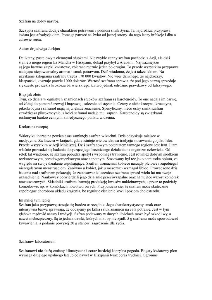 Szafran na dobry nastrój. Szczypta szafranu dodaje charakteru potrawom i podnosi smak życia. Ta najdroższa przyprawa świata jest afrodyzjakiem. Pomaga patrzeć na świat od jasnej strony. do tego leczy infekcje i dba o zdrowie serca. Autor: dr jadwiga Jurkjan Delikatny, pastelowy z ciemnymi słupkami. Niezwykle cenny szafran pochodzi z Azji, ale dziś słynie z niego region La Mancha w Hiszpanii, dokąd przybył z Arabami. Najważniejsze są jego barwne słupki kwiatowe, zbierane ręcznie jeden po drugim. To przede wszystkim przyprawa nadająca niepowtarzalny aromat i smak potrawom. Dziś wiadomo, że jest także lekiem. Na uzyskanie kilograma szafranu trzeba 170 000 kwiatów. Nic więc dziwnego, że najdroższy, hiszpański, kosztuje prawie 1000 dolarów. Wartość szafranu sprawia, że pod jego nazwą sprzedaje się często proszek z krokosza barwierskiego. Łatwo jednak odróżnić prawdziwy od fałszywego. Brąz jak złoto Tym, co działa w ognistych znamionach słupków szafranu są karotenoidy. To one nadają im barwę, od żółtej do pomarańczowej i brązowej, zależnie od stężenia. Cztery z nich: krocyna, krocetyna, pikrokrocyna i safranol mają największe znaczenie. Specyficzny, nieco ostry smak szafran zawdzięcza pikrokrocynie, z kolei safranol nadaje mu zapach. Karotenoidy są związkami roślinnymi bardzo cennymi z medycznego punktu widzenia. Krokus na receptę Walory kulinarne na pewien czas zamknęły szafran w kuchni. Dziś odzyskuje miejsce w medycynie. Zwłaszcza w krajach, gdzie istnieje wielowiekowa tradycja stosowania go jako leku. Przede wszystkim w Azji Mniejszej. Dziś szafranowym potentatem tamtego regionu jest Iran. I tam właśnie prowadzi się badania dotyczące jego leczniczego działania na organizm człowieka. Od setek lat wiadomo, że szafran pobudza apetyt i wspomaga trawienie. Jest również dobrym środkiem rozkurczowym, przeciwgorączkowym oraz napotnym. Stosowany był też jako namiastka opium, ze względu na swoje działanie uspokajające. Szafran wzmacniał kobiece narządy płciowe i zapobiegał nieregularnym menstruacjom. Zarówno u kobiet, jak u mężczyzn wzmagał libido. Prowadzone dziś badania nad szafranem pokazują, że zastosowanie lecznicze szafranu sprzed wielu lat ma swoje uzasadnienie. Naukowcy potwierdzili jego działanie przeciwzapalne oraz hamujące wzrost komórek nowotworowych. Składniki szafranu hamują produkcję kwasów nukleinowych, a przez to podziały komórkowe, np. w komórkach nowotworowych. Przypuszcza się, że szafran może skutecznie zapobiegać chorobom układu krążenia, bo reguluje ciśnienie krwi i poziom cholesterolu. Im mniej tym lepiej Szafran jako przyprawę stosuje się bardzo oszczędnie. Jego charakterystyczny smak oraz intensywna barwa sprawiają, że dodajemy po kilka sztuk znamion na całą potrawę. Jest w tym głęboka mądrość natury i tradycji. Szfran podawany w dużych ilościach może być szkodliwy, a nawet niebezpieczny. Są to jednak dawki, których nikt by nie zjadł. 5 g szafranu może spowodować krwawienia, a podanie powyżej 20 g stanowi zagrożenie dla życia. Szafranw laboratorium Szafranowi nie służą zmiany klimatyczne i coraz bardziej kapryśna pogoda. Bogaty kwiatowy plon wymaga długiego upalnego lata, o co nawet w Hiszpanii teraz coraz trudniej. Ogromne zapotrzebowanie na najbardziej cenny szafran hiszpański sprawia, że tamtejsi naukowcy skłaniają się do wykorzystania nowoczesnych technologii, aby zwiększyć jego produkcję. Za pomocą biotechnologii lub metodami genetyki i biologii molekularnej starają się doprowadzić do wzrostu odpowiednio dużej wielkości słupków kwiatowych szafranu, by zwiększyć plony. Szafran w pigułce przepiszą nam lekarze. Sami możemy dodawać go do potraw. Najbardziej pasuje do dań z ryżu, zup, sosów, słodyczy i wypieków. Doskonale jednak współgra też z czosnkiem, tymiankiem, pomidorami, imbirem i cytryną. Co to jest szafran? Znamiona słupków kwiatowych szafranu uprawnego, zwanego też krokusem uprawnym (Crocus sativus). Powinien mieć jaskrawopomarańczowy kolor, silny aromat i lekko gorzki, ostrawy smak. Sprzedawany jestw postaci nitek lub proszku. Przed użyciem trzeba go namoczyć w mleku lub innym płynie. Jak sprawdzić jakość szafranu: • Wrzuć szafran do ciepłego mleka lub wody. Prawdziwy szafran hiszpański oddaje swój barwnik powoli – w ciągu paru minut, a nie natychmiast. • Znamiona prawdziwego szafranu różnią się od siebie nieznacznie natężeniem barwy. Nigdy nie są jednakowe. • Znamiona prawdziwego szafranu bywają połączone ze sobą – tak jak na słupku kwiatowym. Najnowsze doniesienia: Szafran jest gwiazdą nauki. Tak wielu badaczy się nim zajmuje, że powstała swego rodzaju platforma naukowa – nowa dyscyplina zwana „szafranologią”. Ta starożytna przyprawa zwiększa zdolność uczenia się, poprawia krążenie w oczach i funkcjonowanie siatkówki. Preparaty szafranu będzie można wykorzystywać do regulowania ciśnienia krwi oraz w leczeniu różnych stanów zapalnych, miażdżycy, a nawet choroby Alzheimera czy choroby Parkinsona i nowotworów. Nadzieje daje też chorym na depresję.