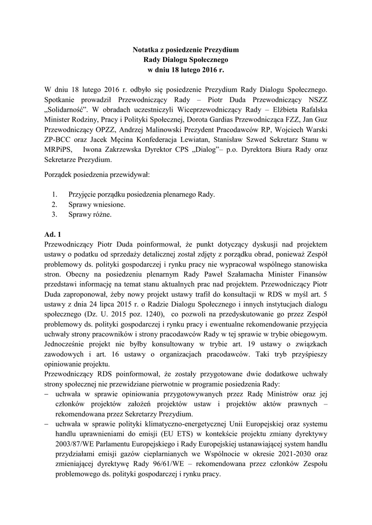 Notatka z posiedzenie Prezydium Rady Dialogu Społecznego w dniu 18 lutego 2016 r. W dniu 18 lutego 2016 r. odbyło się posiedzenie Prezydium Rady Dialogu Społecznego. Spotkanie prowadził Przewodniczący Rady – Piotr Duda Przewodniczący NSZZ „Solidarność”. W obradach uczestniczyli Wiceprzewodniczący Rady – Elżbieta Rafalska Minister Rodziny, Pracy i Polityki Społecznej, Dorota Gardias Przewodnicząca FZZ, Jan Guz Przewodniczący OPZZ, Andrzej Malinowski Prezydent Pracodawców RP, Wojciech Warski ZP-BCC oraz Jacek Męcina Konfederacja Lewiatan, Stanisław Szwed Sekretarz Stanu w MRPiPS, Iwona Zakrzewska Dyrektor CPS „Dialog”– p.o. Dyrektora Biura Rady oraz Sekretarze Prezydium. Porządek posiedzenia przewidywał: 1. 2. 3. Przyjęcie porządku posiedzenia plenarnego Rady. Sprawy wniesione. Sprawy różne. Ad. 1 Przewodniczący Piotr Duda poinformował, że punkt dotyczący dyskusji nad projektem ustawy o podatku od sprzedaży detalicznej został zdjęty z porządku obrad, ponieważ Zespół problemowy ds. polityki gospodarczej i rynku pracy nie wypracował wspólnego stanowiska stron. Obecny na posiedzeniu plenarnym Rady Paweł Szałamacha Minister Finansów przedstawi informację na temat stanu aktualnych prac nad projektem. Przewodniczący Piotr Duda zaproponował, żeby nowy projekt ustawy trafił do konsultacji w RDS w myśl art. 5 ustawy z dnia 24 lipca 2015 r. o Radzie Dialogu Społecznego i innych instytucjach dialogu społecznego (Dz. U. 2015 poz. 1240), co pozwoli na przedyskutowanie go przez Zespół problemowy ds. polityki gospodarczej i rynku pracy i ewentualne rekomendowanie przyjęcia uchwały strony pracowników i strony pracodawców Rady w tej sprawie w trybie obiegowym. Jednocześnie projekt nie byłby konsultowany w trybie art. 19 ustawy o związkach zawodowych i art. 16 ustawy o organizacjach pracodawców. Taki tryb przyśpieszy opiniowanie projektu. Przewodniczący RDS poinformował, że zostały przygotowane dwie dodatkowe uchwały strony społecznej nie przewidziane pierwotnie w programie posiedzenia Rady: uchwała w sprawie opiniowania przygotowywanych przez Radę Ministrów oraz jej członków projektów założeń projektów ustaw i projektów aktów prawnych – rekomendowana przez Sekretarzy Prezydium. uchwała w sprawie polityki klimatyczno-energetycznej Unii Europejskiej oraz systemu handlu uprawnieniami do emisji (EU ETS) w kontekście projektu zmiany dyrektywy 2003/87/WE Parlamentu Europejskiego i Rady Europejskiej ustanawiającej system handlu przydziałami emisji gazów cieplarnianych we Wspólnocie w okresie 2021-2030 oraz zmieniającej dyrektywę Rady 96/61/WE – rekomendowana przez członków Zespołu problemowego ds. polityki gospodarczej i rynku pracy. Zaproponował przyjęcie projektów i skierowanie ich pod obrady Rady. Propozycja została przyjęta. Ponadto Przewodniczący RDS poinformował, że Grzegorz Tobiszowski Sekretarz Stanu w Ministerstwie Energii przedstawi na posiedzeniu plenarnym Rady informację o sytuacji w sektorze surowcowym oraz w sektorze węgla brunatnego i kamiennego. Przewodniczący OPZZ Jan Guz zaproponował przyjęcie poprawki w Uchwale nr 3 strony społecznej dotyczącej reprezentatywności oraz w dodanie do Regulaminu Biura Rady przyjętego Decyzją nr 2 Prezydium z 4.02.2016 r. zapisów dot. zespołów doraźnych. Obie poprawki zostały przyjęte jednogłośnie. Ponadto Przewodniczący Jan Guz zwrócił uwagę, że w uchwalonej przez Parlament ustawie o pomocy państwa w wychowywaniu dzieci nie ma zapisów dotyczących udziału Rady Dialogu Społecznego w weryfikacji wysokości świadczenia wychowawczego. Projekt ustawy przekazany do konsultacji społecznych przewidywał takie uprawnienie dla Rady. Stwierdził, że jest to bardzo niepokojący sygnał nie tylko dla pozycji Rady Dialogu Społecznego, ale także naruszenia zasad konsultacji społecznych, poprzez wprowadzenie tak znaczącej zmiany do ustawy eliminującej udział partnerów społecznych z procesów decyzyjnych. Wobec powyższego zaproponował przyjęcie uchwały strony pracowników i strony pracodawców Rady Dialogu Społecznego w sprawie pozbawienia Rady Dialogu Społecznego możliwości uczestniczenia w procesie weryfikacji wysokości kryterium dochodowego i świadczenia wychowawczego w ustawie o pomocy państwa w wychowywaniu dzieci. Minister Rodziny, Pracy i Polityki Społecznej Elżbieta Rafalska wyjaśniła, że w trakcie prac został całkowicie zmieniony zapis artykułu dotyczący weryfikacji wysokości świadczenia wychowawczego. W ostatecznie przyjętym projekcie ustawy wprowadzono inny mechanizm weryfikacji. Podkreśliła, że w przyjętym rozwiązaniu strona społeczna RDS będzie opiniować projekt rozporządzenia Rady Ministrów w sprawie weryfikacji świadczenia wychowawczego w trybie art. 5 ustawy o RDS. Zwróciła uwagę, że Minister do spraw rodziny jest zobowiązany, nie później niż w terminie 12 miesięcy od dnia wejścia w życie ustawy, przedstawić Radzie Ministrów ocenę systemów świadczeń na rzecz rodziny wraz z wnioskami dotyczącymi zmian w tych systemach. Wtedy też możliwa jest zmiana tego przepisu i ewentualna nowelizacja ustawy. Członkowie Prezydium przyjęli deklarację Minister Elżbiety Rafalskiej i zdecydowali o nie wprowadzaniu zaproponowanego projektu Uchwały pod obrady Rady. Program posiedzenia plenarnego został jednogłośnie przyjęty. Przewodniczący Rady zwrócił uwagę na zapowiedzianą nieobecności na posiedzeniu plenarnym Rady części powołanych w skład Rady przedstawicieli strony rządowej. Przypomniał, że zgodnie z art. 27 ust. 3 ustawy o Radzie Dialogu Społecznego osoby powołane do składu Rady albo do udziału w jej pracach uczestniczą osobiście w pracach Rady. Zaproponował ustalenie najbliższych terminów spotkań Prezydium i plenarnego RDS. Podanie terminu i uwzględnienie go w kalendarzu prac członków Rady pozwoli ograniczyć absencję członków Rady na jej pos