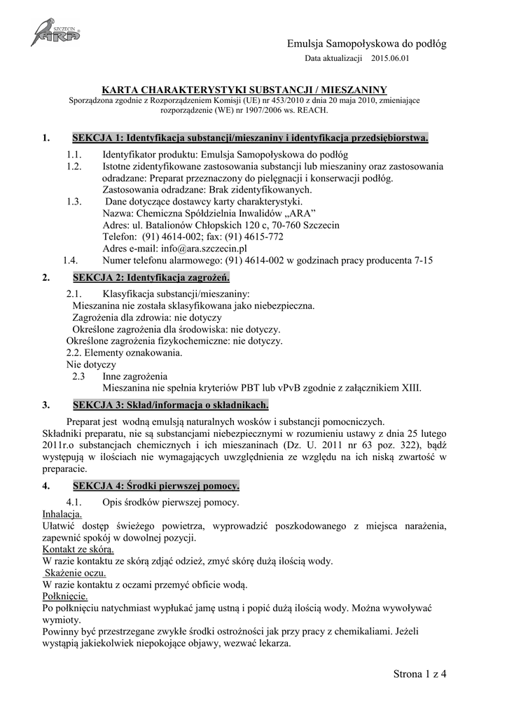 Emulsja Samopołyskowa do podłóg Data aktualizacji 2015.06.01 KARTA CHARAKTERYSTYKI SUBSTANCJI / MIESZANINY Sporządzona zgodnie z Rozporządzeniem Komisji (UE) nr 453/2010 z dnia 20 maja 2010, zmieniające rozporządzenie (WE) nr 1907/2006 ws. REACH. 1. SEKCJA 1: Identyfikacja substancji/mieszaniny i identyfikacja przedsiębiorstwa. 1.1. 1.2. 1.3. 1.4. 2. Identyfikator produktu: Emulsja Samopołyskowa do podłóg Istotne zidentyfikowane zastosowania substancji lub mieszaniny oraz zastosowania odradzane: Preparat przeznaczony do pielęgnacji i konserwacji podłóg. Zastosowania odradzane: Brak zidentyfikowanych. Dane dotyczące dostawcy karty charakterystyki. Nazwa: Chemiczna Spółdzielnia Inwalidów „ARA” Adres: ul. Batalionów Chłopskich 120 c, 70-760 Szczecin Telefon: (91) 4614-002; fax: (91) 4615-772 Adres e-mail: [email protected] Numer telefonu alarmowego: (91) 4614-002 w godzinach pracy producenta 7-15 SEKCJA 2: Identyfikacja zagrożeń. 2.1. Klasyfikacja substancji/mieszaniny: Mieszanina nie została sklasyfikowana jako niebezpieczna. Zagrożenia dla zdrowia: nie dotyczy Określone zagrożenia dla środowiska: nie dotyczy. Określone zagrożenia fizykochemiczne: nie dotyczy. 2.2. Elementy oznakowania. Nie dotyczy 2.3 Inne zagrożenia Mieszanina nie spełnia kryteriów PBT lub vPvB zgodnie z załącznikiem XIII. 3. SEKCJA 3: Skład/informacja o składnikach. Preparat jest wodną emulsją naturalnych wosków i substancji pomocniczych. Składniki preparatu, nie są substancjami niebezpiecznymi w rozumieniu ustawy z dnia 25 lutego 2011r.o substancjach chemicznych i ich mieszaninach (Dz. U. 2011 nr 63 poz. 322), bądź występują w ilościach nie wymagających uwzględnienia ze względu na ich niską zwartość w preparacie. 4. SEKCJA 4: Środki pierwszej pomocy. 4.1. Opis środków pierwszej pomocy. Inhalacja. Ułatwić dostęp świeżego powietrza, wyprowadzić poszkodowanego z miejsca narażenia, zapewnić spokój w dowolnej pozycji. Kontakt ze skórą. W razie kontaktu ze skórą zdjąć odzież, zmyć skórę dużą ilością wody. Skażenie oczu. W razie kontaktu z oczami przemyć obficie wodą. Połknięcie. Po połknięciu natychmiast wypłukać jamę ustną i popić dużą ilością wody. Można wywoływać wymioty. Powinny być przestrzegane zwykłe środki ostrożności jak przy pracy z chemikaliami. Jeżeli wystąpią jakiekolwiek niepokojące objawy, wezwać lekarza. Strona 1 z 4 Emulsja Samopołyskowa do podłóg 4.2. Najważniejsze ostre i opóźnione skutki narażenia: brak dostępnych dalszych danych. 4.3. Wskazania dotyczące wszelkiej natychmiastowej pomocy lekarskiej i szczególnego postępowania z poszkodowanym: brak dostępnych dalszych danych 5. SEKCJA 5: Postępowanie w przypadku pożaru. 5.1. Środki gaśnicze. Odpowiednie dla palących się materiałów. 5.2. Szczególne zagrożenia związane z substancją lub mieszaniną.: brak danych. 5.3.Informacje dla straży pożarnej: brak. 6. SEKCJA 6: Postępowanie w przypadku niezamierzonego uwolnienia do środowiska. 6.1. Indywidualne środki ostrożności, wyposażenie ochronne i procedury w sytuacjach awaryjnych: Stosować środki ochrony osobistej: rękawice ochronne, gogle ochronne, odzież ochronną. 6.2. Środki ostrożności w zakresie ochrony środowiska: Zlikwidować przecieki. Absorbować lub ograniczyć preparat piaskiem, ziemią lub innym materiałem ograniczającym wyciek. Zebrać łopatą i umieścić w oznakowanym i uszczelnionym pojemniku w celu bezpiecznego usunięcia. Oczyścić wodą skażone powierzchnie. Małe ilości spłukać wodą. 6.3. Metody i materiały zapobiegające rozprzestrzenianiu się skażenia i służące do usuwania skażenia: Ze względu na zastosowanie mieszaniny istnieje znikome prawdopodobieństwo wystąpienia zagrożeń dla środowiska na dużą skalę. 6.4. Odniesienie do innych sekcji: Środki kontroli ryzyka i sposób obchodzenia się z produktem opisane są w sekcjach 7 i 8. Postępowanie z odpadami w sekcji 13. 7. SEKCJA 7: Postępowanie z substancjami i mieszaninami oraz ich magazynowanie. 7.1. Środki ostrożności dotyczące bezpiecznego postępowania. 7.1.1. Stosować zgodnie z przeznaczeniem i według instrukcji podanej na opakowaniu. 7.1.2. Podczas pracy z mieszaniną zachowywać ogólne zasady BHP. 7.2. Warunki bezpiecznego magazynowania, łącznie z informacjami dotyczącymi wszelkich wzajemnych niezgodności. Przechowywać w szczelnie zamkniętych, oryginalnych opakowaniach. Chronić przed bezpośrednim nasłonecznieniem. Preparat niepalny. Brak danych na temat substancji/mieszanin niezgodnych. 7.3. Szczególne zastosowanie końcowe: do użytku konsumenckiego 8. SEKCJA 8: Kontrola narażenia/środki ochrony indywidualnej. 8.1. Parametry dotyczące kontroli. Najwyższe dopuszczalne stężenia: nie określono (wg Rozporządzenia MPiPS z dnia 29 listopada 2002, Dz.U. 217 nr 1833 z późniejszymi zmianami) 8.2. Kontrola narażenia Ochrona oczu – nie wymagana Ochrona rąk – podczas długotrwałego kontaktu ze skórą, stosować rękawice gumowe Inne – odzież robocza 9. SEKCJA 9: Właściwości fizyczne i chemiczne. 9.1. Informacje na temat podstawowych właściwości fizycznych i chemicznych. Wygląd: mleczna ciecz Zapach: charakterystyczny dla użytej kompozycji Strona 2 z 4 Emulsja Samopołyskowa do podłóg Próg zapachu – nie określono PH ok. 8 Temperatura topnienia/krzepnięcia – nie określono Początkowa temperatura wrzenia i zakres temperatur wrzenia - nie określono Temperatura zapłonu - nie określono Szybkość parowania - nie określono Palność – niepalny Górna/dolna granica palności/wybuchowości – nie dotyczy Prężność/gęstość par - nie określono Gęstość względna – 1 g/cm3 Rozpuszczalność – woda Współczynnik podziału n-oktanol/woda - nie określono Temperatura rozkładu - nie określono Lepkość - nie określono Właściwości wybuchowe – nie dotyczy Właściwości utleniające – nie dotyczy 9.2. I