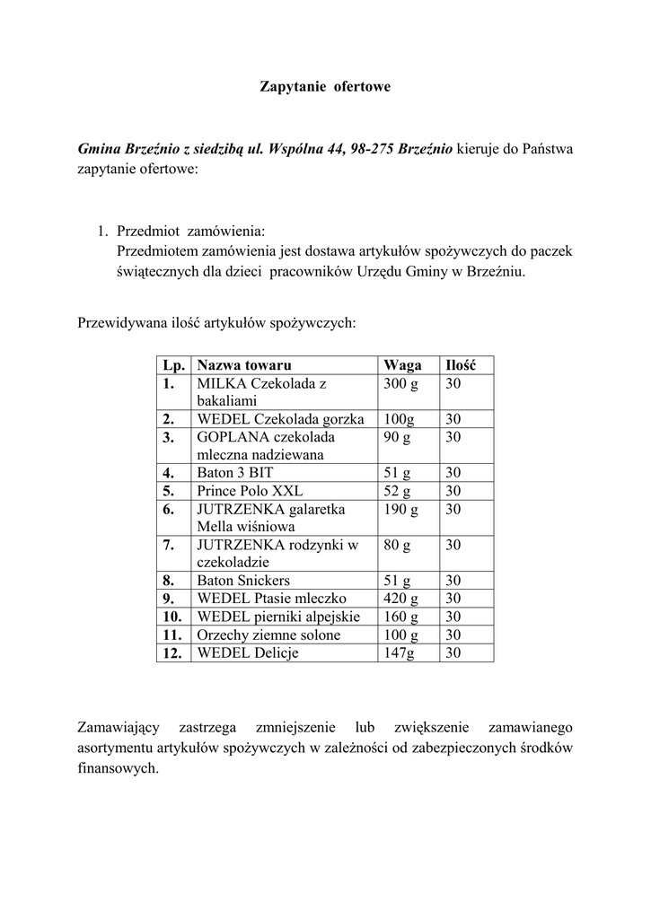 Zapytanie ofertowe Gmina Brzeźnio z siedzibą ul. Wspólna 44, 98-275 Brzeźnio kieruje do Państwa zapytanie ofertowe: 1. Przedmiot zamówienia: Przedmiotem zamówienia jest dostawa artykułów spożywczych do paczek świątecznych dla dzieci pracowników Urzędu Gminy w Brzeźniu. Przewidywana ilość artykułów spożywczych: Lp. Nazwa towaru 1. MILKA Czekolada z bakaliami 2. WEDEL Czekolada gorzka 3. GOPLANA czekolada mleczna nadziewana 4. Baton 3 BIT 5. Prince Polo XXL 6. JUTRZENKA galaretka Mella wiśniowa 7. JUTRZENKA rodzynki w czekoladzie 8. Baton Snickers 9. WEDEL Ptasie mleczko 10. WEDEL pierniki alpejskie 11. Orzechy ziemne solone 12. WEDEL Delicje Waga 300 g Ilość 30 100g 90 g 30 30 51 g 52 g 190 g 30 30 30 80 g 30 51 g 420 g 160 g 100 g 147g 30 30 30 30 30 Zamawiający zastrzega zmniejszenie lub zwiększenie zamawianego asortymentu artykułów spożywczych w zależności od zabezpieczonych środków finansowych. 2. Miejsce dostawy: Urząd Gminy Brzeźnio, ul. Wspólna 44, 98-275 Brzeźnio 3. Termin realizacji dostawy: do 19.12.2011 r. 4. Warunki płatności: Przelew bankowy na rachunek Dostawcy wskazany w fakturze w terminie do 14 dni od daty otrzymania prawidłowo wystawionej faktury. 5. Informacje dodatkowe: - Zamawiający wybierze ofertę Dostawcy, który zaoferuje najkorzystniejszą cenę brutto ogółem. Ofertę cenową należy złożyć w Sekretariacie Urzędu Gminy w Brzeźniu, ul.Wspólna 44, 98-275 Brzeźnio, I piętro, pok. 17 w formie pisemnej w zamkniętej kopercie oznaczonej danymi Dostawcy (pieczęć firmowa) oraz napisem „Dostawa artykułów spożywczych”. Termmin składania ofert: Do dnia 12.12.2011r. Formularz ofertowy Oferujemy wykonanie dostawy artykułów spożywczych będących przedmiotem zamówienia za cenę jednostkową (na dzień składania ofert) Lp. Nazwa towaru 1. 2. 3. 4. 5. 6. 7. 8. 9. 10. 11. 12. 13. 14. BARON czekolada mleczna MILKA Czekolada z bakaliami WEDEL Czekolada gorzka GOPLANA czekolada mleczna nadziewana Baton 3 BIT Prince Polo XXL JUTRZENKA galaretka Mella wiśniowa JUTRZENKA rodzynki w czekoladzie Baton Bounty Baton Snickers WEDEL Ptasie mleczko WEDEL pierniki alpejskie Orzechy ziemne solone WEDEL Delicje Waga Ilość 100 g 300 g 30 30 100g 90 g 30 30 51 g 52 g 190 g 30 30 30 80 g 30 57 g 51 g 420 g 160 g 100 g 147g 30 30 30 30 30 30 Cena Cena jednost. brutto brutto ogółem Razem: 1. Miejsce dostawy: Urząd Gminy Brzeźnio, ul. Wspólna 44, 98-275 Brzeźnio 2. Termin realizacji dostawy: do 19.12.2011 r. 3. Warunki płatności: Przelew bankowy na rachunek Dostawcy wskazany w fakturze w terminie do 14 dni od daty otrzymania prawidłowo wystawionej faktury. .................................................... (pieczęć i podpis Dostawcy)