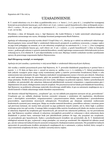Sygnatura akt V Ka 116/14 UZASADNIENIE R. T. został oskarżony o to, iż w dniu 13 października 2011 r. w barze (...) w Ł. przy ul. (...) urządzał bez wymaganej koncesji na prowadzenie kasyna gry, czyli wbrew art. 6 ust. 1 ustawy o grach hazardowych z dnia 19 listopada 2009 r. (Dz.U. z 2009 r., Nr 201, poz. 1540) gry na automacie H. (...) o numerze (...), tj. o przestępstwo skarbowe określone w art. 107 §1 kks. Wyrokiem z dnia 18 listopada 2013 r. Sąd Rejonowy dla Łodzi-Widzewa w Łodzi uniewinnił oskarżonego od popełnienia zarzucanego mu czynu, obciążając kosztami postępowania Skarb Państwa. Apelację od wskazanego powyżej wyroku złożył I Urząd Celny w Ł., skarżąc go w całości na niekorzyść oskarżonego. Rozstrzygnięciu temu zarzucił błąd w ustaleniach faktycznych przyjętych za podstawę orzeczenia, a mający wpływ na jego treść polegający na uznaniu, że to nie oskarżony urządzał gry na automacie H. (...) o nr (...) bez wymaganej koncesji na prowadzenie kasyna gry, czyli wbrew art. 6 ust. 1 ustawy „o grach hazardowych” z dnia 19 listopada 2009 r., podczas gdy zebrany w sprawie materiał dowodowy, zasady logicznego rozumowania i doświadczenie życiowe wskazują na to, iż to właśnie R. T. jest odpowiedzialny za ten czyn. Skarżący wniósł o uchylenie wyroku i przekazanie sprawy do ponownego rozpoznania Sądowi Rejonowemu. Sąd Okręgowy zważył, co następuje: Apelacja nie jest zasadna, a postawiony w niej zarzut błędu w ustaleniach faktycznych jest chybiony. Jak wynika z ustaleń poczynionych przez Sąd Rejonowy, R. T. prowadzi działalność gospodarczą w postaci baru o nazwie (...). W dniu 20 lipca 2011 r. zawarł on umowę za spółką z o.o. (...) z siedzibą w T., której przedmiotem było jedynie wynajęcie przez niego wyżej wymienionej spółce 3 metrów powierzchni kwadratowej lokalu w celu umieszczenia tam automatów do gier. Najemca miał płacić wynajmującemu czynsz w kwocie 300 złotych. Oskarżony nie miał natomiast dostępu do automatu, gdyż nie posiadał klucza umożliwiającego wyjmowanie wrzucanych do niego pieniędzy. Środki te były pobierane prze inne osoby, działające na polecenie najemcy. Żaden z przesłuchanych świadków nie potwierdził, aby oskarżony dokonywał jakichkolwiek czynności związaniem z organizowaniem gier i objaśnieniem ich zasad, obsługiwaniem samych urządzeń. Nie przystosowywał też lokalu pod działalność hazardową. Sąd Rejonowy na podstawie zebranego materiału dowodowego ustalił także, iż gra na automacie znajdującym się w chwili kontroli w lokalu oskarżonego miała charakter zręcznościowy. Jak słusznie wskazał Sąd Rejonowy, „urządzanie” gry, czy też zakładu jest pojęciem szerszym niż jej „prowadzenie”. Urządzanie gry czy zakładu obejmuje bowiem czynności związane z ustaleniem ich regulaminu, określeniem praw i obowiązków uczestników, zorganizowaniem i przystosowaniem lokalu, zatrudnieniem i przeszkoleniem pracowników, zapewnieniem stosownych zabezpieczeń. Prowadzenie gry obejmuje natomiast realizowanie konkretnych czynności przy samej grze. Mając na uwadze materiał dowodowy, prawidłowo zebrany i oceniony przez sąd pierwszej instancji, nie można było poczynić na jego podstawie innych ustaleń, niż te, które legły u podstaw wydanego przez ten sąd wyroku. Z samego faktu wynajęcia kilku metrów kwadratowych lokalu nie można wywodzić, iż oskarżony dopuścił się urządzania gier hazardowych, jak zarzucił mu oskarżyciel publiczny, czy też prowadzenia gier. Sąd Rejonowy zasadnie wskazał, iż oskarżony niewątpliwie prowadził we wskazanej w akcie oskarżenia dacie działalność w postaci baru, natomiast brak jest jakichkolwiek podstaw do tego, aby przypisać mu urządzanie, czy prowadzenie gier hazardowych. Żaden z przesłuchiwanych świadków nie potwierdził, aby R. T. kiedykolwiek obsługiwał automat do gier, wyjmował z niego pieniądze, czy nawet go uruchomił. Nie objaśniał też nikomu zasad gry, ani nie wykonywał żadnych innych czynności związanych z funkcjonowaniem automatu. Nie posiadał też żadnych uprawnień do pozyskiwania środków pieniężnych znajdujących się w automacie, a jedyny dochód, który czerpał w racji wstawienia urządzenia do baru, wynikał z zawartej umowy najmu. Zarzut błędu w ustaleniach faktycznych nie może sprowadzać się tylko do zakwestionowania stanowiska sądu pierwszej instancji, czy też do polemiki z ustaleniami sądu, lecz powinien wskazywać nieprawidłowości w rozumowaniu sądu co do oceny okoliczności sprawy. Sama możliwość przeciwstawienia ustaleniom sądu odmiennego poglądu nie uzasadnia wniosku o popełnieniu przez sąd błędu w ustaleniach faktycznych (wyrok SA w Krakowie z dnia 19 maja 2009 r., IIAKa 73/09, KZS 2009, nr. 9, poz. 52, podobnie także m.in. SN w wyroku z dnia 24 marca 1975 r. II KR 355/74 oraz SA w K. z wyroku z dnia 14 maja 2008 r. IIAKa 50/08). W ocenie Sądu Okręgowego zarzut apelacyjny postawiony przez skarżącego stanowi jedynie polemikę z prawidłowo poczynionymi przez Sąd Rejonowy ustaleniami faktycznymi. Rozstrzygnięcie Sądu Rejonowego, uniewinniające oskarżonego od popełnienia zarzucanego mu czynu zakwalifikowanego z art. 107 § 1 kks, było prawidłowe jeszcze z innych powodów, które nie były wprawdzie podstawą wyroku, ani też zarzutu apelacyjnego, tym niemniej jednak wymagają poświęcenia im uwagi. Sąd Okręgowy stoi bowiem na stanowisku, iż w aktualnym stanie prawnym, z przyczyn, o których będzie mowa poniżej, polskie sądy winny odmawiać zastosowania tych przepisów ustawy hazardowej, które podlegały obowiązkowi notyfikacji Komisji Europejskiej zgodnie z przepisami dyrektywy 98/34 Parlamentu i Rady z dnia 22 czerwca 1998 r. ustanawiającej procedurę udzielania informacji w dziedzinie norm i przepisów technicznych oraz zasad dotyczących usług społeczeństwa informacyjnego, lecz notyfikowane