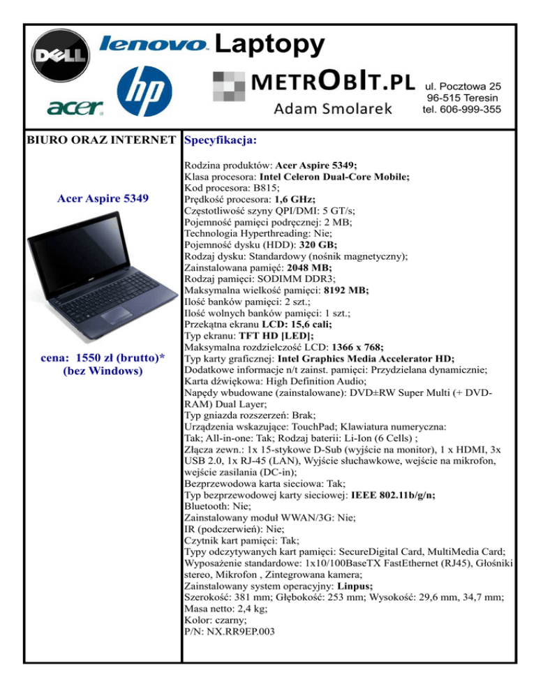 Laptopy ul. Pocztowa 25 96-515 Teresin tel. 606-999-355 BIURO ORAZ INTERNET Specyfikacja: Acer Aspire 5349 cena: 1550 zł (brutto)* (bez Windows) Rodzina produktów: Acer Aspire 5349; Klasa procesora: Intel Celeron Dual-Core Mobile; Kod procesora: B815; Prędkość procesora: 1,6 GHz; Częstotliwość szyny QPI/DMI: 5 GT/s; Pojemność pamięci podręcznej: 2 MB; Technologia Hyperthreading: Nie; Pojemność dysku (HDD): 320 GB; Rodzaj dysku: Standardowy (nośnik magnetyczny); Zainstalowana pamięć: 2048 MB; Rodzaj pamięci: SODIMM DDR3; Maksymalna wielkość pamięci: 8192 MB; Ilość banków pamięci: 2 szt.; Ilość wolnych banków pamięci: 1 szt.; Przekątna ekranu LCD: 15,6 cali; Typ ekranu: TFT HD [LED]; Maksymalna rozdzielczość LCD: 1366 x 768; Typ karty graficznej: Intel Graphics Media Accelerator HD; Dodatkowe informacje n/t zainst. pamięci: Przydzielana dynamicznie; Karta dźwiękowa: High Definition Audio; Napędy wbudowane (zainstalowane): DVD±RW Super Multi (+ DVDRAM) Dual Layer; Typ gniazda rozszerzeń: Brak; Urządzenia wskazujące: TouchPad; Klawiatura numeryczna: Tak; All-in-one: Tak; Rodzaj baterii: Li-Ion (6 Cells) ; Złącza zewn.: 1x 15-stykowe D-Sub (wyjście na monitor), 1 x HDMI, 3x USB 2.0, 1x RJ-45 (LAN), Wyjście słuchawkowe, wejście na mikrofon, wejście zasilania (DC-in); Bezprzewodowa karta sieciowa: Tak; Typ bezprzewodowej karty sieciowej: IEEE 802.11b/g/n; Bluetooth: Nie; Zainstalowany moduł WWAN/3G: Nie; IR (podczerwień): Nie; Czytnik kart pamięci: Tak; Typy odczytywanych kart pamięci: SecureDigital Card, MultiMedia Card; Wyposażenie standardowe: 1x10/100BaseTX FastEthernet (RJ45), Głośniki stereo, Mikrofon , Zintegrowana kamera; Zainstalowany system operacyjny: Linpus; Szerokość: 381 mm; Głębokość: 253 mm; Wysokość: 29,6 mm, 34,7 mm; Masa netto: 2,4 kg; Kolor: czarny; P/N: NX.RR9EP.003 BIURO ORAZ INTERNET Specyfikacja: Fujitsu Lifebook A531 cena: 1595 zł (brutto)* (bez Windows) Rodzina produktów: Lifebook A; Klasa procesora: Intel Pentium Dual-Core Mobile; Kod procesora: B960; Prędkość procesora: 2,2 GHz; Częstotliwość szyny QPI/DMI: 5 GT/s; Pojemność pamięci podręcznej: 2 MB; Technologia Hyperthreading: Nie; Pojemność dysku (HDD): 320 GB; Rodzaj dysku: Standardowy (nośnik magnetyczny); Zainstalowana pamięć: 2048 MB; Rodzaj pamięci: SODIMM DDR3; Częstotliwość szyny pamięci: 1333 MHz; Maksymalna wielkość pamięci: 8192 MB; Ilość banków pamięci: 2 szt.; Ilość wolnych banków pamięci: 1 szt.; Przekątna ekranu LCD: 15,6 cali; Typ ekranu: TFT WXGA [LED] Anti-Glare; Maksymalna rozdzielczość LCD: 1366 x 768; Typ karty graficznej: Intel Graphics Media Accelerator HD; Dodatkowe informacje n/t zainst. pamięci: Przydzielana dynamicznie; Karta dźwiękowa: Realtek ALC269; Napędy wbudowane (zainstalowane): DVD±RW Super Multi (+ DVDRAM) Dual Layer; Typ gniazda rozszerzeń: 1 x Express Card 54/34; Urządzenia wskazujące: TouchPad; Klawiatura numeryczna: Tak; All-in-one: Tak; Rodzaj baterii: Li-Ion (6 Cells) ; Złącza zewn.: 1x 15-stykowe D-Sub (wyjście na monitor), 1 x HDMI, 3x USB 2.0, 1x RJ-45 (LAN), Wyjście słuchawkowe, wejście na mikrofon, wejście zasilania (DC-in); Bezprzewodowa karta sieciowa: Tak; Typ bezprzewodowej karty sieciowej: IEEE 802.11b/g/n; Bluetooth: Tak; Zainstalowany moduł WWAN/3G: Nie; IR (podczerwień): Nie; Czytnik kart pamięci: Tak; Typy odczytywanych kart pamięci: SecureDigital Card, SecureDigital Card High-Capacity (SDHC), MemoryStick, MemoryStick Pro; Wyposażenie standardowe: 1x10/100/1000BaseT Gigabitethernet (RJ45), Głośniki stereo, Mikrofon , Zintegrowana kamera; Zainstalowany system operacyjny: Brak; Szerokość: 378 mm; Głębokość: 252 mm; Wysokość: 36,5 mm; Masa netto: 2,5 kg; P/N: VFY:A5310MRKA5PL BIURO ORAZ INTERNET Specyfikacja: Rodzina produktów: Lenovo B570e; Klasa procesora: Intel Celeron Dual-Core Mobile; Kod procesora: B800; Prędkość procesora: 1,5 GHz; Częstotliwość szyny QPI/DMI: 5 GT/s; Lenovo B570e – 2GB RAM Pojemność pamięci podręcznej: 2 MB; Technologia Hyperthreading: Nie; Pojemność dysku (HDD): 320 GB; Rodzaj dysku: Standardowy (nośnik magnetyczny); Zainstalowana pamięć: 2048 MB; Rodzaj pamięci: SODIMM DDR3; Częstotliwość szyny pamięci: 1333 MHz; Maksymalna wielkość pamięci: 4096 MB; Ilość banków pamięci: 1 szt.; Ilość wolnych banków pamięci: 0 szt.; Przekątna ekranu LCD: 15,6 cali; Typ ekranu: TFT HD [LED]; cena: 1829 zł (brutto)* Maksymalna rozdzielczość LCD: 1366 x 768; Typ karty graficznej: Intel Graphics Media Accelerator HD; Dodatkowe informacje n/t zainst. pamięci: Przydzielana dynamicznie; Karta dźwiękowa: Realtek ALC272; Napędy wbudowane (zainstalowane): DVD±RW Super Multi (+ DVDRAM) Dual Layer; Typ gniazda rozszerzeń: Brak; Urządzenia wskazujące: TouchPad; Klawiatura numeryczna: Nie; All-in-one: Tak; Rodzaj baterii: Li-Ion (6 Cells) ; Złącza zewn.: 1x 15-stykowe D-Sub (wyjście na monitor), 3x USB 2.0, 1x RJ-45 (LAN), 1x E-SATA/USB Combo, Wyjście słuchawkowe, wejście na mikrofon, wejście zasilania (DC-in); Bezprzewodowa karta sieciowa: Tak; Typ bezprzewodowej karty sieciowej: IEEE 802.11b/g/n; Bluetooth: Nie; Zainstalowany moduł WWAN/3G: Nie; IR (podczerwień): Nie; Czytnik kart pamięci: Nie; Wyposażenie standardowe: 1x10/100/1000BaseT Gigabitethernet (RJ45), Głośniki stereo, Mikrofon , Zintegrowana kamera; Zainstalowany system operacyjny: Microsoft Windows 7 Home Premium PL 64-bit; Szerokość: 378 mm; Głębokość: 252 mm; Wysokość: 33,1 mm; Masa netto: 2,4 kg; Kolor: czarny; P/N: 59-325602 BIURO ORAZ INTERNET Specyfikacja Rodzina produktów: Lenovo B570e; Klasa procesora: Intel Pentium Dual-Core Mobile; Kod procesora: B960; Prędkość procesora: 2 GHz; Lenovo B570e – 4GB RAM Częstotliwość szyny QPI/DMI: 5 GT/s; Pojemność pamięci podręcznej: 2 MB; Technologia Hyperthreading: Nie; Pojemność dysku (HDD): 320 GB; Rodzaj dysku: Standardowy (nośnik magnetyczny); Zain