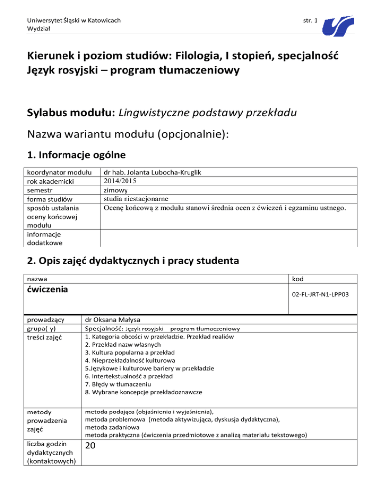 Uniwersytet Śląski w Katowicach Wydział str. 1 Kierunek i poziom studiów: Filologia, I stopień, specjalność Język rosyjski – program tłumaczeniowy Sylabus modułu: Lingwistyczne podstawy przekładu Nazwa wariantu modułu (opcjonalnie): 1. Informacje ogólne koordynator modułu rok akademicki semestr forma studiów sposób ustalania oceny końcowej modułu informacje dodatkowe dr hab. Jolanta Lubocha-Kruglik 2014/2015 zimowy studia niestacjonarne Ocenę końcową z modułu stanowi średnia ocen z ćwiczeń i egzaminu ustnego. 2. Opis zajęć dydaktycznych i pracy studenta nazwa kod ćwiczenia 02-FL-JRT-N1-LPP03 prowadzący grupa(-y) treści zajęć dr Oksana Małysa Specjalność: Język rosyjski – program tłumaczeniowy metody prowadzenia zajęć metoda podająca (objaśnienia i wyjaśnienia), metoda problemowa (metoda aktywizująca, dyskusja dydaktyczna), metoda zadaniowa metoda praktyczna (ćwiczenia przedmiotowe z analizą materiału tekstowego) liczba godzin dydaktycznych (kontaktowych) 20 1. Kategoria obcości w przekładzie. Przekład realiów 2. Przekład nazw własnych 3. Kultura popularna a przekład 4. Nieprzekładalność kulturowa 5.Językowe i kulturowe bariery w przekładzie 6. Intertekstualność a przekład 7. Błędy w tłumaczeniu 8. Wybrane koncepcje przekładoznawcze Uniwersytet Śląski w Katowicach Wydział liczba godzin pracy własnej studenta opis pracy własnej studenta organizacja zajęć literatura obowiązkowa literatura uzupełniająca adres strony www zajęć str. 2 40 samodzielna realizacja wskazanych partii materiału oraz lektura wskazanych opracowań, lingwistyczna analiza translatorska wybranych przez wykładowcę przykładów, powtórka i ugruntowanie materiału przedstawionego na zajęciach, przygotowanie przez studenta prezentacji na zadany temat. 10 zajęć w semestrze.Wielkość jednostki zajęć: 90 minut Jednostki kontaktowe zgodnie z harmonogramem zajęć Instytutu Filologii Wschodniosłowiańskiej Uniwersytetu Śląskiego. 1. B. Kielar: Zarys translatoryki. Warszawa 2003 2. K. Lipiński: Vademecum tłumacza. Kraków 2006 3. K. Hejwowski: Kognitywno-komunikacyjna teoria przekładu. Warszawa 2006 4. A. Pisarska. T. Tomaszkiewicz: Współczesne tendencje przekładoznawcze. Poznań 1996 5. R. Lewicki: Obcość w odbiorze przekładu. Lublin 2000. 6. Mała encyklopedia przekładoznawstwa. Pod red. U. Dąmbskiej-Prokop. Częstochowa 2000 7. H. Burkhardt: Przekład zwierciadłem językowego i kulturowego obrazu świata (na przykładzie «Imperium» Ryszarda Kapuścińskiego). W: Język a kultura. Tom 13. Wrocław 2000, s.261-270. <wersja elektroniczna: http://www.lingwistyka.uni.wroc.pl/jk/> 8. E. Tabakowska: Bariery kulturowe zbudowane są z przekładu. W: Przekład. Język. Kultura. Lublin 2002, s. 25-33. 9.U. Zaliwska-Okrutna: Patty, Patricka czy Patrycja? Antroponimy jako problem tłumaczeniowy i glottodydaktyczny. W: Język rodzimy a język obcy. Komunikacja. Przekład. Dydaktyka. Warszawa 2002, s. 247-255. 10. E. Rajewska: Zakorzenienie” przekładu a polskie tłumaczenia „Winnie-the-Pooh” Alexandra Alana Milne’a. W: Przekład w historii literatury. Red. P. Fast. Katowice 2002, s. 5971. 11. K. Lipiński: Mity Przekładoznawstwa. Rozdział: Mit brzydkiego kaczątka/gorszości. Czy przekład może być gorszy od oryginału? Rozważania na temat tłumaczeń Winnie-the-Pooh (Kubusia Puchatka) na język polski, niemiecki i czeski. Kraków 2004, s.60-77. 12. K. Hejwowski: Źródła błędów w tłumaczeniu na język ojczysty. W: Język rodzimy a język obcy. Komunikacja. Przekład. Dydaktyka. Warszawa 2002, s. 149-159 13.Z. Kozłowska: O błędach językowych w tekstach polskich przekładów. W: Język rodzimy a język obcy. Komunikacja. Przekład. Dydaktyka. Warszawa 2002, s.137-147. 14. J. Lubocha-Kruglik, O. Małysa: Potyczki z przekładem, czyli Akunin po polsku. W: Kultura popularna a przekład. Red. P. Fast. Katowice2005, s.91-102 1. E. Manasterska-Wiącek: Polska poezja dla dzieci w przekładach na język rosyjski. Na podstawie wierszy Juliana Tuwim i Jana Brzechwy. Lublin 2009. 2. Przekład artystyczny a współczesne teorie translatologiczne. Wyd. Śląsk. Katowice 1998. 3.O. Wojtasiewicz. Wstęp do teorii tłumaczenia. Warszawa 1996. 4.P. Bukowski, M. Heydel: Współczesne teorie przekładu. Antologia (wybrane teorie). Kraków 2009. 5. Przekład – język – kultura. Red. R. Lewicki. Lublin 2002 6. Przekładając nieprzekładalne. T.1. Red. W. Kubiński, O. Kubińska, Z. Wolański. Gdańsk 2000 7. Przekładając nieprzekładalne. T.2. Red. W. Kubiński, O. Kubińska. Gdańsk 2004 8. Przekładając nieprzekładalne. O wierności. T.3. Red. W. Kubiński, O. Kubińska. Gdańsk 2007 Uniwersytet Śląski w Katowicach Wydział informacje dodatkowe str. 3 Weryfikacja wiedzy w trakcie zajęć 3. Opis sposobów weryfikacji efektów kształcenia modułu nazwa kod Egzamin ustny kod(-y) zajęć 02-FL-JRT-N1-LPP03 osoba(-y) przeprowadzająca(e) weryfikację grupa(-y) wymagania merytoryczne dr Oksana Małysa kryteria oceny Akcent w ramach egzaminu ustnego położony jest na wiedzę z zakresu kulturowych i językowych barier w przekładzie oraz strategii i technik translatorskich. przebieg procesu weryfikacji Egzamin przeprowadzany jest w formie ustnej i zawiera zestawy składające się z czterech pytań opisowych. Czas trwania egzaminu przewidziany dla jednej osoby: 15-20 minut. Egzamin odbywa się zgodnie z harmonogramem sesji egzaminacyjnej w Instytucie Filologii Wschodniosłowiańskiej Uniwersytetu Śląskiego. informacje dodatkowe Warunkiem przystąpienia do egzaminu jest czynny udział w zajęciach oraz realizacja zleconych przez wykładowcę zadań. Specjalność: Język rosyjski – program tłumaczeniowy umiejętność rozpoznania zjawisk językowych i kulturowych stanowiących źródło nieprzekładalności; znajomość strategii i technik przekładowych stosowanych w tłumaczeniu nazw realiów; posiadanie wiedzy o nazwach w