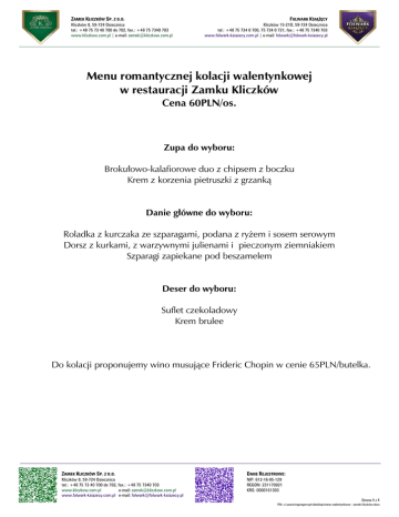 ZAMEK KLICZKÓW SP. Z O.O. FOLWARK KSIĄŻĘCY Kliczków 8, 59-724 Osiecznica tel.: +48 75 73 40 700 do 702, fax.: +48 75 7340 703 www.kliczkow.com.pl | e-mail: [email protected] Kliczków 15-21D, 59-724 Osiecznica tel.: +48 75 734 0 700, 75 734 0 721, fax.: +48 75 7340 703 www.folwark-ksiazecy.com.pl | e-mail: [email protected] Menu romantycznej kolacji walentynkowej w restauracji Zamku Kliczków Cena 60PLN/os. Zupa do wyboru: Brokułowo-kalafiorowe duo z chipsem z boczku Krem z korzenia pietruszki z grzanką Danie główne do wyboru: Roladka z kurczaka ze szparagami, podana z ryżem i sosem serowym Dorsz z kurkami, z warzywnymi julienami i pieczonym ziemniakiem Szparagi zapiekane pod beszamelem Deser do wyboru: Suflet czekoladowy Krem brulee Do kolacji proponujemy wino musujące Frideric Chopin w cenie 65PLN/butelka. ZAMEK KLICZKÓW SP. Z O.O. DANE REJESTROWE: Kliczków 8, 59-724 Osiecznica tel.: +48 75 73 40 700 do 702, fax.: +48 75 7340 703 www.kliczkow.com.pl e-mail: [email protected] www.folwark-ksiazecy.com.pl e-mail: [email protected] NIP: 612-16-85-129 REGON: 231170921 KRS: 0000161303 Strona 1 z 1 Plik: c:\users\mgrzegorczyn\desktop\menu walentynkowe - zamek kliczków.docx