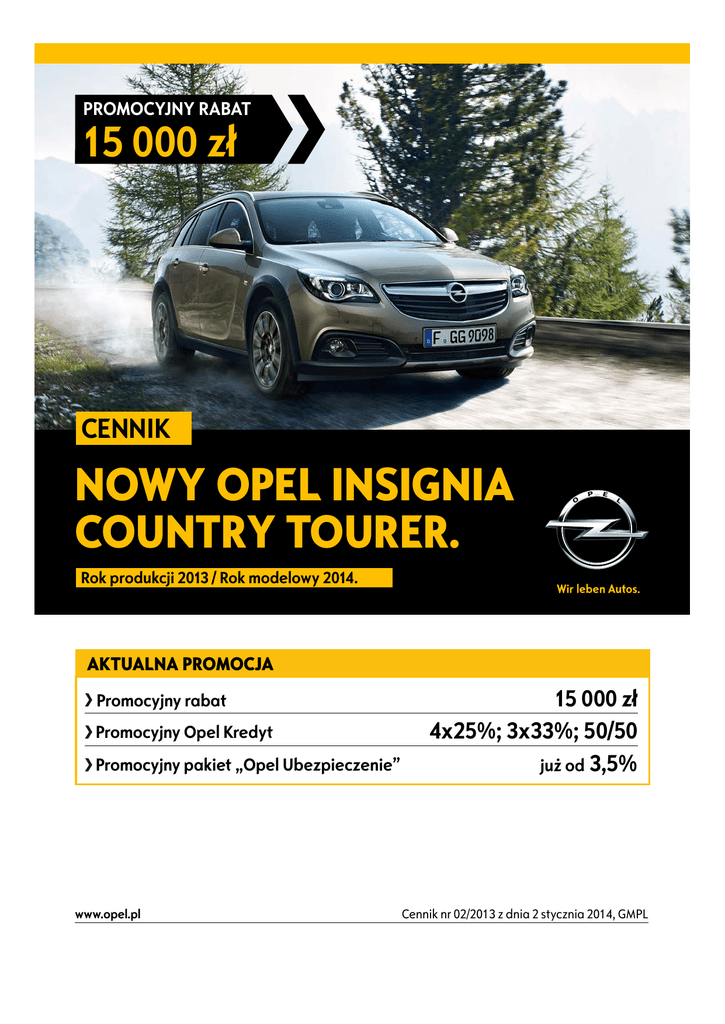 PROMOCYJNY RABAT 15 000 zł CENNIK NOWY OPEL INSIGNIA COUNTRY TOURER. Rok produkcji 2013 / Rok modelowy 2014. AKTUALNA PROMOCJA Promocyjny rabat Promocyjny Opel Kredyt Promocyjny pakiet „Opel Ubezpieczenie” www.opel.pl 15 000 zł 4x25%; 3x33%; 50/50 już od 3,5% Cennik nr 02/2013 z dnia 2 stycznia 2014, GMPL Cennik – Nowy Opel Insignia Country Tourer 4x4 Rok produkcji 2013, rok modelowy 2014 Ceny promocyjne* Country Tourer 2.0 Turbo Ecotec (250 KM) Start/Stop 4x4 M6 142 350 2.0 Turbo Ecotec (250 KM) 4x4 A6 147 450 2.0 CDTI Ecotec (163 KM) Start/Stop 4x4 M6 129 150 2.0 CDTI Ecotec (163 KM) 4x4 A6 134 250 2.0 CDTI BiTurbo Ecotec (195 KM) 4x4 A6 143 750 * Liczba modeli w promocji ograniczona. Promocja dostępna do wyczerpania zapasów. Dokładny opis całej oferty promocyjnej znajduje się na stronie www.opel.pl w sekcji promocje lub dostępny jest u Autoryzowanego Dystrybutora marki Opel. Ceny promocyjne dotyczą klientów indywidualnych. Klientów flotowych w sprawie zapytań ofertowych prosimy o kontakt z wybranym Autoryzowanym Dystrybutorem marki Opel. Ceny katalogowe Country Tourer 2.0 Turbo Ecotec (250 KM) Start/Stop 4x4 M6 157 350 2.0 Turbo Ecotec (250 KM) 4x4 A6 162 450 2.0 CDTI Ecotec (163 KM) Start/Stop 4x4 M6 144 150 2.0 CDTI Ecotec (163 KM) 4x4 A6 149 250 2.0 CDTI BiTurbo Ecotec (195 KM) 4x4 A6 158750 Wyposażenie standardowe System stabilizacji toru jazdy ESP® Poduszki powietrzne przednie, boczne i kurtynowe Zdalnie sterowany zamek centralny Elektrycznie sterowane szyby z przodu i z tyłu Elektrycznie sterowane i podgrzewane lusterka zewnętrzne Relingi dachowe, srebrne Chromowana listwa ozdobna wokół okien bocznych Dwie widoczne chromowane końcówki układu wydechowego (niedostępne z silnikiem 2.0 CDTI 163 KM) Klimatyzacja dwustrefowa sterowana elektronicznie System multimedialny IntelliLink R700 Touch z 2xUSB i Bluetooth® (zestaw głośnomówiący), podwójny tuner radiowy, kolorowy ekran dotykowy 8,0”, czytnik kart SD, sterowanie komendami głosowymi (tylko jęz. ang./niem.), 7 głośników, antena typu „płetwa rekina”. Wyświetlacz wskaźników kierowcy DIC 4,2” Tempomat z funkcją ogranicznika prędkości Hamulec postojowy sterowany elektrycznie, w wersjach ze skrzynią manualną z układem wspomagania ruszania na pochyłościach Kierownica pokryta skórą z przyciskami sterowania systemami multimedialnymi i komputerem pokładowym Tapicerka materiałowa Quantum/Atlantis, czarna z elementami ze skóry sztucznej Morrocana. Zawiera: komfortowe fotele przednie. Elektryczna regulacja wysokości i podparcia lędźwiowego fotela kierowcy Podgrzewane fotele przednie Podłokietnik tylny z otworem na długie przedmioty Gniazdko 12V w konsoli centralnej / z tyłu konsoli środkowej Zestaw „Dobrej Widoczności”. Zawiera: automatyczne sterowanie światłami z czujnikiem oświetlenia, czujnik deszczu, światłoczułe lusterko wewnętrzne. Pakiet Bezpieczeństwa. Zawiera: aktywne zagłówki foteli przednich, system przypominania o zapięciu pasów bezpieczeństwa z przodu. Obręcze kół ze stopów lekkich 8,0Jx18" z oponami 245/45 R18 96W Podwyższone zawieszenie z adaptacyjnym układem jezdnym FlexRide Kolumny HiPerStrut w zawieszeniu przednim (tylko w wersjach z silnikiem 2.0 Turbo 250 KM) Układ napędowy 4x4 z elektronicznie sterowanym mechanizmem różnicowym o podwyższonym tarciu wewnętrznym eLSD Dolna osłona ochronna silnika Światła do jazdy dziennej LED Reflektory przeciwmgielne Wyposażenie dodatkowe NADWOZIE Lakier metaliczny / perłowy Elektrycznie sterowane, składane i podgrzewane lusterka zewnętrzne, światłoczułe lusterko kierowcy Elektrycznie sterowane drzwi bagażnika Panoramiczne okno dachowe sterowane elektrycznie Przyciemniane szyby boczne tylne oraz szyba tylna Izotermiczna szyba przednia odbijająca promienie słoneczne Hak holowniczy – składany Reflektory biksenonowe AFL+ ze spryskiwaczami reflektorów Nadwozie – zawieszenie i koła Zapasowe koło dojazdowe 17” Obręcze kół ze stopów lekkich 19x8,5", z oponami 245/40 R19 98Y Cennik Nowego Opla Insignii Country Tourer, rok produkcji 2013, rok modelowy 2014, nr 02/2013 z dnia 2 stycznia 2014 Country Tourer FX3 AY0 ATG AXG/AEF/AER DWE V3E MDE XX14 CJ2 S S S S S S S S S IO5 S UDD K33 J71+KB5/XIBP N34 TALM A6A+APG KA1 DA1 KD4/KPA S S S S S S S S S TSQ S OCY S PXR+RKP XJ2/XJ6+F45 GNB F46+G96 XL4 T7E T3U S S S/S S S S DWH TB5 C3U AKO AKL VK0 T4F RV9 2 500 850/P 1 000 4 500 800/P 800/P 3 000 4 500/P 350 2 200/P 1/3 Wyposażenie dodatkowe (cd.) Country Tourer WNĘTRZE – tapicerki, fotele i wewnętrzne elementy ozdobne Tapicerka materiałowa Ribbon/Atlantis, czarna. Z awiera: sportowe fotele przednie. Tapicerka Siena, skóra naturalna łączona ze skórą sztuczną, czarna lub beżowa. Komfortowe fotele przednie, podgrzewane fotele przednie Tapicerka perforowana Siena, skóra naturalna łączona ze skórą sztuczną, czarna lub beżowa. Sportowe fotele przednie, fotel kierowcy AGR, podgrzewane fotele przednie, regulacja długości siedzisk foteli przednich. Tapicerka premium Indian Night czarna lub Brandy brązowa, skóra naturalna. Sportowe fotele przednie AGR, podgrzewane fotele przednie, regulacja długości siedzisk foteli przednich, elektryczna regulacja wysokości i podparcia lędźwiowego foteli kierowcy i pasażera. Wewnętrzne elementy ozdobne „Diamo Black”. Tapicerka perforowana premium Indian Night czarna lub Brandy brązowa, skóra naturalna. Sportowe fotele przednie AGR, wentylowane i podgrzewane fotele przednie, regulacja długości siedzisk foteli przednich, elektryczna regulacja wysokości i podparcia lędźwiowego foteli kierowcy i pasażera. Wewnętrzne elementy ozdobne „Diamo Black”. Wentylowane fotele przednie (tylko ze skórą perforowaną Siena) Regulacja długości siedzisk fotela kierowcy/pasażera Elektryczna regulacja wysokości i podparcia lędźwiowego fotela pasażera Elektryczna regulacja fotela kierowcy. Zawiera: elektrycznie regulowane, sk