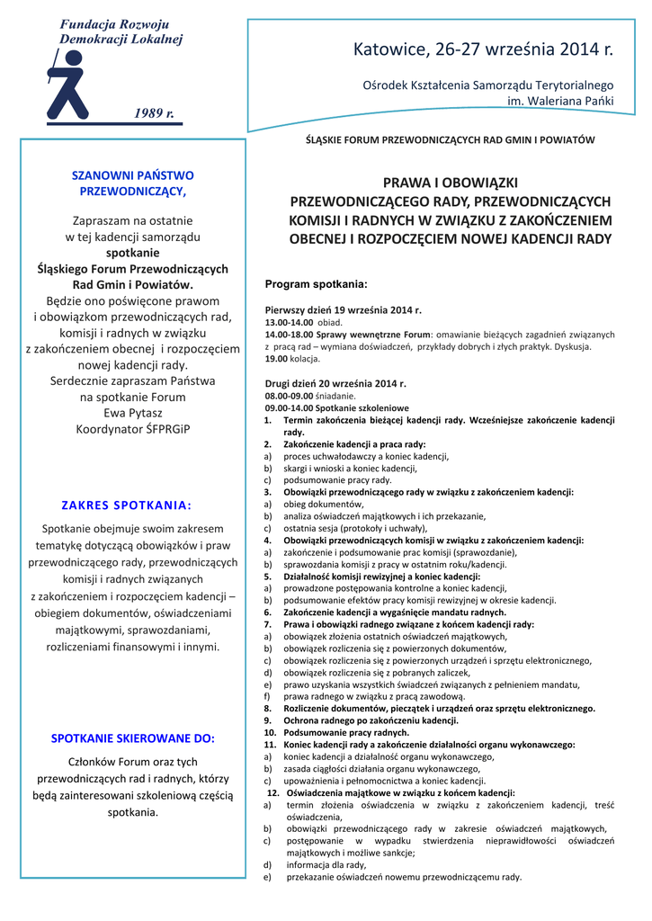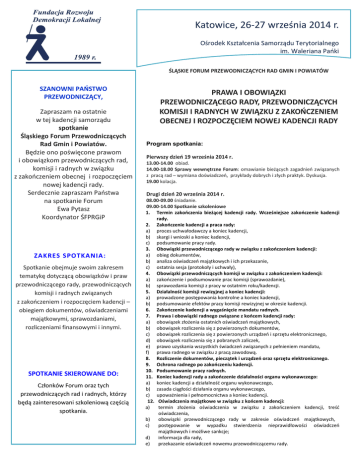 Rozwiązania informatyczne Katowice, 26-27 września 2014 r. Ośrodek Kształcenia Samorządu Terytorialnego im. Waleriana Pańki ŚLĄSKIE FORUM PRZEWODNICZĄCYCH RAD GMIN I POWIATÓW SZANOWNI PAŃSTWO PRZEWODNICZĄCY, Zapraszam na ostatnie w tej kadencji samorządu spotkanie Śląskiego Forum Przewodniczących Rad Gmin i Powiatów. Będzie ono poświęcone prawom i obowiązkom przewodniczących rad, komisji i radnych w związku z zakończeniem obecnej i rozpoczęciem nowej kadencji rady. Serdecznie zapraszam Państwa na spotkanie Forum Ewa Pytasz Koordynator ŚFPRGiP ZAKRES SPOTKANIA: Spotkanie obejmuje swoim zakresem tematykę dotyczącą obowiązków i praw przewodniczącego rady, przewodniczących komisji i radnych związanych z zakończeniem i rozpoczęciem kadencji – obiegiem dokumentów, oświadczeniami majątkowymi, sprawozdaniami, rozliczeniami finansowymi i innymi. SPOTKANIE SKIEROWANE DO: Członków Forum oraz tych przewodniczących rad i radnych, którzy będą zainteresowani szkoleniową częścią spotkania. PRAWA I OBOWIĄZKI PRZEWODNICZĄCEGO RADY, PRZEWODNICZĄCYCH KOMISJI I RADNYCH W ZWIĄZKU Z ZAKOŃCZENIEM OBECNEJ I ROZPOCZĘCIEM NOWEJ KADENCJI RADY Program spotkania: Pierwszy dzień 19 września 2014 r. 13.00-14.00 obiad. 14.00-18.00 Sprawy wewnętrzne Forum: omawianie bieżących zagadnień związanych z pracą rad – wymiana doświadczeń, przykłady dobrych i złych praktyk. Dyskusja. 19.00 kolacja. Drugi dzień 20 września 2014 r. 08.00-09.00 śniadanie. 09.00-14.00 Spotkanie szkoleniowe 1. Termin zakończenia bieżącej kadencji rady. Wcześniejsze zakończenie kadencji rady. 2. Zakończenie kadencji a praca rady: a) proces uchwałodawczy a koniec kadencji, b) skargi i wnioski a koniec kadencji, c) podsumowanie pracy rady. 3. Obowiązki przewodniczącego rady w związku z zakończeniem kadencji: a) obieg dokumentów, b) analiza oświadczeń majątkowych i ich przekazanie, c) ostatnia sesja (protokoły i uchwały), 4. Obowiązki przewodniczących komisji w związku z zakończeniem kadencji: a) zakończenie i podsumowanie prac komisji (sprawozdanie), b) sprawozdania komisji z pracy w ostatnim roku/kadencji. 5. Działalność komisji rewizyjnej a koniec kadencji: a) prowadzone postępowania kontrolne a koniec kadencji, b) podsumowanie efektów pracy komisji rewizyjnej w okresie kadencji. 6. Zakończenie kadencji a wygaśnięcie mandatu radnych. 7. Prawa i obowiązki radnego związane z końcem kadencji rady: a) obowiązek złożenia ostatnich oświadczeń majątkowych, b) obowiązek rozliczenia się z powierzonych dokumentów, c) obowiązek rozliczenia się z powierzonych urządzeń i sprzętu elektronicznego, d) obowiązek rozliczenia się z pobranych zaliczek, e) prawo uzyskania wszystkich świadczeń związanych z pełnieniem mandatu, f) prawa radnego w związku z pracą zawodową. 8. Rozliczenie dokumentów, pieczątek i urządzeń oraz sprzętu elektronicznego. 9. Ochrona radnego po zakończeniu kadencji. 10. Podsumowanie pracy radnych. 11. Koniec kadencji rady a zakończenie działalności organu wykonawczego: a) koniec kadencji a działalność organu wykonawczego, b) zasada ciągłości działania organu wykonawczego, c) upoważnienia i pełnomocnictwa a koniec kadencji. 12. Oświadczenia majątkowe w związku z końcem kadencji: a) termin złożenia oświadczenia w związku z zakończeniem kadencji, treść oświadczenia, b) obowiązki przewodniczącego rady w zakresie oświadczeń majątkowych, c) postępowanie w wypadku stwierdzenia nieprawidłowości oświadczeń majątkowych i możliwe sankcje; d) informacja dla rady, e) przekazanie oświadczeń nowemu przewodniczącemu rady. 13. Oświadczenia majątkowe w nowej kadencji: a) termin złożenia oświadczenia w nowej kadencji, b) projekty nowych wzorów oświadczeń majątkowych. 14.00 – 15.00 obiad i zakończenie spotkania. D AN E D O KO NT A K TU : Ośrodek Kształcenia Samorządu Terytorialnego im. Waleriana Pańki 40-014 Katowice ul. Mariacka 1 tel/fax. 32 259 86 73, 32 253 84 09 e-mail: [email protected] www.okst.pl ZGŁOSZENIA: Wypełnioną kartę zgłoszenia należy przesłać mailem lub faksem do 11 września 2014 r. OSOBA DO KONTAKTU: Ewa Pytasz, tel. 32 206 98 43 w. 23 [email protected] MIEJSCE SPOTKANIA: Centrum Szkoleniowo-Wypoczynkowe Halniak, 43-470 Istebna 1326, www.centrum-halniak.pl TERMIN I GODZINA: 26-27 września 2014 r. rozpoczęcie godz. 14.00 w pierwszym dniu, zakończenie godz. 15.00 w drugim dniu. CENA: członkowie Forum w ramach składki, pozostali uczestnicy, którzy chcą uczestniczyć w części szkoleniowej: 699 zł netto od osoby, zwolnione z VAT w przypadku finansowania szkolenia ze środków publicznych. Cena zawiera pobyt w hotelu (noclegi, wyżywienie), materiały szkoleniowe, zaświadczenie o ukończeniu szkolenia. Karta zgłoszenia – kod szkolenia: 929/14/E Nazwa Nabywcy (dane do FVAT):.................................................................................………………………………………… Ulica: ........................................... Miejscowość…………………..………………kod pocztowy………….….………………………. NIP: ............................................................. Tel......................................…………e-mail………………………..……………… 1. ............................................................................................................................................................................. imię i nazwisko, (wypełnić drukowanymi) wydział/ stanowisko 2............................................................................................................................................................RABAT 10% imię i nazwisko, (wypełnić drukowanymi) wydział/ stanowisko członek forum Oświadczam, że szkolenie dla ww. pracowników jest kształceniem zawodowym finansowanym w całości lub co najmniej 70% ze środków public