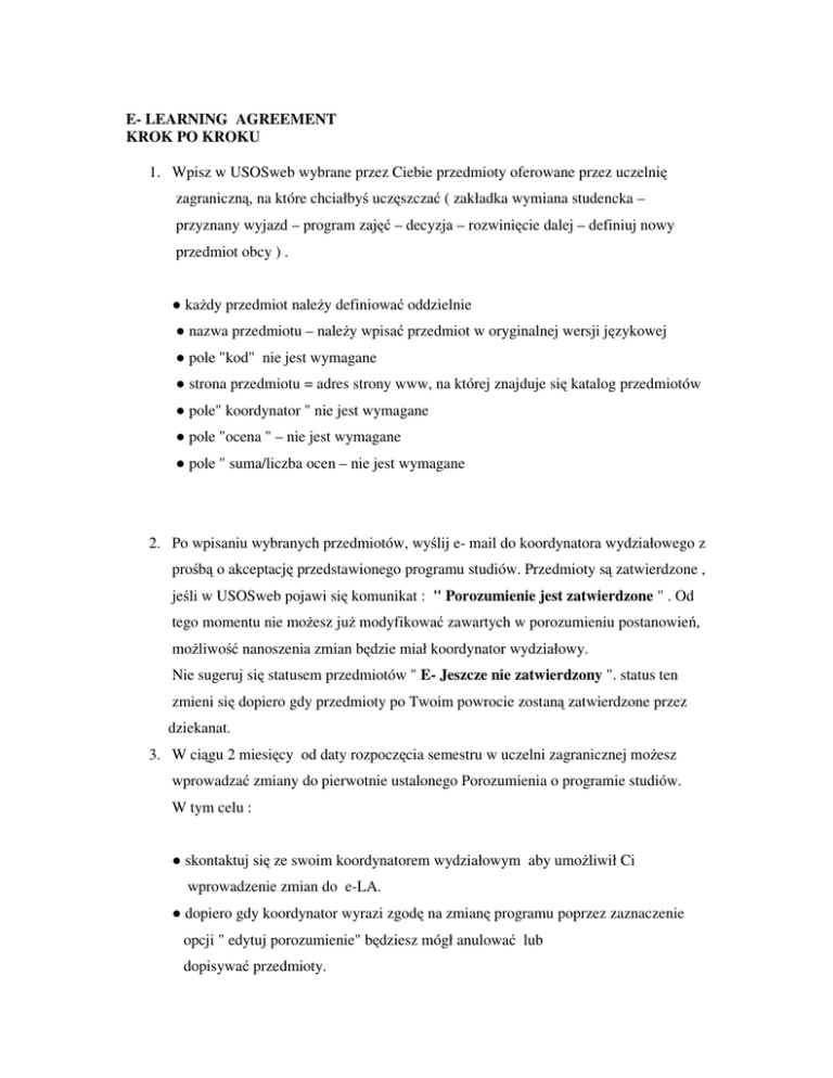 E- LEARNING AGREEMENT KROK PO KROKU 1. Wpisz w USOSweb wybrane przez Ciebie przedmioty oferowane przez uczelnię zagraniczną, na które chciałbyś uczęszczać ( zakładka wymiana studencka – przyznany wyjazd – program zajęć – decyzja – rozwinięcie dalej – definiuj nowy przedmiot obcy ) . ● kaŜdy przedmiot naleŜy definiować oddzielnie ● nazwa przedmiotu – naleŜy wpisać przedmiot w oryginalnej wersji językowej ● pole "kod" nie jest wymagane ● strona przedmiotu = adres strony www, na której znajduje się katalog przedmiotów ● pole" koordynator " nie jest wymagane ● pole "ocena " – nie jest wymagane ● pole " suma/liczba ocen – nie jest wymagane 2. Po wpisaniu wybranych przedmiotów, wyślij e- mail do koordynatora wydziałowego z prośbą o akceptację przedstawionego programu studiów. Przedmioty są zatwierdzone , jeśli w USOSweb pojawi się komunikat : " Porozumienie jest zatwierdzone " . Od tego momentu nie moŜesz juŜ modyfikować zawartych w porozumieniu postanowień, moŜliwość nanoszenia zmian będzie miał koordynator wydziałowy. Nie sugeruj się statusem przedmiotów " E- Jeszcze nie zatwierdzony ". status ten zmieni się dopiero gdy przedmioty po Twoim powrocie zostaną zatwierdzone przez dziekanat. 3. W ciągu 2 miesięcy od daty rozpoczęcia semestru w uczelni zagranicznej moŜesz wprowadzać zmiany do pierwotnie ustalonego Porozumienia o programie studiów. W tym celu : ● skontaktuj się ze swoim koordynatorem wydziałowym aby umoŜliwił Ci wprowadzenie zmian do e-LA. ● dopiero gdy koordynator wyrazi zgodę na zmianę programu poprzez zaznaczenie opcji " edytuj porozumienie" będziesz mógł anulować lub dopisywać przedmioty. Pamietaj ! JeŜeli przedłuŜasz studia na kolejny semestr i musisz uzgodnić nowe e-LA lub jeśli chcesz dokonać zmian w e-LA w drugim semestrze , postępuj jak wyŜej. 4. Wpisanie przedmiotów do Porozumienia o programie studiów w usosweb jest warunkiem niezbędnym do podpisania indywidualnej umowy na wyjazd między studentem a Uczelnią. Jeśli Uczelnia partnerska bądź Twój koordynator wydziałowy wymagają papierowej formy LA, będziesz mógł wydrukować dokument po zatwierdzeniu przedmiotów przez koordynatora. JeŜeli forma papierowa nie jest wymagana moŜesz przesłać dokument w formie elektronicznej. 5. W celu rozliczenie studiów na Uczelni partnerskiej przedstawiasz swojemu koordynatorowi następujące dokumenty : ● wydrukowany oryginał ostatecznej wersji e-LA podpisany przez koordynatora uczelni zagranicznej. ● dokument potwierdzający Twoje osiągnięcia ( Transcript of Records ) zgodny z e-LA . ● zaświadczenie potwierdzające okres studiów w uczelni zagranicznej " Confirmation of study period " ( wzór zaświadczenia dostępny na stronie: www.erasmus.amu.edu.pl )