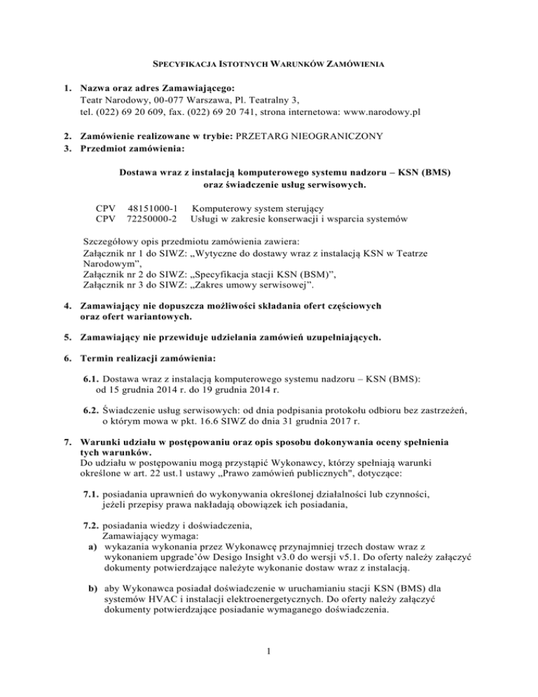 SPECYFIKACJA ISTOTNYCH WARUNKÓW ZAMÓWIENIA 1. Nazwa oraz adres Zamawiającego: Teatr Narodowy, 00-077 Warszawa, Pl. Teatralny 3, tel. (022) 69 20 609, fax. (022) 69 20 741, strona internetowa: www.narodowy.pl 2. Zamówienie realizowane w trybie: PRZETARG NIEOGRANICZONY 3. Przedmiot zamówienia: Dostawa wraz z instalacją komputerowego systemu nadzoru – KSN (BMS) oraz świadczenie usług serwisowych. CPV CPV 48151000-1 72250000-2 Komputerowy system sterujący Usługi w zakresie konserwacji i wsparcia systemów Szczegółowy opis przedmiotu zamówienia zawiera: Załącznik nr 1 do SIWZ: „Wytyczne do dostawy wraz z instalacją KSN w Teatrze Narodowym”, Załącznik nr 2 do SIWZ: „Specyfikacja stacji KSN (BSM)”, Załącznik nr 3 do SIWZ: „Zakres umowy serwisowej”. 4. Zamawiający nie dopuszcza możliwości składania ofert częściowych oraz ofert wariantowych. 5. Zamawiający nie przewiduje udzielania zamówień uzupełniających. 6. Termin realizacji zamówienia: 6.1. Dostawa wraz z instalacją komputerowego systemu nadzoru – KSN (BMS): od 15 grudnia 2014 r. do 19 grudnia 2014 r. 6.2. Świadczenie usług serwisowych: od dnia podpisania protokołu odbioru bez zastrzeżeń, o którym mowa w pkt. 16.6 SIWZ do dnia 31 grudnia 2017 r. 7. Warunki udziału w postępowaniu oraz opis sposobu dokonywania oceny spełnienia tych warunków. Do udziału w postępowaniu mogą przystąpić Wykonawcy, którzy spełniają warunki określone w art. 22 ust.1 ustawy „Prawo zamówień publicznych", dotyczące: 7.1. posiadania uprawnień do wykonywania określonej działalności lub czynności, jeżeli przepisy prawa nakładają obowiązek ich posiadania, 7.2. posiadania wiedzy i doświadczenia, Zamawiający wymaga: a) wykazania wykonania przez Wykonawcę przynajmniej trzech dostaw wraz z wykonaniem upgrade’ów Desigo Insight v3.0 do wersji v5.1. Do oferty należy załączyć dokumenty potwierdzające należyte wykonanie dostaw wraz z instalacją. b) aby Wykonawca posiadał doświadczenie w uruchamianiu stacji KSN (BMS) dla systemów HVAC i instalacji elektroenergetycznych. Do oferty należy załączyć dokumenty potwierdzające posiadanie wymaganego doświadczenia. 1 c) aby Wykonawca posiadał status Partnera firmy Siemens. Do oferty należy załączyć dokumenty potwierdzające posiadanie wymaganego statusu. 7.3. dysponowania odpowiednim potencjałem technicznym oraz osobami zdolnymi do wykonania zamówienia, 7.4. sytuacji ekonomicznej i finansowej, Zamawiający wymaga by Wykonawca był ubezpieczony od odpowiedzialności cywilnej w zakresie prowadzonej działalności związanej z przedmiotem zamówienia. 8. Informacja o oświadczeniach lub dokumentach, jakie mają dostarczyć Wykonawcy w celu potwierdzenia spełniania warunków udziału w postępowaniu oraz nie podlegania wykluczeniu na podstawie Art. 24 ust. 1 ustawy Pzp. 8.1. W zakresie wykazania spełniania przez Wykonawcę warunków, o których mowa w art. 22 ust. 1 ustawy Pzp, należy przedłożyć: a) oświadczenie o spełnianiu warunków udziału w postępowaniu. b) wykaz wykonanych, a w przypadku świadczeń okresowych lub ciągłych również wykonywanych, głównych dostaw (wraz z instalacją) w okresie ostatnich trzech lat przed upływem terminu składania ofert, a jeżeli okres prowadzenia działalności jest krótszy – w tym okresie, wraz z podaniem przedmiotu, dat wykonania i podmiotów na rzecz których dostawy zostały wykonane oraz załączeniem dowodów czy zostały wykonane lub są wykonywane należycie. Dokument ten musi potwierdzać spełnianie warunku, o którym mowa w pkt. 7.2 a) SIWZ. c) dokumenty potwierdzające, że Wykonawca posiada doświadczenie w uruchamianiu stacji BMS dla systemów HVAC i instalacji elektroenergetycznych. Dokument ten musi potwierdzać spełnianie warunku, o którym mowa w pkt. 7.2 b) SIWZ. d) dokumenty potwierdzające, że Wykonawca, posiada status Partnera firmy Siemens. Dokument ten musi potwierdzać spełnianie warunku, o którym mowa w pkt. 7.2 c) SIWZ. e) opłaconą polisę, a w przypadku jej braku, inny dokument potwierdzający, że Wykonawca jest ubezpieczony od odpowiedzialności cywilnej w zakresie prowadzonej działalności związanej z przedmiotem zamówienia. f) Wykonawca powołujący się przy wykazywaniu spełnienia warunków udziału w postępowaniu na zasoby innych podmiotów, które będą brały udział w realizacji części zamówienia, przedkłada także dokumenty tego podmiotu, w zakresie wymaganym dla Wykonawców określonym w pkt. 8.1. e) SIWZ. 8.2. W zakresie potwierdzenia nie podlegania wykluczeniu na podstawie art. 24 ust. 1 ustawy Pzp, należy przedłożyć: a) oświadczenie o braku podstaw do wykluczenia. b) aktualny odpis z właściwego rejestru lub z centralnej ewidencji i informacji o działalności gospodarczej, jeżeli odrębne przepisy wymagają wpisu do rejestru lub ewidencji, w celu wykazania braku podstaw do wykluczenia w oparciu 2 o art. 24 ust.1 pkt. 2 ustawy Pzp, wystawiony nie wcześniej niż 6 miesięcy przed upływem terminu składania ofert. c) aktualne zaświadczenie właściwego naczelnika urzędu skarbowego potwierdzające, że Wykonawca nie zalega z opłacaniem podatków, lub zaświadczenie, że uzyskał przewidziane prawem zwolnienie, odroczenie lub rozłożenie na raty zaległych płatności lub wstrzymanie w całości wykonania decyzji właściwego organu – wystawione nie wcześniej, niż 3 miesiące przed upływem terminu składania ofert. d) aktualne zaświadczenie właściwego oddziału Zakładu Ubezpieczeń Społecznych lub Kasy Rolniczego Ubezpieczenia Społecznego potwierdzające, że Wykonawca nie zalega z opłacaniem składek na ubezpieczenia zdrowotne i społeczne, lub potwierdzenia, że uzyskał przewidziane prawem zwolnienie, odroczenie lub rozłożenie na raty zaległych płatności lub wstrzymanie w całości wykonania decyzji właściwego organu - wystawione nie wcześniej niż 3 miesiące przed upływem terminu składania