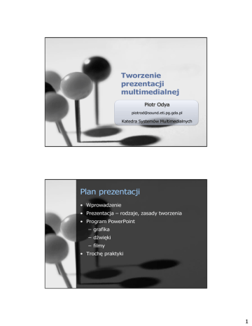 Tworzenie prezentacji multimedialnej Piotr Odya [email protected] Katedra Systemów Multimedialnych Plan prezentacji • Wprowadzenie • Prezentacja – rodzaje, zasady tworzenia • Program PowerPoint – grafika – dźwięki – filmy • Trochę praktyki 1 Multimedia MULTIMEDIA Wprowadzenie • Prezentacja multimedialna – współczesnym i nowoczesnym środkiem przekazu informacji oraz prezentacji danych; • Prezentacja multimedialna pozwala w znacznie łatwiejszy i ciekawszy sposób przekazać istotne informacje oraz dane; • Ogromny rozwój technik multimedialnych upowszechnił multimedialny sposób przekazu informacji nie tylko wśród profesjonalistów; 2 Tworzenie prezentacji - narzędzia • Proste prezentacje typu „slide show” – oprogramowanie typu PowerPoint (Keynote); • Zaawansowane prezentacje autorskie, działające w postaci samodzielnych aplikacji – np. Prezi, Flash; • Skomplikowane, zaawansowane, nietypowe prezentacje autorskie, wykorzystujące niestandardową obsługę akcji i interakcji – np. narzędzia programistyczne (Visual); • Prezentacje oparte na HTML-u – wykorzystując JavaScript, Flasha i HTML-5 możliwe jest stworzenie bardzo zaawansowanych prezentacji, które łatwo udostępnić w Internecie Etapy realizacji prezentacji • Plan i konspekt prezentacji; • Opracowanie treści prezentacji; • Wybór narzędzia; • Opracowanie projektu i elementów graficznych; • Opracowanie elementów wideofonicznych; • Integracja za pomocą wybranego narzędzia tekstu, grafiki, dźwięków oraz zapewnienie interakcji; 3 Jak przygotować dobrą prezentację? • Naprawdę dobrze przemyśleć plan prezentacji; • Zastosować logiczny i konsekwentny układ prezentacji; • Użyć „prostej” czcionki; • Dobrać odpowiednią kolorystykę; • Stosować równoważniki zdań, unikać zbyt długich opisów; • Wykorzystywać elementy graficzne i wideofoniczne odpowiedniej jakości; • Unikać nadużywania zbędnych elementów prezentacji; • Używać sprawdzania pisowni. Jak dobrze zaprezentować (się) • Nie czytać tekstu, który mamy na ekranie; • Sprawdzić poprawność działania prezentacji na komputerze, który mamy do dyspozycji; – *.ppt vs. *.pptx – *.pdf na wszelki wypadek • Dopasować styl prezentowania (i samą prezentację) pod kątem odbiorcy; • Nie tracić czasu na sprawy oczywiste; • Starać się trzymać ram czasowych (o ile takie nam narzucono); • Wiedzieć, co mamy na następnym slajdzie; 4 Tutaj jakiś tytuł • Obrazy można ogólnie podzielić na rzeczywiste i wirtualne. Obrazy rzeczywiste są reprezentacją realnych obiektów, powstają w wyniku ich oddziaływania na czułą na to oddziaływanie powierzchnię, będącej miejscem powstania obrazu. Obrazy wirtualne są natomiast efektem ludzkiej wyobraźni - przykładem może być obraz stworzony przy użyciu programu graficznego. Bardzo często spotykane są formy pośrednie, powstałe w wyniku modyfikacji obrazów rzeczywistych. • W obrazach rzeczywistych oddziaływanie może być przez obiekt wyemitowane, odbite lub przepuszczone. Dawniej jedyną formą tworzenia obrazów było oddziaływanie mechaniczne, np. odcisk. • Obrazy trójwymiarowe powstają przy zastosowaniu tomografii, np. tomografia rezonansu magnetycznego. Inne techniki, np. holografia, nie dają w istocie w pełni trójwymiarowej informacji o obiektach, a jedynie "efekt 3D". PowerPoint i jego możliwości 5 Tekst • Zwykły tekst – formatowany jak w edytorze tekstu; • Notatki i materiały informacyjne; • Animacje tekstu – Animacje tekstu • Animacje tekstu Grafika (rastrowa) • Nie używać obrazka o zbyt małej rozdzielczości, bo na dużym ekranie będzie widać jego wszystkie wady; • Skany i zdjęcia w wysokiej rozdzielczości mogą niepotrzebnie zwiększać „wagę” pliku; – typowa rozdzielczość projektorów to 1024x768; • Warto korzystać z możliwości ustawienia przezroczystości w niektórych typach obrazków; • Rysunki, tła, grafiki przygotowywać w formacie gif; • Zdjęcia – format jpg; • Format uniwersalny – png. 6 Dźwięki • Formatów plików dźwiękowych jest baaaardzo dużo – trzeba użyć tego najbardziej uniwersalnego – bo inaczej nic nie usłyszymy – PowerPoint typowo obsługuje pliki: • wav • midi • mp3 (starsze wersje PP niekoniecznie) • aac (starsze wersje PP niekoniecznie) • FLAC (starsze wersje PP niekoniecznie) • snd (format Mac-owski) • ścieżki CD-Audio Dźwięki • Warto wszystkie nasze pliki dźwiękowe znormalizować – wyrównać ich głośność • Przed prezentacją trzeba sprawdzić czy dźwięki się odtwarzają – różne ścieżki dostępu – niektóre wejścia/wyjścia karty dźwiękowej mogą być wyciszone • Możliwość zapisania dźwięku razem z prezentacją (w nowszych wersjach PP) 7 Dźwięki - przykłady Typowy „głośniczek” wskazujący, że jest pod nim ukryty jakiś dźwięk A tu już własny obrazek, po kliknięciu którego odtwarza się muzyka To zaś ikonka wskazująca, że będzie odtwarzana ścieżka z płyty CDAudio STOP Wideo • formaty: – AVI – ASF, WMV – MPG –MPEG1, MPEG2 – MKV – MP4 – MOV (QuickTime) 8 Wideo • format AVI może używać wielu kodeków – w prezentacjach wykorzystywać te, które są na pewno w systemie (?) – na wszelki wypadek warto mieć „zestaw” kodeków – najlepiej „ffdshow” – Office 2010 miewa problemy np. z MPEG-2 • nie używać dużych rozdzielczości i dużych przepływności • zalecane formaty – MPEG 1 – będzie działał praktycznie wszędzie – WMV – na Windowsie – AVI z kodekami divx/xvid Wideo - przykłady 9 Umieszczanie aplikacji Inne funkcje • Sterowanie pokazem slajdów: – Możliwość treningu ze stoperem; – Dowolna kolejność wyświetlania; – Możliwość zapętlania slajdów; • Możliwość tworzenia prezentacji przenośnych; • Możliwość prezentacji online; • Możliwoś