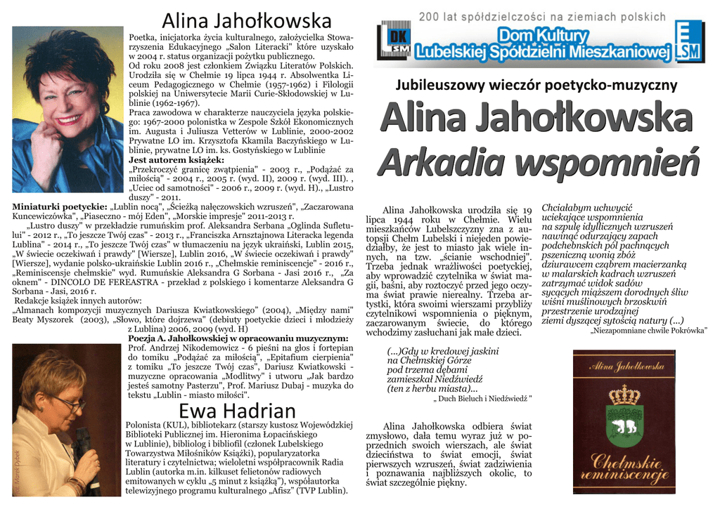 Poetka, inicjatorka życia kulturalnego, założycielka Stowa rzyszenia Edukacyjnego „Salon Literacki" które uzyskało w 2004 r. status organizacji pożytku publicznego. Od roku 2008 jest członkiem Związku Literatów Polskich. Urodziła się w Chełmie 19 lipca 1944 r. Absolwentka Li ceum Pedagogicznego w Chełmie (19571962) i Filologii polskiej na Uniwersytecie Marii CurieSkłodowskiej w Lu blinie (19621967). Praca zawodowa w charakterze nauczyciela języka polskie go: 19672000 polonistka w Zespole Szkół Ekonomicznych im. Augusta i Juliusza Vetterów w Lublinie, 20002002 Prywatne LO im. Krzysztofa Kkamila Baczyńskiego w Lu blinie, prywatne LO im. ks. Gostyńskiego w Lublinie Jest autorem książek: „Przekroczyć granicę zwątpienia" 2003 r., „Podążać za miłością" 2004 r., 2005 r. (wyd. II), 2009 r. (wyd. III). , „Uciec od samotności" 2006 r., 2009 r. (wyd. H)., „Lustro duszy" 2011. Miniaturki poetyckie: „Lublin nocą", „Ścieżką nałęczowskich wzruszeń", „Zaczarowana Kuncewiczówka", „Piaseczno mój Eden", „Morskie impresje" 20112013 r. „Lustro duszy" w przekładzie rumuńskim prof. Aleksandra Serbana „Oglinda Sufletu lui" 2012 r., „To jeszcze Twój czas" 2013 r., „Franciszka Arnsztajnowa Literacka legenda Lublina" 2014 r., „To jeszcze Twój czas" w tłumaczeniu na język ukraiński, Lublin 2015, „W świecie oczekiwań i prawdy" [Wiersze], Lublin 2016, „W świecie oczekiwań i prawdy" [Wiersze], wydanie polskoukraińskie Lublin 2016 r., „Chełmskie reminiscencje" 2016 r., „Reminiscensje chełmskie" wyd. Rumuńskie Aleksandra G Sorbana Jasi 2016 r., „Za oknem" DINCOLO DE FEREASTRA przekład z polskiego i komentarze Aleksandra G Sorbana Jasi, 2016 r. Redakcje książek innych autorów: „Almanach kompozycji muzycznych Dariusza Kwiatkowskiego” (2004), „Między nami" Beaty Myszorek (2003), „Słowo, które dojrzewa" (debiuty poetyckie dzieci i młodzieży z Lublina) 2006, 2009 (wyd. H) Poezja A. Jahołkowskiej w opracowaniu muzycznym: Prof. Andrzej Nikodemowicz 6 pieśni na głos i fortepian do tomiku „Podążać za miłością", „Epitafium cierpienia" z tomiku „To jeszcze Twój czas", Dariusz Kwiatkowski muzyczne opracowania „Modlitwy" i utworu „Jak bardzo jesteś samotny Pasterzu", Prof. Mariusz Dubaj muzyka do tekstu „Lublin miasto miłości". Polonista (KUL), bibliotekarz (starszy kustosz Wojewódzkiej Biblioteki Publicznej im. Hieronima Łopacińskiego w Lublinie), bibliolog i bibliofil (członek Lubelskiego Towarzystwa Miłośników Książki), popularyzatorka literatury i czytelnictwa; wieloletni współpracownik Radia Lublin (autorka m.in. kilkuset felietonów radiowych emitowanych w cyklu „5 minut z książką”), współautorka telewizyjnego programu kulturalnego „Afisz” (TVP Lublin). Alina Jahołkowska urodziła się 19 lipca 1944 roku w Chełmie. Wielu mieszkańców Lubelszczyzny zna z au topsji Chełm Lubelski i niejeden powie działby, że jest to miasto jak wiele in nych, na tzw. „ścianie wschodniej". Trzeba jednak wrażliwości poetyckiej, aby wprowadzić czytelnika w świat ma gii, baśni, aby roztoczyć przed jego oczy ma świat prawie nierealny. Trzeba ar tystki, która swoimi wierszami przybliży czytelnikowi wspomnienia o pięknym, zaczarowanym świecie, do którego wchodzimy zasłuchani jak małe dzieci. (...)Gdy w kredowej jaskini na Chełmskiej Górze pod trzema dębami zamieszkał Niedźwiedź (ten z herbu miasta)... „ Duch Bieluch i Niedźwiedź " Alina Jahołkowska odbiera świat zmysłowo, dała temu wyraz już w po przednich swoich wierszach, ale świat dzieciństwa to świat emocji, świat pierwszych wzruszeń, świat zadziwienia i poznawania najbliższych okolic, to świat szczególnie piękny. Chciałabym uchwycić uciekające wspomnienia na szpulę idyllicznych wzruszeń nawinąć odurzający zapach podchebnskich pól pachnących pszeniczną wonią zbóż dziurawcem cząbrem macierzanką w malarskich kadrach wzruszeń zatrzymać widok sadów sycących miąższem dorodnych śliw wiśni muślinowych brzoskwiń przestrzenie urodzajnej ziemi dyszącej sytością natury (...) „Niezapomniane chwile Pokrówka” Alina Jahołkowska zwraca się do ad resata poprzez opis znanej i doświadczo nej przestrzeni, a przez to ukazuje ona stan własnej osobowości. Piękna przyro da, odpowiednia gama kolorów, muzycz ność, światło, dźwięk, te elementy domi nują w tej poezji, to świat odbierany eks presją i wrażeniami. Takie postrzeganie przyrody zostało w nią wpojone w ro dzinnym domu, taki rodzaj wrażliwości przekazali jej bliscy. Takiej estetyki ł ta kiego postrzegania piękna musi zawsze ktoś dziecko nauczyć. Zaszczepiony w dzieciństwie sposób postrzegania piękna wiąże później czło wieka z jego miejscem nazwać to moż na symbiozą. Wrażenia kolor, światło cień potrzebne są poetce do stworzenia impresjonistycznego nastroju po to, aby //tworzyły senną melodię lata / nasy conego złocistym cieniem / barw z pale ty Moneta // (...) Bohaterka wierszy Aliny Jahołkowskiej wczesne dzieciństwo spędziła w „krainie ar kadii" i to chce zapamiętać, ale nie był to ła twy okres dla chełmian. Okupacja niemiecka i zakończenie drugiej wojny światowej pozo stawiły w Chełmie i jego mieszkańcach nie zatarty ślad. Pragmatyzm codziennego dnia czasów powojennych często wygrywał, tworząc „no wego człowieka", pozbawionego głębszych duchowych aspiracji. Doświadczała tego również rodzina i bliscy Aliny Jahołkowskiej, o czym też nie omieszkała napisać. //(...) Ze gar czasu nowym oddechem /odmierza nadzieje i oczekiwania /w kalendarzu chełmskich kart //. Nic dziwnego, że trady cja, głęboka wiara, Kościół, dla niej, jak i dla wielu chełmian, były sprzymierzeńcem, bo kierowały ku transcendencji. // Mistyczny nastrój Wigilii / wypełniał cały dom znie walającym czasem oczekiwań // (...) Ikoną głębokiej wiary i nadziei, pomocą w tra