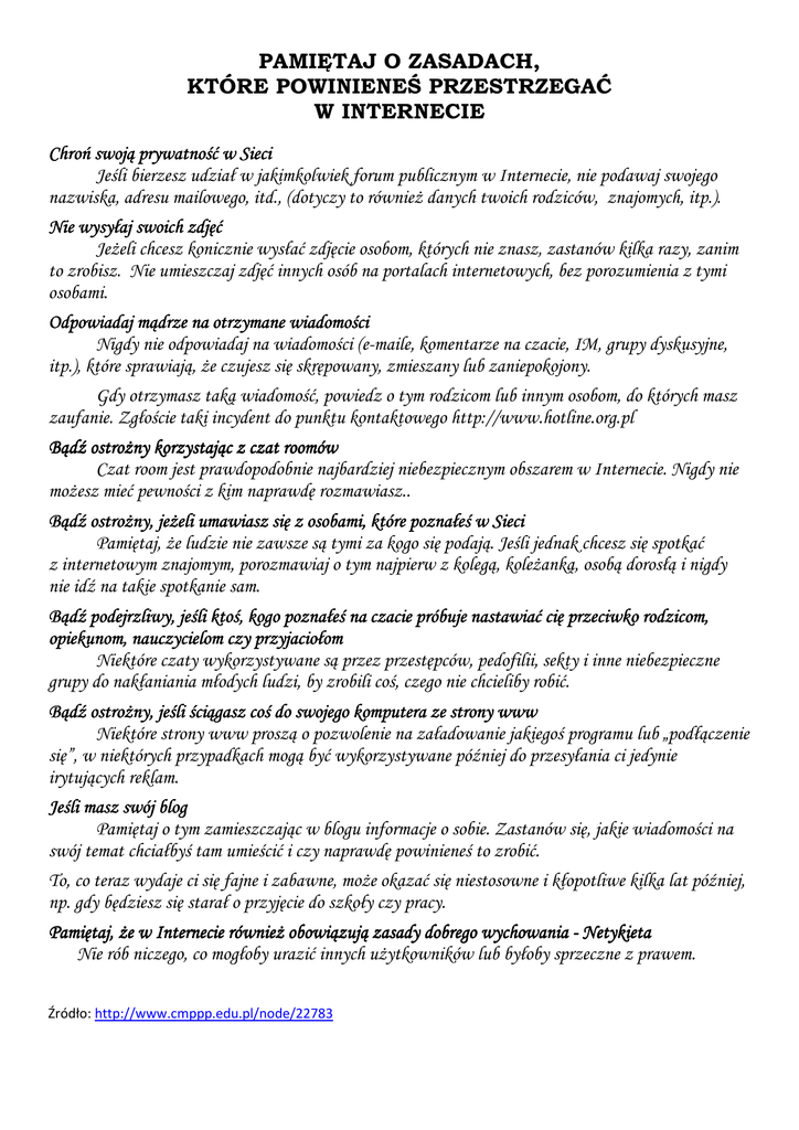 PAMIĘTAJ O ZASADACH, KTÓRE POWINIENEŚ PRZESTRZEGAĆ W INTERNECIE Chroń swoją prywatność w Sieci Jeśli bierzesz udział w jakimkolwiek forum publicznym w Internecie, nie podawaj swojego nazwiska, adresu mailowego, itd., (dotyczy to równieŜ danych twoich rodziców, znajomych, itp.). Nie wysyłaj swoich zdjęć JeŜeli chcesz konicznie wysłać zdjęcie osobom, których nie znasz, zastanów kilka razy, zanim to zrobisz. Nie umieszczaj zdjęć innych osób na portalach internetowych, bez porozumienia z tymi osobami. Odpowiadaj mądrze na otrzymane wiadomości Nigdy nie odpowiadaj na wiadomości (e-maile, komentarze na czacie, IM, grupy dyskusyjne, itp.), które sprawiają, Ŝe czujesz się skrępowany, zmieszany lub zaniepokojony. Gdy otrzymasz taką wiadomość, powiedz o tym rodzicom lub innym osobom, do których masz zaufanie. Zgłoście taki incydent do punktu kontaktowego http://www.hotline.org.pl Bądź ostroŜny korzystając z czat roomów Czat room jest prawdopodobnie najbardziej niebezpiecznym obszarem w Internecie. Nigdy nie moŜesz mieć pewności z kim naprawdę rozmawiasz.. Bądź ostroŜny, jeŜeli umawiasz się z osobami, które poznałeś w Sieci Pamiętaj, Ŝe ludzie nie zawsze są tymi za kogo się podają. Jeśli jednak chcesz się spotkać z internetowym znajomym, porozmawiaj o tym najpierw z kolegą, koleŜanką, osobą dorosłą i nigdy nie idź na takie spotkanie sam. Bądź podejrzliwy, jeśli ktoś, kogo poznałeś na czacie próbuje nastawiać cię przeciwko rodzicom, opiekunom, nauczycielom czy przyjaciołom Niektóre czaty wykorzystywane są przez przestępców, pedofilii, sekty i inne niebezpieczne grupy do nakłaniania młodych ludzi, by zrobili coś, czego nie chcieliby robić. Bądź ostroŜny, jeśli ściągasz coś do swojego komputera ze strony www Niektóre strony www proszą o pozwolenie na załadowanie jakiegoś programu lub „podłączenie się”, w niektórych przypadkach mogą być wykorzystywane później do przesyłania ci jedynie irytujących reklam. Jeśli masz swój blog Pamiętaj o tym zamieszczając w blogu informacje o sobie. Zastanów się, jakie wiadomości na swój temat chciałbyś tam umieścić i czy naprawdę powinieneś to zrobić. To, co teraz wydaje ci się fajne i zabawne, moŜe okazać się niestosowne i kłopotliwe kilka lat później, np. gdy będziesz się starał o przyjęcie do szkoły czy pracy. Pamiętaj, Ŝe w Internecie równieŜ obowiązują zasady dobrego wychowania - Netykieta Nie rób niczego, co mogłoby urazić innych uŜytkowników lub byłoby sprzeczne z prawem. Źródło: http://www.cmppp.edu.pl/node/22783 Netykieta zasady dobrego zachowania w Internecie Netykieta obowiązuje wszystkich internautów, choć pewnie nie wszyscy słyszeli o jej istnieniu. Została stworzona przez samych internautów, aby ułatwić wszystkim jak najbezpieczniejsze i najprzyjemniejsze korzystanie z moŜliwości oraz zasobów Sieci. 1. Wysyłaj listy krótkie, zwięzłe i na temat. 2. Jeśli zamierzasz napisać bardzo długi list lub poruszać w nim kilka tematów, podziel wiadomości na kilka mniejszych. 3. Jeśli odpowiadasz na list innego uŜytkownika Internetu, cytuj tylko naprawdę niezbędne fragmenty jego listu, a pozostałe usuń z odpowiedzi. 4. Jeśli przesyłasz jakiekolwiek obce informacje, podawaj zawsze jego źródło. 5. UŜywaj duŜych liter w tekście tylko wtedy, gdy chcesz podkreślić jakiś waŜny punkt lub wyróŜnić nagłówek. Całe zdania pisane wielkimi literami oznaczają podniesiony głos (KRZYK) 6. Przekazując dalej list innej osoby (tzw. forward) zawsze zapytaj o jej zgodę. 7. Na końcu kaŜdej przesyłki, w tzw. stopce, podawaj w kilku linijkach tekstu podstawowe dane na temat własnej osoby, tj. imię, nazwisko 8. Nie uŜywaj skrzynek pocztowych zainstalowanych w szkołach cz na uczelniach do celów handlowych i prywatnych 9. Nie wysyłaj informacji o charakterze komercyjnym (np. reklam) do innych uŜytkowników, jeśli wyraźnie cię o to nie poproszą. 10. Nie wysyłaj razem z listem duŜych prac tekstowych, zdjęć bądź innych plików zajmujących znaczne ilości miejsca na dysku. Za nieprzestrzeganie netykiety moŜesz zostać „zbanowany(a)” (otrzymać od administratora blokadę na dostęp, np.: do forum) lub po prostu internetowa społeczność zacznie cię ignorować. Źródło: Technologia Informacyjna. Podręcznik dla szkół ponadgimnazjalnych. Witold Wrotek PRZYKAZANIA ETYKI KOMPUTETROWEJ 1. Nie będziesz uŜywał komputera, aby szkodzić bliźnim. 2. Nie będziesz przeszkadzał bliźnim w pracy z komputerem. 3. Nie będziesz grzebał w plikach bliźnich. 4. Nie będziesz uŜywał komputera do kradzieŜy. 5. Nie będziesz uŜywał komputera do składania fałszywych świadectw. 6. Nie będziesz uŜywał lub kopiował programów, za które nie zapłaciłeś. 7. Nie będziesz uŜywał zasobów bliźnich bez zezwolenia. 8. Nie będziesz przywłaszczał sobie własności intelektualnej bliźnich. 9. Będziesz rozwaŜał społecznie konsekwencje programów, które napiszesz. 10. Będziesz uŜywał komputera z rozwagą i szacunkiem. Źródło: Technologia Informacyjna. PODRĘCZNIK DLA SZKÓŁ PONADGIMNAZJALNYCH. Witold Wrotek SPOSOBY INTERWENCJI: Jeśli natrafiłeś w Internecie na nielegalne treści, koniecznie zgłoś w następujący sposób: za pomocą formularza internetowego: www.dyzurnet.pl, pocztą elektroniczną pod adres: [email protected], zwykłym listem na adres: Naukowa o Akademicka Sieć Komputerowa, 02-796, ul. Wąwozowa 18 – koniecznie z dopiskiem HOTLINE. Jest to hotline, który przyjmuje i reaguje na zgłoszenia, dotyczące występowania w Internecie treści nielegalnych (pornografia dziecięca, treści rasistowskie i ksenofobiczne). Jeśli masz podejrzenie, Ŝe zostało złamane prawo, to pod Ŝadnym pozorem nie działaj na własną rękę, tylko jak najszybciej powiadom policję (tel.: 997 lub 112, albo www.policja.pl). Nie usuwaj dowodów przestępstwa – naw
