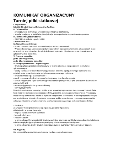 KOMUNIKAT ORGANIZACYJNY Turniej piłki siatkowej I. Organizator: Miejski Ośrodek Sportu i Rekreacji w Radlinie. II. Cel zawodów: - propagowanie aktywnego wypoczynku i integracji społecznej, - popularyzacja gry w siatkówkę jako jednej z form spędzania aktywnie wolnego czasu III. Termin i miejsce zawodów: - 26.07.2014r. sobota – godz. 14.00 - Boisko Orlik 2012 IV. Warunki uczestnictwa: - Prawo startu w zawodach ma młodzież (od 14 lat) oraz dorośli - W zawodach mogą uczestniczyć jedynie zawodnicy zgłoszeni w terminie. W zawodach może uczestniczyć max. 8 drużyn decyduje kolejność zgłoszeń. Nie dopuszcza się dodatkowych zgłoszeń w dniu zawodów. V. Program zawodów: godz. 1300 rozgrzewka, godz. 1400 rozpoczęcie zawodów VI. Przepisy techniczno - organizacyjne: - Drużynę zgłasza przedstawiciel drużyny w formie pisemnej na specjalnym formularzu zgłoszeniowym. - Osoby startujące w zawodach muszą posiadać pisemną zgodę prawnego opiekuna oraz oświadczenie o stanie zdrowia podpisane przez prawnego opiekuna. - Drużyna składa się z 6 zawodników i max. 2 rezerwowych .drużyny mogą być mieszane tzn. damsko-męskie - Mecze rozgrywane są do dwóch wygranych setów granych do 25 pkt. przy stanie 1:1 trzeci set gramy do 15 pkt. - obowiązują przepisy do gry w siatkówkę - Kary dyscyplinarne Zawodnik może zostać usunięty z boiska przez prowadzącego mecz na karę czasową 2 minut. Taka kara może być zastosowana wobec zawodnika, przeklina, zachowuje się niesportowo. Prowadzący może usunąć zawodnika z boiska za wybitnie niesportowe zachowanie. W takim przypadku drużyna gra w osłabionym składzie. Organizator ma prawo wykluczenia drużyny z rozgrywek w przypadku celowego niszczenia urządzeń i sprzętu sportowego oraz wulgarnego zachowania zawodników. - Punktacja Za wygrany mecz przyznawane są 3 punkty, porażka 0 punktów. O kolejności w grupie decyduje: - większa liczba zdobytych punktów - bezpośredni mecz - stosunek setów - w przypadku gdyby więcej niż 2 drużyny spełniały powyższe punkty tworzona będzie dodatkowa tabela uwzględniająca tylko mecze pomiędzy zainteresowanymi drużynami. - w przypadku max. Liczby drużyn obowiązuje system pucharowy (przegrywający odpada) VII. Nagrody: Dla uczestników przewidziano dyplomy, medale, nagrody rzeczowe VIII. Zgłoszenia do zawodów: Zgłoszenia do zawodów można dokonywać od poniedziałku do piątku od godz. 10:00 do godz. 22:00 u Animatora Sportu na boisku Orlik 2012 w nieprzekraczalnym terminie do dnia 25.07.2014r. na specjalnym formularzu zgłoszeniowym. IX. Postanowienia końcowe - Każdy uczestnik biorący udział w imprezie sportowo-rekreacyjnej wyraża zgodę na przetwarzanie danych osobowych przez Organizatora (MOSiR w Radlinie) celem zgłoszenia do imprezy i podania wyników do ogólnej wiadomości (zgodnie z Ustawą z dnia 29.08.1997 roku o Ochronie Danych Osobowych; tekst jednolity: Dz. U. z 2002r. Nr 101, poz. 926 ze zm.)." - Akceptując regulamin każdy Uczestnik (w przypadku osób niepełnoletnich Opiekun) wyraża zgodę, aby zdjęcia, nagrania filmowe oraz wywiady z jego osobą, a także wyniki z jego danymi osobowymi mogły być wykorzystane przez prasę, radio, telewizję oraz na portalach internetowych a także w celach marketingowych Organizatora i sponsorów. - Osoby niepełnoletnie startujące w zawodach muszą posiadać pisemną zgodę prawnego opiekuna oraz oświadczenie o braku przeciwwskazań zdrowotnych do udziału w imprezie do wglądu przez Organizatora - Organizator nie ponosi odpowiedzialności z tytułu ubezpieczeń zdrowotnych i następstw nieszczęśliwych wypadków a także rzeczy pozostawionych na obiekcie sportowym. - Zgłoszenie do turnieju jest równoznaczne z akceptacją regulaminu - W zawodach mogą uczestniczyć jedynie zawodnicy zgłoszeni na formularzu zgłoszeniowym przygotowanym przez Organizatora - Organizator zastrzega sobie prawo zmian w regulaminie www.mosir.eu FORMULARZ ZGŁOSZENIOWY Turniej piłki siatkowej 26.07.2014r …………………………………………………………………………… Nazwa drużyny : Imię i nazwisko Data urodzenia 1 2 3 4 5 6 7 8 9 10 Zgłoszenie się do turnieju jest jednoznaczne z akceptacją regulaminu ………………………………... Podpis opiekuna drużyny Podpis