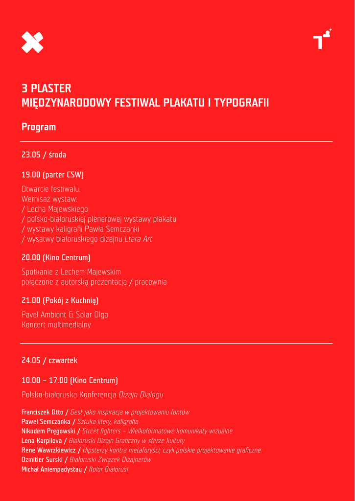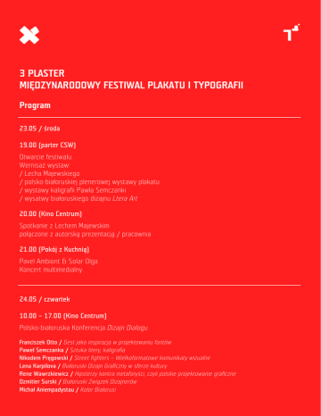 3 PLASTER MIĘDZYNARODOWY FESTIWAL PLAKATU I TYPOGRAFII Program 23.05 / środa 19.00 (parter CSW) Otwarcie festiwalu. Wernisaż wystaw: / Lecha Majewskiego / polsko-białoruskiej plenerowej wystawy plakatu / wystawy kaligrafii Pawła Semczanki / wysatwy białoruskiego dizajnu Ltera Art 20.00 (Kino Centrum) Spotkanie z Lechem Majewskim połączone z autorską prezentacją / pracownia 21.00 (Pokój z Kuchnią) Pavel Ambiont & Solar Olga Koncert multimedialny 24.05 / czwartek 10.00 – 17.00 (Kino Centrum) Polsko-białoruska Konferencja Dizajn Dialogu Franciszek Otto / Gest jako inspiracja w projektowaniu fontów Paweł Semczanka / Sztuka litery, kaligrafia Nikodem Pręgowski / Street fighters – Wielkoformatowe komunikaty wizualne Lena Karpilova / Białoruski Dizajn Graficzny w sferze kultury Rene Wawrzkiewicz / Hipsterzy kontra metaforyści, czyli polskie projektowanie graficzne Dzmitier Surski / Białoruski Związek Dizajnerów Michał Aniempadystau / Kolor Białorusi WARSZTATY TYPOGRAFICZNE Paweł Semczanka 23.05 / środa Czytelnia CSW 10.00 – 13.00 15.00 – 18.00 Łukasz Dziedzic 25–26.05 / piątek, sobota Czytelnia CSW 10.00 – 13.00 15.00 – 18.00 www.csw.torun.pl