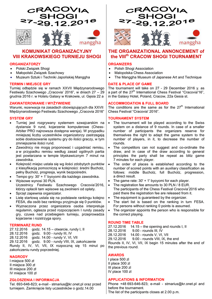 KOMUNIKAT ORGANIZACYJNY VIII KRAKOWSKIEGO TURNIEJU SHOGI THE ORGANIZATIONAL ANNONCEMENT of the VIIIth CRACOW SHOGI TOURNAMENT ORGANIZATORZY Polski Związek Shogi Małopolski Związek Szachowy Muzeum Sztuki i Techniki Japońskiej Manggha ORGANIZERS Polish Shogi Association Malopolska Chess Association The Manggha Museum of Japanese Art and Technique TERMIN I MIEJSCE GRY Turniej odbędzie się w ramach XXVII Międzynarodowego Festiwalu Szachowego „Cracovia’ 2016”, w dniach 27 – 29 grudnia 2016 r. w Hotelu Galaxy w Krakowie, ul. Gęsia 22 a DATE & PLACE OF GAME The tournament will take on 27 - 29 December 2016 y. as th a part of the 27 International Chess Festival “Cracovia'16”, in the Galaxy Hotel, Poland, Cracow, 22a Gesia st. ZAKWATEROWANIE I WYŻYWIENIE Warunki, rezerwacja na zasadach obowiązujących dla XXVII Międzynarodowego Festiwalu Szachowego „Cracovia 2016” ACCOMMODATION & FULL BOARD th The conditions are the same as for the 27 International Chess Festival “Cracovia' 2016”. SYSTEM GRY Turniej jest rozgrywany systemem szwajcarskim na dystansie 9 rund, kojarzenie komputerowe (ChessArbiter PRO najnowsza dostępna wersja). W przypadku mniejszej liczby uczestników organizatorzy zastrzegają sobie dostosowanie systemu gry do ilości graczy, w tym zmniejszenie ilości rund. Zawodnicy nie mogą proponować i uzgadniać remisu, a w przypadku remisu według zasad ogólnych partia jest powtarzana w tempie błyskawicznym 7 minut na zawodnika. Kolejność miejsc ustala się wg ilości zdobytych punktów z klasyfikacją pomocniczą w kolejności: średni Bucholz, pełny Bucholz, progresja, wynik bezpośredni. Tempo gry: 30' + 1' byoyomi dla każdego zawodnika. Wpisowe wynosi 30 PLN. Uczestnicy Festiwalu Szachowego Cracovia’2016, którzy opłacili tam wpisowe są zwolnieni od opłaty. Sprzęt zapewnia organizator. Listę startową ustala się na podstawie rankingu kolejno FESA, dla osób bez rankingu przyjmuje się 0 punktów. Wyznaczona przez organizatora osoba interpretuje regulamin, ogłasza przed rozpoczęciem I rundy zasady gry, czuwa nad przebiegiem turnieju, przeprowadza kojarzenie i rozstrzyga spory. TOURNAMENT SYSTEM The tournament will be played according to the Swiss system on a distance of 9 rounds. In case of a smaller number of participants the organizers reserve for themselves the right to adapt the game system to the number of players, in it, to decrease the number of rounds. The competitors can not suggest and co-ordinate the draw, and in case of the draw according to general principles the party shall be repeat as blitz game 7 minutes for each player. The order of places is established according to the number of scored points with an auxiliary classification as follows: middle Bucholz, full Bucholz, progression, a direct result. The game rate: 30' + 1' byoyomi for each player. The registration fee amounts to 30 PLN / 8 EUR. The participants of the Chess Festival Cracovia’2016 who paid there the registration fee are released from it. The equipment is guaranteed by the organizer. The start list is based on the ranking in turn FESA. For persons without ranking 0 points is assumed. The organizer appoints the person who is responsible for the correct playing. TERMINARZ RUND 27.12.2016 godz. 14.15 – otwarcie, rundy I, II 28.12.2016 godz. 9.00 - rundy III, IV 28.12.2016 godz. 14.00 - rundy V, VI, VII 29.12.2016 godz. 9.00 - rundy VIII, IX, zakończenie Rundy II, IV, VI, VII, IX rozpoczną się 15 minut po zakończeniu rundy poprzedniej. ROUND TIME TABLE 27.12.2016 14.15 – the opening and rounds I, II 28.12.2016 9.00 - rounds III, IV 28.12.2016 14.00 - rounds V, VI, VII 29.12.2016 9.00 - rounds VIII, IX, the end Rounds II, IV, VI, VII, IX begin 15 minutes after the end of the previous round. NAGRODY I miejsce 500 zł II miejsce 300 zł III miejsce 200 zł IV miejsce 100 zł AWARDS I place 500 zl II place 300 zl III place 200 zl IV place 100 zl ZGŁOSZENIA I INFORMACJA Tel. 693-646-823; e-mail - [email protected] oraz przed turniejem. Zamknięcie listy uczestników o godz.14.00 APPLICATIONS & INFORMATION Phone +48 693-646-823; e-mail - [email protected] and before the tournament. The list of the participants closes at 2.00 p.m.