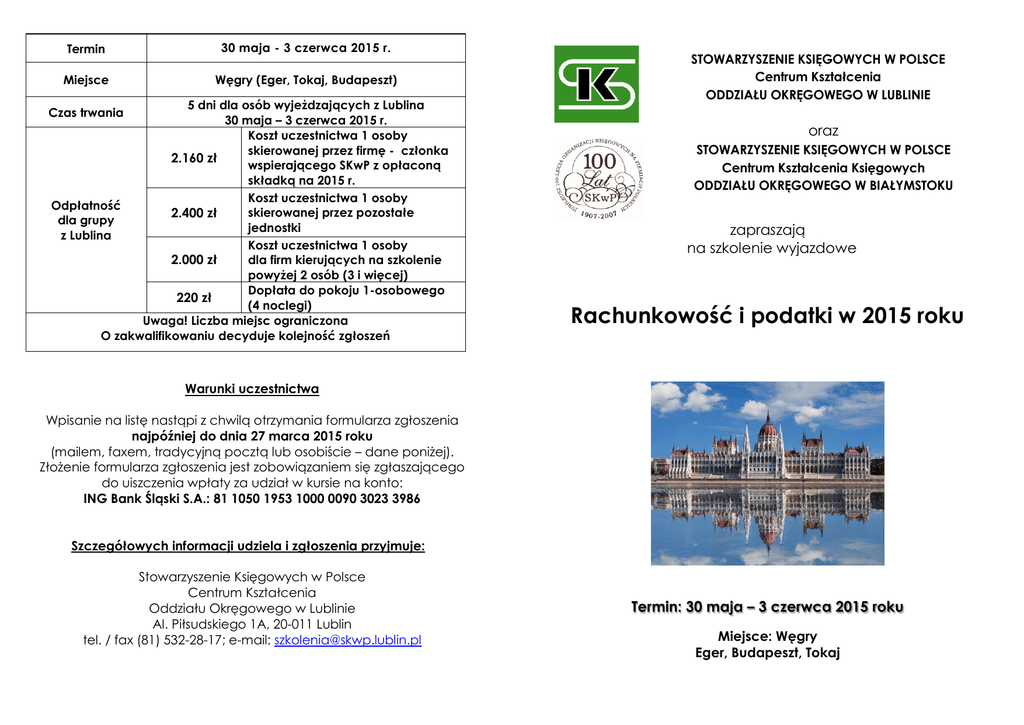 Termin 30 maja - 3 czerwca 2015 r. STOWARZYSZENIE KSIĘGOWYCH W POLSCE Miejsce (Eger, Tokaj, Budapeszt) ZARZĄDWęgry GŁÓWNY W WARSZAWIE ODDZIAŁ OKRĘGOWY W LUBLINIE 5 dni dla osób wyjeżdzających z Lublina STOWARZYSZENIE KSIĘGOWYCH W POLSCE Centrum Kształcenia ODDZIAŁU OKRĘGOWEGO W LUBLINIE Czas trwania 30 maja – 3 czerwca 2015 r. Koszt uczestnictwa 1 osoby Lider szkoleń dla księgowych skierowanej przez firmę - członka 2.160 zł wspierającego SKwP z opłaconą zapraszanana: składką 2015 r. Koszt uczestnictwa 1 osoby Odpłatność 2.400 zł Studia podyplomowe o skierowanej kierunku: przez pozostałe dla grupy jednostki z Lublina 1. Rachunkowość Koszt uczestnictwa 1 osoby dla firm kierujących na szkolenie 2.000 zł powyżej 2 osób (3 i więcej) Studium: Dopłata do pokoju 1-osobowego 220 zł (4 noclegi) 1. Dla kandydatów na doradców podatkowych Uwaga! Liczba miejsc ograniczona O zakwalifikowaniu decyduje kolejność zgłoszeń oraz STOWARZYSZENIE KSIĘGOWYCH W POLSCE Centrum Kształcenia Księgowych ODDZIAŁU OKRĘGOWEGO W BIAŁYMSTOKU zapraszają na szkolenie wyjazdowe Rachunkowość i podatki w 2015 roku Kursy: 1. Dla samodzielnych księgowych bilansistów Warunki uczestnictwa 2. Dla kandydatów na głównych księgowych 3. listę Rachunkowość budżetowa Wpisanie na nastąpi z chwilą otrzymania formularza zgłoszenia 4. Zatrudnienie płace najpóźniej do idnia 27 marca 2015 roku (mailem, faxem, tradycyjną pocztą lub osobiście – dane poniżej). ZłożenieSeminaria: formularza zgłoszenia jest zobowiązaniem się zgłaszającego do uiszczenia wpłaty za udział w kursie na konto: ING 1. Bank S.A.: 81 1050 1953 1000rewidentów 0090 3023 3986 DlaŚląski kandydatów na biegłych 2. Bilans 2008 3. Płace i prawo pracy w praktyce Szczegółowych informacji udziela i zgłoszenia 4. Podatek od towarów i usług w 2008przyjmuje: roku 5. Międzynarodowe Standardy Rachunkowości MSR Księgowych w Polsce i Stowarzyszenie MSSF Kształcenia a) Ustawa Centrum o rachunkowości Oddziału Okręgowego w 2008 Lublinie 6. Ubezpieczenia społeczne w roku Al. Piłsudskiego Lublin 7. Podatek akcyzowy 1A, wg 20-011 dyrektyw Unii Europejskiej tel. / fax (81) 532-28-17; e-mail: [email protected] Inwentaryzacja Termin: 30 maja – 3 czerwca 2015 roku Miejsce: Węgry Eger, Budapeszt, Tokaj PROGRAM SZKOLENIA I. RACHUNKOWOŚĆ W 2015 ROKU 1. Ustawa o rachunkowości po zmianach wprowadzonych w roku 2014 czyli tzw. "małej nowelizacji" - zagadnienia praktyczne. 2. Ustawa o rachunkowości – projektowane zmiany w zakresie prowadzenia ksiąg i sporządzania sprawozdań finansowych w związku z wdrożeniem dyrektywy UE nr 2013/34/UE. 3. Krajowe i Międzynarodowe Standardy Rachunkowości – rola standardów w praktyce rachunkowości. 4. Krajowy Standard Rachunkowości nr 7 - " Zmiana zasad (polityki) rachunkowości, wartości szacunkowych, poprawianie błędów, zdarzenia następujące po dniu bilansowym" - dobre praktyki pomocne przy sporządzaniu sprawozdania finansowego według zmienionej ustawy o rachunkowości. 5. MSR-18 „Przychody” - omówienie istotnych dla celów praktycznych zagadnień dotyczących zasad i metod oraz momentu rozpoznawania przychodów. Wykładowca: Małgorzata Mazurkiewicz - biegły rewident. Prowadzi wykłady z zakresu prawa podatkowego i rachunkowości. Jest członkiem Komisji Egzaminacyjnej dla kandydatów na biegłych rewidentów, autorem wielu zadań i pytań testowych z zakresu prawa podatkowego. Doświadczenie i praktyczną wiedzę zdobywała pracując nie tylko jako biegły rewident ale również jako Główny Księgowy oraz Dyrektor Finansowy w jednostkach krajowych i międzynarodowych. Jest współautorem zbiorów zadań i pytań testowych z zakresu prawa podatkowego wydanego przez Stowarzyszenie Księgowych w Polsce oraz Komentarza do ustawy CIT wydawnictwa Wolters Kluwer. II. PODATEK DOCHODOWY OD OSÓB FIZYCZNYCH W 2015 ROKU 1. 2. Obowiązki płatników w zakresie poboru podatku w odniesieniu do świadczeń dokonywanych na rzecz pracowników. Praktyczne problemy z kwalifikacją dochodów uzyskiwanych przez osoby fizyczne do odpowiedniego źródła przychodów. 3. 4. 5. 6. Opodatkowanie świadczeń dokonywanych na rzecz członków rady nadzorczej i członków zarządu. Podatkowe aspekty transakcji w zakresie sprzedaży i podziału majątku prywatnego osób fizycznych. Wybrane problemy dotyczące działalności gospodarczej prowadzonej przez osoby fizyczne. Pytania i odpowiedzi. Wykładowca: Bożena Nowicka – doradca podatkowy, ekspert w dziedzinie podatku dochodowego od osób fizycznych, wieloletni wykładowca Stowarzyszenia Księgowych w Polsce na kursach objętych certyfikacją zawodu księgowego, kursach przygotowujących do egzaminu na doradcę podatkowego oraz jednodniowych szkoleniach z zakresu prawa podatkowego. III. PODATEK OD TOWARÓW I USŁUG W 2015 ROKU ORAZ OBSZARY ZWIĘKSZONEGO RYZYKA PODATKOWEGO 1. 2. 3. 4. 5. 6. Obowiązek podatkowy w VAT - transakcje o charakterze ciągłym oraz rozliczane w okresach rozliczeniowych. Korekty transakcji z kontrahentami zagranicznymi – upusty, zwroty, reklamacje oraz korekty cen. „Pre współczynnik” przy odliczaniu VAT naliczonego – podatnicy zobowiązani do wyliczenia stopnia wykorzystywania majątku do działalności niepodlegającej opodatkowaniu. Transakcje z nieuczciwymi podatnikami – odpowiedzialność solidarna, zakazy odliczeń VAT, dobra wola jako przesłanka wyłączająca odpowiedzialność nabywcy, Wybrane orzecznictwo Naczelnego Sądu Administracyjnego oraz Europejskiego Trybunału Sprawiedliwości w sprawach VAT. Pytania i dyskusja. Wykładowca: Anna Mełgieś – doradca podatkowy, ekspert w dziedzinie podatku od towarów i usług, wieloletni wykładowca Stowarzyszenia Księgowych w Polsce na kursach objętych certyfikacją zawodu księgowego, kursach przygotowujących do egzaminu na doradcę podatkowego oraz jednodniowych szkoleniach z zakresu prawa podatkowego.