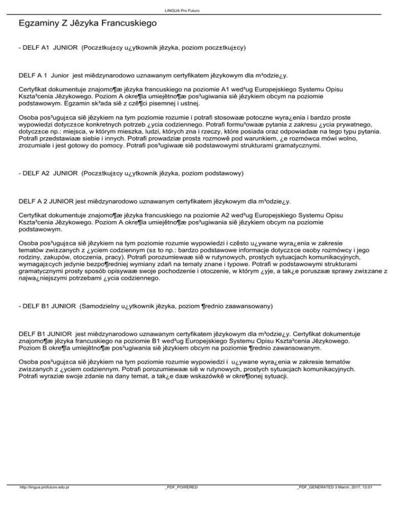 LINGUA Pro Futuro Egzaminy Z Jêzyka Francuskiego - DELF A1 JUNIOR (Pocz±tkuj±cy u¿ytkownik jêzyka, poziom pocz±tkuj±cy) DELF A 1 Junior jest miêdzynarodowo uznawanym certyfikatem jêzykowym dla m³odzie¿y. Certyfikat dokumentuje znajomo¶æ jêzyka francuskiego na poziomie A1 wed³ug Europejskiego Systemu Opisu Kszta³cenia Jêzykowego. Poziom A okre¶la umiejêtno¶æ pos³ugiwania siê jêzykiem obcym na poziomie podstawowym. Egzamin sk³ada siê z czê¶ci pisemnej i ustnej. Osoba pos³uguj±ca siê jêzykiem na tym poziomie rozumie i potrafi stosowaæ potoczne wyra¿enia i bardzo proste wypowiedzi dotycz±ce konkretnych potrzeb ¿ycia codziennego. Potrafi formu³owaæ pytania z zakresu ¿ycia prywatnego, dotycz±ce np.: miejsca, w którym mieszka, ludzi, których zna i rzeczy, które posiada oraz odpowiadaæ na tego typu pytania. Potrafi przedstawiaæ siebie i innych. Potrafi prowadziæ prost± rozmowê pod warunkiem, ¿e rozmówca mówi wolno, zrozumiale i jest gotowy do pomocy. Potrafi pos³ugiwaæ siê podstawowymi strukturami gramatycznymi. - DELF A2 JUNIOR (Pocz±tkuj±cy u¿ytkownik jêzyka, poziom podstawowy) DELF A 2 JUNIOR jest miêdzynarodowo uznawanym certyfikatem jêzykowym dla m³odzie¿y. Certyfikat dokumentuje znajomo¶æ jêzyka francuskiego na poziomie A2 wed³ug Europejskiego Systemu Opisu Kszta³cenia Jêzykowego. Poziom A okre¶la umiejêtno¶æ pos³ugiwania siê jêzykiem obcym na poziomie podstawowym. Osoba pos³uguj±ca siê jêzykiem na tym poziomie rozumie wypowiedzi i czêsto u¿ywane wyra¿enia w zakresie tematów zwi±zanych z ¿yciem codziennym (s± to np.: bardzo podstawowe informacje dotycz±ce osoby rozmówcy i jego rodziny, zakupów, otoczenia, pracy). Potrafi porozumiewaæ siê w rutynowych, prostych sytuacjach komunikacyjnych, wymagaj±cych jedynie bezpo¶redniej wymiany zdañ na tematy znane i typowe. Potrafi w podstawowymi strukturami gramatycznymi prosty sposób opisywaæ swoje pochodzenie i otoczenie, w którym ¿yje, a tak¿e poruszaæ sprawy zwi±zane z najwa¿niejszymi potrzebami ¿ycia codziennego. - DELF B1 JUNIOR (Samodzielny u¿ytkownik jêzyka, poziom ¶rednio zaawansowany) DELF B1 JUNIOR jest miêdzynarodowo uznawanym certyfikatem jêzykowym dla m³odzie¿y. Certyfikat dokumentuje znajomo¶æ jêzyka francuskiego na poziomie B1 wed³ug Europejskiego Systemu Opisu Kszta³cenia Jêzykowego. Poziom B okre¶la umiejêtno¶æ pos³ugiwania siê jêzykiem obcym na poziomie ¶rednio zawansowanym. Osoba pos³uguj±ca siê jêzykiem na tym poziomie rozumie wypowiedzi i u¿ywane wyra¿enia w zakresie tematów zwi±zanych z ¿yciem codziennym. Potrafi porozumiewaæ siê w rutynowych, prostych sytuacjach komunikacyjnych. Potrafi wyraziæ swoje zdanie na dany temat, a tak¿e daæ wskazówkê w okre¶lonej sytuacji. http://lingua.profuturo.edu.pl _PDF_POWERED _PDF_GENERATED 3 March, 2017, 13:51