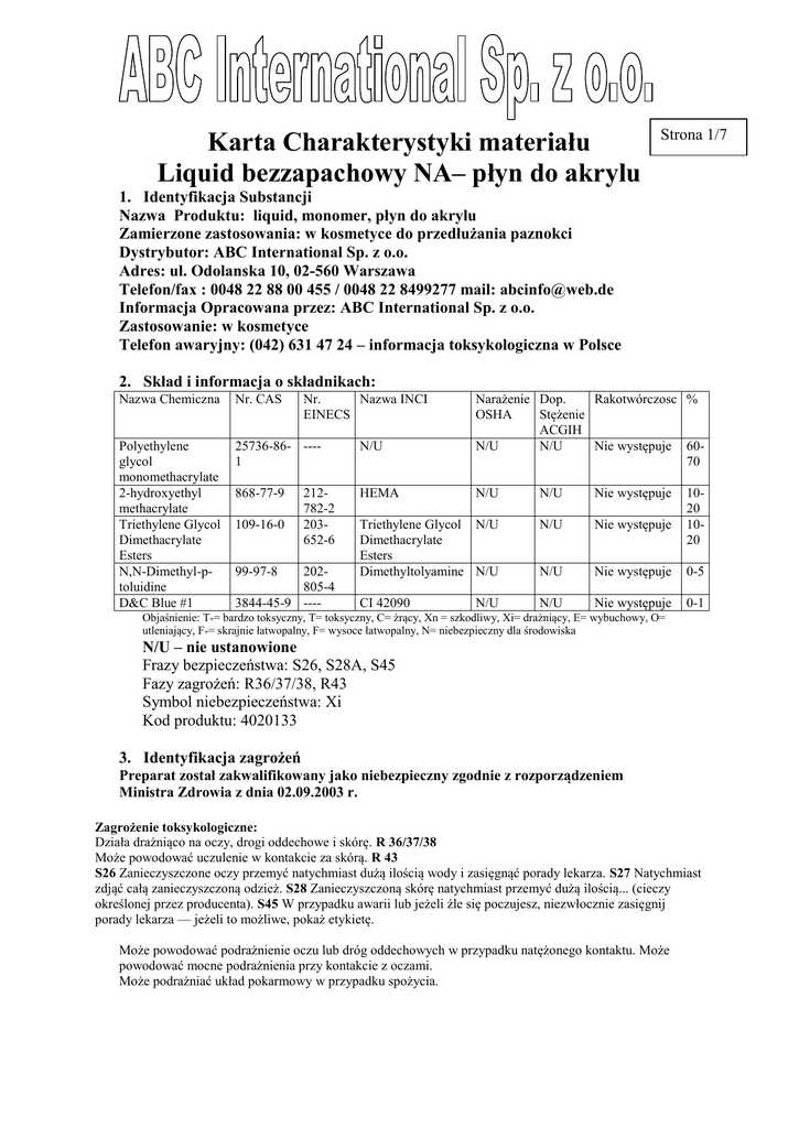 Karta Charakterystyki materiału Liquid bezzapachowy NA– płyn do akrylu Strona 1/7 1. Identyfikacja Substancji Nazwa Produktu: liquid, monomer, płyn do akrylu Zamierzone zastosowania: w kosmetyce do przedłużania paznokci Dystrybutor: ABC International Sp. z o.o. Adres: ul. Odolanska 10, 02-560 Warszawa Telefon/fax : 0048 22 88 00 455 / 0048 22 8499277 mail: [email protected] Informacja Opracowana przez: ABC International Sp. z o.o. Zastosowanie: w kosmetyce Telefon awaryjny: (042) 631 47 24 – informacja toksykologiczna w Polsce 2. Skład i informacja o składnikach: Nazwa Chemiczna Nr. CAS Polyethylene glycol monomethacrylate 2-hydroxyethyl methacrylate Triethylene Glycol Dimethacrylate Esters N,N-Dimethyl-ptoluidine D&C Blue #1 25736-86- ---1 N/U 868-77-9 HEMA 109-16-0 99-97-8 Nr. Nazwa INCI EINECS 212782-2 203652-6 202805-4 3844-45-9 ---- Narażenie Dop. Rakotwórczosc % OSHA Stężenie ACGIH N/U N/U Nie występuje 6070 N/U N/U Nie występuje Triethylene Glycol N/U Dimethacrylate Esters Dimethyltolyamine N/U N/U Nie występuje N/U Nie występuje 0-5 CI 42090 N/U Nie występuje 0-1 N/U 1020 1020 Objaśnienie: T+= bardzo toksyczny, T= toksyczny, C= żrący, Xn = szkodliwy, Xi= drażniący, E= wybuchowy, O= utleniający, F+= skrajnie łatwopalny, F= wysoce łatwopalny, N= niebezpieczny dla środowiska N/U – nie ustanowione Frazy bezpieczeństwa: S26, S28A, S45 Fazy zagrożeń: R36/37/38, R43 Symbol niebezpieczeństwa: Xi Kod produktu: 4020133 3. Identyfikacja zagrożeń Preparat został zakwalifikowany jako niebezpieczny zgodnie z rozporządzeniem Ministra Zdrowia z dnia 02.09.2003 r. Zagrożenie toksykologiczne: Działa drażniąco na oczy, drogi oddechowe i skórę. R 36/37/38 Może powodować uczulenie w kontakcie za skórą. R 43 S26 Zanieczyszczone oczy przemyć natychmiast dużą ilością wody i zasięgnąć porady lekarza. S27 Natychmiast zdjąć całą zanieczyszczoną odzież. S28 Zanieczyszczoną skórę natychmiast przemyć dużą ilością... (cieczy określonej przez producenta). S45 W przypadku awarii lub jeżeli źle się poczujesz, niezwłocznie zasięgnij porady lekarza — jeżeli to możliwe, pokaż etykietę. Może powodować podrażnienie oczu lub dróg oddechowych w przypadku natężonego kontaktu. Może powodować mocne podrażnienia przy kontakcie z oczami. Może podrażniać układ pokarmowy w przypadku spożycia. Karta Charakterystyki materiału Liquid bezzapachowy NA– płyn do akrylu Strona 2/7 4. Pierwsza pomoc Informacja ogólna Przy wdychaniu – Należy wyjść na świeże powietrze, jeżeli dojdzie do zatrzymania oddechu, należy wezwać natychmiast pomoc medyczna i rozpocząć próbę przywołania oddechu. Przy kontakcie z oczami: Należy przemyć woda oczy przez 15 min. Jeżeli objawy nie ustąpią, należy skontaktować się z lekarzem okulista. Przy kontakcie ze skora: Zdjąć zanieczyszczone ubranie i buty. Oczyścić mechanicznie zanieczyszczoną skórę, przemyć dużą ilością wody a następnie wodą z łagodnym mydłem. W przypadku gdy wystąpi podrażnienie skóry, które nie przemija, skonsultować się z lekarzem dermatologiem. Po spożyciu: Nie wolno spożywać. Jeżeli dojdzie do wymiotów, należy otulić ciepło osobę , wyciszyć otoczenie, wezwać pomoc lekarska. Przy dostaniu się środka do układu oddechowego przy wymiotach, może spowodować poważne konsekwencje. 5. Postępowanie w przypadku pożaru: Punkt zapłonowy (0F/0C) Limit zapalny (vol.%) Przy zamkniętym opakowaniu >200 0F/930C LEL: N/U; UEL : N/U Samo zapalna temperatura (vol.%) ND 5.1. zalecane środki gaśnicze: suchy proszek, mgła wodna, gaśnice pianowe, pianę gaśniczą odporna na alkohol 5.2. dodatkowe źródła zagrożeń: środek jest łatwopalny, unikać zapaleń. specjalne środki ochrony: Zgodnie z powszechnie obowiązującymi przepisami przemysłowej higieny pracy. 5.3. inne informacje: Nie stosować zwartych strumieni wody. woda można tylko schłodzić kontener z produktem. 6. Środki ostrożności przy niekontrolowanym rozlaniu / rozsypaniu Osoby, które nie są wyposażone w specjalny ubiór, powinny być natychmiastowo ewakuowane z miejsca rozlania. Natychmiast należy odsunąć kontenery z produktem z miejsca zagrożenia, jak i inne substancje łatwo palne. Zatrzymać proces dalszego rozlewania. Do zbierania rozlanej cieczy używać materiały absorbujące. Chronić kanalizację, wody powierzchniowe i grunt przed zanieczyszczeniem. Wody popożarowe traktować jako niebezpieczne zanieczyszczenie i gromadzić w oddzielnych pojemnikach. Nie stosować rozpuszczalników i rozcieńczalników. Zabezpieczyć studzienki ściekowe. Nie dopuszczać do skażenia gruntu. W przypadku poważnego zanieczyszczenia jakichkolwiek elementu środowiska, powiadomić odpowiednie władze administracyjne i kontrolne oraz organizacje ratownicze. Karta Charakterystyki materiału Liquid bezzapachowy NA– płyn do akrylu Strona 3/7 7. Transport i magazynowanie Unikać kontaktu z oczami, twarzą, wdychania. Unikać światła. Przed spożywaniem posiłku, piciem, przed paleniem tytoniu, po kontakcie z produktem, należy dokładnie umyć ręce i twarz mydłem z woda. Należy postępować zgodnie z zasadami BHP. Podczas wszelkich, wykonywanych czynności z preparatem: nie jeść, nie pić, nie palić nie zażywać lekarstw, unikać bezpośrednich kontaktów z preparatem, unikać wdychania par i aerozoli, przestrzegać zasad higieny osobistej, stosować odzież i sprzęt ochrony osobistej. Chronić przed dziećmi. Unikać wdychania par i aerozoli. Należy składować produkt w chłodnym, suchym i zaciemnionym miejscu. Wszelkie pomieszczenia magazynowe muszą być wydajnie wentylowane. Przechowywać we właściwie oznakowanych, fabrycznych, zamkniętych opakowaniach, z informacją w języku polskim zgodną z obowiązującymi normami. Podłoże musi być wykonane z materiału nieprzepuszczalnego, najlepiej ceramicznego tak wykonane, aby uniemożliwiać swobodne przemieszczan