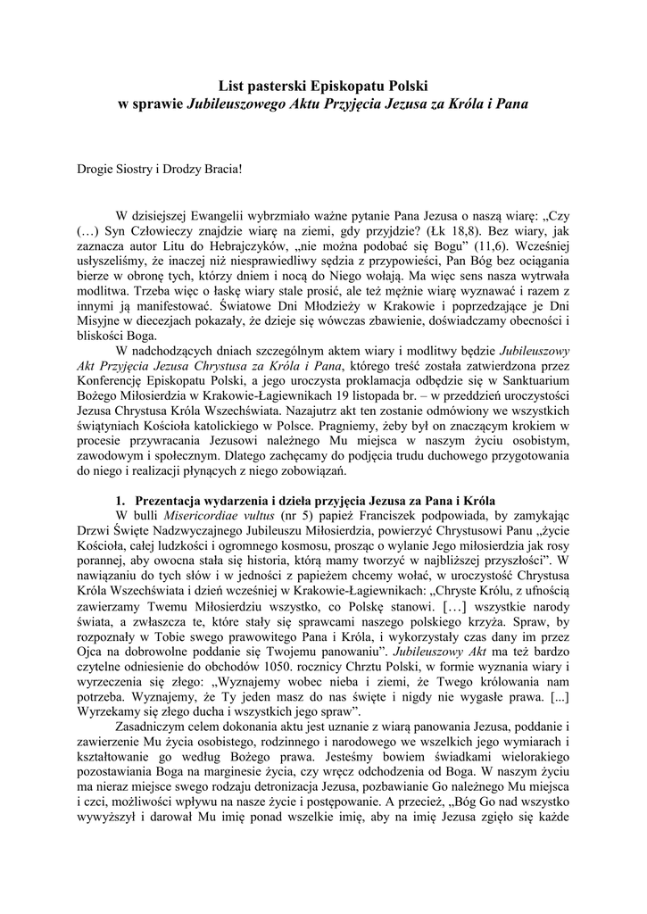 List pasterski Episkopatu Polski w sprawie Jubileuszowego Aktu Przyjęcia Jezusa za Króla i Pana Drogie Siostry i Drodzy Bracia! W dzisiejszej Ewangelii wybrzmiało ważne pytanie Pana Jezusa o naszą wiarę: „Czy (…) Syn Człowieczy znajdzie wiarę na ziemi, gdy przyjdzie? (Łk 18,8). Bez wiary, jak zaznacza autor Litu do Hebrajczyków, „nie można podobać się Bogu” (11,6). Wcześniej usłyszeliśmy, że inaczej niż niesprawiedliwy sędzia z przypowieści, Pan Bóg bez ociągania bierze w obronę tych, którzy dniem i nocą do Niego wołają. Ma więc sens nasza wytrwała modlitwa. Trzeba więc o łaskę wiary stale prosić, ale też mężnie wiarę wyznawać i razem z innymi ją manifestować. Światowe Dni Młodzieży w Krakowie i poprzedzające je Dni Misyjne w diecezjach pokazały, że dzieje się wówczas zbawienie, doświadczamy obecności i bliskości Boga. W nadchodzących dniach szczególnym aktem wiary i modlitwy będzie Jubileuszowy Akt Przyjęcia Jezusa Chrystusa za Króla i Pana, którego treść została zatwierdzona przez Konferencję Episkopatu Polski, a jego uroczysta proklamacja odbędzie się w Sanktuarium Bożego Miłosierdzia w Krakowie-Łagiewnikach 19 listopada br. – w przeddzień uroczystości Jezusa Chrystusa Króla Wszechświata. Nazajutrz akt ten zostanie odmówiony we wszystkich świątyniach Kościoła katolickiego w Polsce. Pragniemy, żeby był on znaczącym krokiem w procesie przywracania Jezusowi należnego Mu miejsca w naszym życiu osobistym, zawodowym i społecznym. Dlatego zachęcamy do podjęcia trudu duchowego przygotowania do niego i realizacji płynących z niego zobowiązań. 1. Prezentacja wydarzenia i dzieła przyjęcia Jezusa za Pana i Króla W bulli Misericordiae vultus (nr 5) papież Franciszek podpowiada, by zamykając Drzwi Święte Nadzwyczajnego Jubileuszu Miłosierdzia, powierzyć Chrystusowi Panu „życie Kościoła, całej ludzkości i ogromnego kosmosu, prosząc o wylanie Jego miłosierdzia jak rosy porannej, aby owocna stała się historia, którą mamy tworzyć w najbliższej przyszłości”. W nawiązaniu do tych słów i w jedności z papieżem chcemy wołać, w uroczystość Chrystusa Króla Wszechświata i dzień wcześniej w Krakowie-Łagiewnikach: „Chryste Królu, z ufnością zawierzamy Twemu Miłosierdziu wszystko, co Polskę stanowi. […] wszystkie narody świata, a zwłaszcza te, które stały się sprawcami naszego polskiego krzyża. Spraw, by rozpoznały w Tobie swego prawowitego Pana i Króla, i wykorzystały czas dany im przez Ojca na dobrowolne poddanie się Twojemu panowaniu”. Jubileuszowy Akt ma też bardzo czytelne odniesienie do obchodów 1050. rocznicy Chrztu Polski, w formie wyznania wiary i wyrzeczenia się złego: „Wyznajemy wobec nieba i ziemi, że Twego królowania nam potrzeba. Wyznajemy, że Ty jeden masz do nas święte i nigdy nie wygasłe prawa. [...] Wyrzekamy się złego ducha i wszystkich jego spraw”. Zasadniczym celem dokonania aktu jest uznanie z wiarą panowania Jezusa, poddanie i zawierzenie Mu życia osobistego, rodzinnego i narodowego we wszelkich jego wymiarach i kształtowanie go według Bożego prawa. Jesteśmy bowiem świadkami wielorakiego pozostawiania Boga na marginesie życia, czy wręcz odchodzenia od Boga. W naszym życiu ma nieraz miejsce swego rodzaju detronizacja Jezusa, pozbawianie Go należnego Mu miejsca i czci, możliwości wpływu na nasze życie i postępowanie. A przecież, „Bóg Go nad wszystko wywyższył i darował Mu imię ponad wszelkie imię, aby na imię Jezusa zgięło się każde 2 kolano, istot niebieskich i ziemskich, i podziemnych. I aby wszelki język wyznał, że Jezus Chrystus jest Panem – ku chwale Boga Ojca” (Flp 2,9-11). Nie trzeba więc Chrystusa intronizować w znaczeniu wynoszenia Go na tron i nadawania Mu władzy ani też ogłaszać Go Królem. On przecież jest Królem królów i Panem panów na wieki (por. Ap 19,16; 1Tm 6,15n). Natomiast naszym wielkim zadaniem jest podjęcie dzieła intronizacji Jezusa w znaczeniu uznawania Jego królewskiej godności i władzy całym życiem i postępowaniem. Parafrazując myśl papieża Piusa XI z encykliki „Quas Primas”, można powiedzieć krótko: trzeba robić wszystko, by Chrystus panował. Tak określone zadanie domaga się uznania Chrystusa za swego i naszego Króla, uznania Jego panowania nad nami, czyli dobrowolnego poddania się Prawu Bożemu, Jego władzy, okazania Mu posłuszeństwa, celem uporządkowania, ułożenia po Bożemu życia osobistego i społecznego. Dlatego Jubileuszowy Akt jest nade wszystko aktem wiary, który potwierdza wybór Chrystusa i obliguje nas do życia na miarę zawartego z Nim przymierza, jest aktem sprawiedliwości, w znaczeniu oddania Mu tego, co Jemu należne i aktem posłuszeństwa w odpowiedzi na Jego Miłość. W proklamacji aktu nie chodzi tylko o jakiś wyraz zewnętrznego uznania Jezusa Królem i Panem, ale postawę głęboko wewnętrzną, duchową, która ma swoje konsekwencje w życiu i promieniuje na wszystkie sfery życia, na innych ludzi i owocuje w społeczeństwie. O to właśnie wołał św. Jan Paweł II w homilii inaugurującej swój pontyfikat: „Nie lękajcie się. Otwórzcie na oścież drzwi Chrystusowi! Dla Jego zbawczej władzy otwórzcie granice państw, systemów ekonomicznych, systemów politycznych oraz kierunków cywilizacyjnych”. Jubileuszowy Akt Przyjęcia Jezusa Chrystusa za Króla i Pana trzeba zatem widzieć szerzej, jako początek realizacji wielkiego dzieła otwarcia Jezusowi drzwi: naszych domów i serc, świątyń i miejsc pracy. Chodzi o dzieło umiłowania Jezusa do końca, oddania Mu życia, zawierzenia Mu siebie, swej przyszłości i pracy nad sobą, podejmowania posługi miłości miłosiernej ze względu na Niego oraz realizacji Ewangelii we wszelkich sferach życia, również społecznej, ekonomicznej i politycznej. 2. Zaproszenie do czynnego udziału w wydarzeniu i dziele intronizacji W trakcie