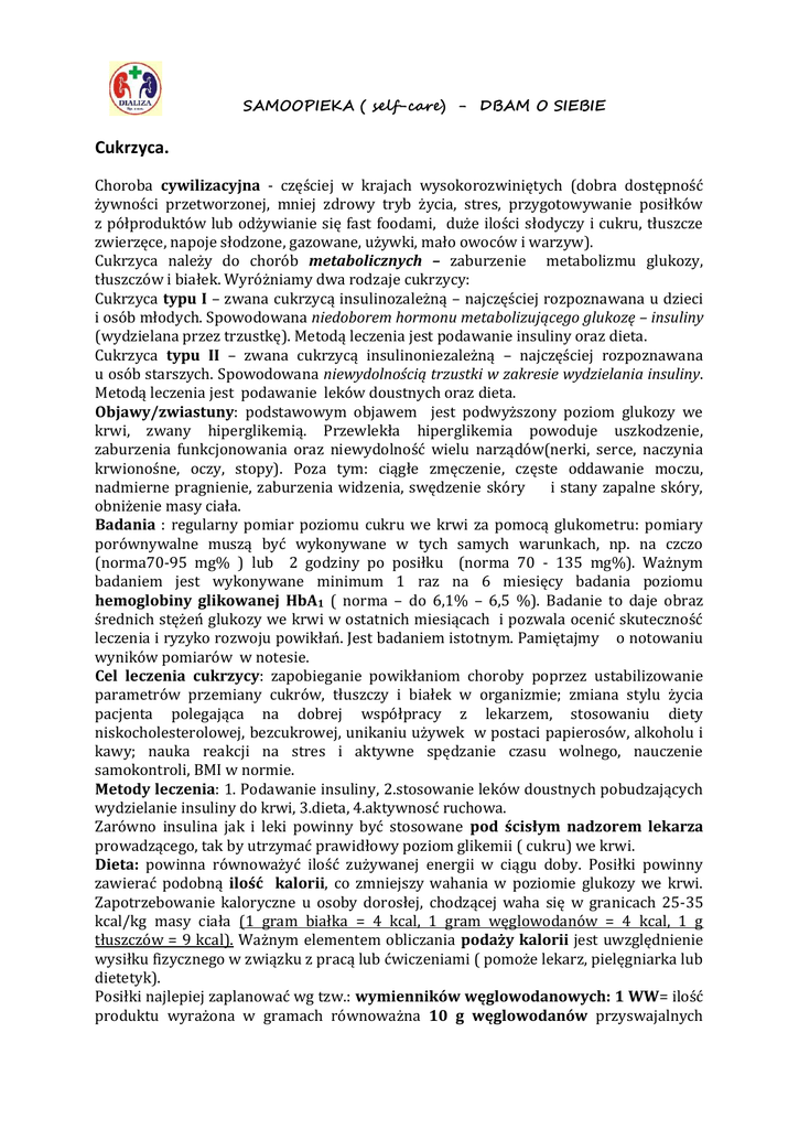 SAMOOPIEKA ( self-care) - DBAM O SIEBIE Cukrzyca. Choroba cywilizacyjna - częściej w krajach wysokorozwiniętych (dobra dostępność żywności przetworzonej, mniej zdrowy tryb życia, stres, przygotowywanie posiłków z półproduktów lub odżywianie się fast foodami, duże ilości słodyczy i cukru, tłuszcze zwierzęce, napoje słodzone, gazowane, używki, mało owoców i warzyw). Cukrzyca należy do chorób metabolicznych – zaburzenie metabolizmu glukozy, tłuszczów i białek. Wyróżniamy dwa rodzaje cukrzycy: Cukrzyca typu I – zwana cukrzycą insulinozależną – najczęściej rozpoznawana u dzieci i osób młodych. Spowodowana niedoborem hormonu metabolizującego glukozę – insuliny (wydzielana przez trzustkę). Metodą leczenia jest podawanie insuliny oraz dieta. Cukrzyca typu II – zwana cukrzycą insulinoniezależną – najczęściej rozpoznawana u osób starszych. Spowodowana niewydolnością trzustki w zakresie wydzielania insuliny. Metodą leczenia jest podawanie leków doustnych oraz dieta. Objawy/zwiastuny: podstawowym objawem jest podwyższony poziom glukozy we krwi, zwany hiperglikemią. Przewlekła hiperglikemia powoduje uszkodzenie, zaburzenia funkcjonowania oraz niewydolność wielu narządów(nerki, serce, naczynia krwionośne, oczy, stopy). Poza tym: ciągłe zmęczenie, częste oddawanie moczu, nadmierne pragnienie, zaburzenia widzenia, swędzenie skóry i stany zapalne skóry, obniżenie masy ciała. Badania : regularny pomiar poziomu cukru we krwi za pomocą glukometru: pomiary porównywalne muszą być wykonywane w tych samych warunkach, np. na czczo (norma70-95 mg% ) lub 2 godziny po posiłku (norma 70 - 135 mg%). Ważnym badaniem jest wykonywane minimum 1 raz na 6 miesięcy badania poziomu hemoglobiny glikowanej HbA1 ( norma – do 6,1% – 6,5 %). Badanie to daje obraz średnich stężeń glukozy we krwi w ostatnich miesiącach i pozwala ocenić skuteczność leczenia i ryzyko rozwoju powikłań. Jest badaniem istotnym. Pamiętajmy o notowaniu wyników pomiarów w notesie. Cel leczenia cukrzycy: zapobieganie powikłaniom choroby poprzez ustabilizowanie parametrów przemiany cukrów, tłuszczy i białek w organizmie; zmiana stylu życia pacjenta polegająca na dobrej współpracy z lekarzem, stosowaniu diety niskocholesterolowej, bezcukrowej, unikaniu używek w postaci papierosów, alkoholu i kawy; nauka reakcji na stres i aktywne spędzanie czasu wolnego, nauczenie samokontroli, BMI w normie. Metody leczenia: 1. Podawanie insuliny, 2.stosowanie leków doustnych pobudzających wydzielanie insuliny do krwi, 3.dieta, 4.aktywnosć ruchowa. Zarówno insulina jak i leki powinny być stosowane pod ścisłym nadzorem lekarza prowadzącego, tak by utrzymać prawidłowy poziom glikemii ( cukru) we krwi. Dieta: powinna równoważyć ilość zużywanej energii w ciągu doby. Posiłki powinny zawierać podobną ilość kalorii, co zmniejszy wahania w poziomie glukozy we krwi. Zapotrzebowanie kaloryczne u osoby dorosłej, chodzącej waha się w granicach 25-35 kcal/kg masy ciała (1 gram białka = 4 kcal, 1 gram węglowodanów = 4 kcal, 1 g tłuszczów = 9 kcal). Ważnym elementem obliczania podaży kalorii jest uwzględnienie wysiłku fizycznego w związku z pracą lub ćwiczeniami ( pomoże lekarz, pielęgniarka lub dietetyk). Posiłki najlepiej zaplanować wg tzw.: wymienników węglowodanowych: 1 WW= ilość produktu wyrażona w gramach równoważna 10 g węglowodanów przyswajalnych przez organizm (10 g czystego cukru), np.: 1 bułka kajzerka zawiera 3WW = 3x10g = 30 g glukozy ( organizm zachowuje się tak, jak po spożyciu 30 g czystego cukru). Pierwszy etap to ustalenie ile WW powinniśmy spożywać w ciągu doby. Następnie należy rozłożyć to na planowaną ilość posiłków w ciągu doby ( najlepiej 3 główne, II śniadanie i podwieczorek). Kiedy wiemy, ile WW powinniśmy zjeść na każdy posiłek – przeliczamy dostępne dla nas pokarmy na WW i układamy jadłospis. Znajomość ilości spożywanych WW pozwoli dobrze zaplanować podanie insuliny lub leków p/cukrzycowych. Zapobiega to wahaniom poziomu glukozy we krwi. Tabele z wymiennikami – dostępne w materiałach szkoleniowych u lekarzy a także na stronach internetowych, ułatwią przeliczanie na WW i korygowanie diety . Takie podejście ułatwi nam stosowanie diety, wprowadzi nawyk dla rodziny, ułatwi zapamiętanie przeliczników i planowanie zakupów. Przygotowanie w zdrowy sposób posiłków: gotowanie w wodzie lub na parze, pieczenie w folii, zakaz smażenia, unikanie tłuszczy zwierzęcych, stosowanie oliwy ( oliwki, winogrona) zawierającej kwasy tłuszczowe nienasycone, z przewagą jednonienasyconych; dużo warzyw. Indeks Glikemiczny produktów – IG- to pojęcie obrazujące tempo wzrostu stężenia glukozy we krwi po zjedzeniu określonego produktu. Odpowiednie to produkty o niskim indeksie glikemicznym, poniżej 50 %; stabilizują zmiany poziomu glukozy we krwi po posiłkach, co ma ogromne znaczenie w ograniczaniu powikłań cukrzycy . mgr piel., MBA Anna Wruk – Złotowska Regionalne Centrum Nefrologii tel. 94 37 27 383