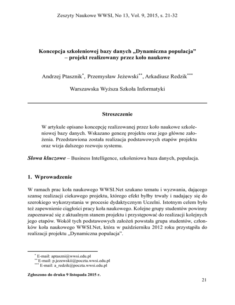 Zeszyty Naukowe WWSI, No 13, Vol. 9, 2015, s. 21-32 Koncepcja szkoleniowej bazy danych „Dynamiczna populacja” – projekt realizowany przez koło naukowe Andrzej Ptasznik*,1Przemysław Jeżewski**, Arkadiusz Redzik*** Warszawska Wyższa Szkoła Informatyki Streszczenie W artykule opisano koncepcję realizowanej przez koło naukowe szkoleniowej bazy danych. Wskazano genezę projektu oraz jego główne założenia. Przedstawiona została realizacja podstawowych etapów projektu oraz wizja dalszego rozwoju systemu. Słowa kluczowe – Business Intelligence, szkoleniowa baza danych, populacja. 1. Wprowadzenie W ramach prac koła naukowego WWSI.Net szukano tematu i wyzwania, dającego szansę realizacji ciekawego projektu, którego efekt byłby trwały i nadający się do szerokiego wykorzystania w procesie dydaktycznym Uczelni. Istotnym celem było też zapewnienie ciągłości pracy koła naukowego. Kolejne grupy studentów powinny zapoznawać się z aktualnym stanem projektu i przystępować do realizacji kolejnych jego etapów. Wokół tych podstawowych założeń powstała grupa studentów, członków koła naukowego WWSI.Net, która w październiku 2012 roku przystąpiła do realizacji projektu „Dynamiczna populacja”. * E-mail: [email protected] [email protected] *** E-mail: [email protected] ** E-mail: Zgłoszono do druku 9 listopada 2015 r. 21 Andrzej Ptasznik, Przemysław Jeżewski, Arkadiusz Redzik Założono że powstanie baza danych, która będzie mogła być wykorzystywana jako pomoc naukowa do zajęć wymagających operowania na dużych zestawach danych, w ramach różnych przedmiotów specjalistycznych. Wiodącym motywem podjętych działań był brak szkoleniowych baz danych, nadających się do specjalistycznych ćwiczeń z zakresu analizy danych oraz także fakt, iż zadanie takie wydawało się bardzo ciekawym wyzwaniem badawczym. 2. Przygotowanie wyjściowego obrazu populacji Projekt „Dynamiczna populacja” ma na celu odzwierciedlenie statycznego stanu populacji Polski, jak i modelowanie dynamicznych procesów w niej zachodzących. Projekt jest budowany w oparciu o technologię MS SQL Server. W pierwszym kroku ustalono główne zadania stawiane w procesie realizacji projektu: • utworzenie bazy danych będącej obraz populacji ludności w Polsce, • opracowanie symulatora zmian populacji i wybranych zdarzeń zachodzących w Polsce, • opracowanie scenariuszy wykorzystania systemu. Realizacja pierwszego zadania, wymagała przygotowania odpowiednich statystyk, które miały posłużyć do wygenerowania wyjściowego obrazu populacji. Do procesu generowania rozkładu populacji wykorzystano dwie statystyki. Na rysunku 1 pokazano tabelę w której zamieszone zostały dane o liczbie osób zamieszkujących gminy z podziałem na płeć i lokalizację miasto-wieś. Dane zostały przygotowane na podstawie udostępnionego przez Główny Urząd Statystyczny zestawienia Ludność w gminach według stanu w dniu 31.12.2011 r. bilans opracowany w oparciu o wyniki NSP’2011 [1]. Pokazane na rysunku 1 dane narzucały ilościową charakterystykę rozkładu populacji bez podziału na wiek osób. Konieczne było skorzystanie z kolejnej statystyki, pokazanej na rysunku 2, która zawierała procentowy rozkład populacji w powiatach według płci wieku i lokalizacji miasto-wieś. 22 Koncepcja szkoleniowej bazy danych „Dynamiczna populacja” – projekt … Rysunek 1. Liczba osób w gminach wg płci i podziału miasto/wieś Rysunek 2. Procentowy rozkład populacji w powiatach według wieku, płci i lokalizacji miasto-wieś 23 Andrzej Ptasznik, Przemysław Jeżewski, Arkadiusz Redzik Dodatkowym zadaniem, koniecznym do wykonania przed przystąpieniem do procesu generowania wyjściowego obrazu populacji, było przygotowanie danych opisujących lokalizacje. Zostało to zrobione w oparciu o rejestr TERYT, udostępniany przez główny Urząd Statystyczny. Rejestr TERYT udostępnia dane wszystkich lokalizacji w Polsce do poziomu ulicy, a dodatkowym zadanie było uzupełnienie tych danych o współrzędne geograficzne co w przyszłości ma umożliwić realizację zobrazowań przestrzennych. Na rysunku 3 pokazano fragment tabeli zawierającej przygotowane i uzupełnione o współrzędne geograficzne dane z rejestru TERYT. Rysunek 3. Fragment tabeli zawierającej zmodyfikowane dane rejestru TERYT W oparciu o statystyki Głównego Urzędu Statystycznego, ze szczególnym uwzględnieniem wyników Narodowego Spisu Powszechnego Ludności i Mieszkań z roku 2011, została utworzona wirtualna populacja o następujących cechach: a) jest tak samo liczna jak populacja wykazana w spisie powszechnym, b) jej rozmieszczenie terytorialne do poziomu gmin jest takie samo, jak to wykazane w spisie powszechnym, c) na podstawie wyników spisu powszechnego został przybliżony rozkład występowania określonych imion i nazwisk. Imiona i nazwiska w wirtualnej populacji zostały wylosowane na podstawie tego przybliżonego rozkładu, d) rozkłady płci i wieku w każdej gminie są przybliżeniem stanu prawdziwej populacji opisanym w wynikach spisu powszechnego, e) każdej osobie w wirtualnej populacji został nadany 14-cyfrowy zmodyfikowany PESEL, na zasadach podobnych do generacji prawdziwego numeru PESEL (11-cyfrowego), f) w systemie są uwzględnione wszystkie jednostki terytorialne z TERYT – urzędowego rejestru podziału terytorialnego prowadzonego przez Główny Urząd Statystyczny, 24 Koncepcja szkoleniowej bazy danych „Dynamiczna populacja” – projekt … g) każdej wirtualnej osobie przypisano najmniejszą możliwą jednostką terytorialną z systemu TERYT (ulica w przypadku miast, wieś w przypadku wsi bez ulic). h) każdej minimalnej jednostce terytorialnej zostały przyporządkowane współrzędne geograficzne pobrane z Google Maps API (Interfejs programistyczny aplikacji, ang. Application Programming Interface). Tym samym, każdej wirtualnej osobie także zostały przypisane współrzędne g