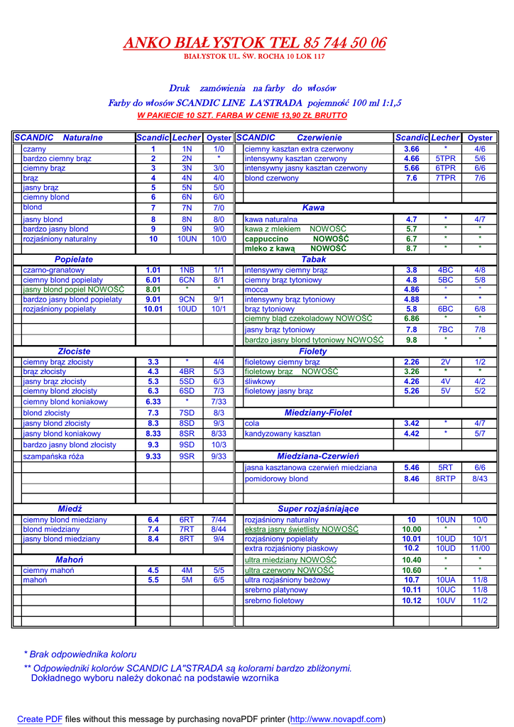 ANKO BIAŁYSTOK TEL 85 744 50 06 BIAŁYSTOK UL. ŚW. ROCHA 10 LOK 117 Druk zamówienia na farby do w łosów Farby do włosów SCANDIC LINE LA'STRADA pojemność 100 ml 1:1,5 W PAKIECIE 10 SZT. FARBA W CENIE 13,90 ZŁ BRUTTO SCANDIC Naturalne Scandic Lecher Oyster SCANDIC czarny bardzo ciemny brąz ciemny brąz brąz jasny brąz ciemny blond blond jasny blond bardzo jasny blond rozjaśniony naturalny 1N 2N 3N 4N 5N 6N 7N 8N 9N 10UN 1/0 * 3/0 4/0 5/0 6/0 7/0 8/0 9/0 10/0 ciemny kasztan extra czerwony intensywny kasztan czerwony intensywny jasny kasztan czerwony blond czerwony 1.01 6.01 8.01 9.01 10.01 1NB 6CN * 9CN 10UD 1/1 8/1 * 9/1 10/1 intensywny ciemny brąz ciemny brąz tytoniowy mocca intensywny brąz tytoniowy brąz tytoniowy ciemny bląd czekoladowy NOWOŚĆ jasny brąz tytoniowy bardzo jasny blond tytoniowy NOWOŚĆ 3.3 4.3 5.3 6.3 6.33 7.3 8.3 8.33 9.3 9.33 * 4BR 5SD 6SD * 7SD 8SD 8SR 9SD 9SR 4/4 5/3 6/3 7/3 7/33 8/3 9/3 8/33 10/3 9/33 fioletowy ciemny brąz fioletowy brąz NOWOŚĆ śliwkowy fioletowy jasny brąz Popielate czarno-granatowy ciemny blond popielaty jasny blond popiel NOWOŚĆ bardzo jasny blond popielaty rozjaśniony popielaty * 5TPR 6TPR 7TPR Oyster 4/6 5/6 6/6 7/6 NOWOŚĆ NOWOŚĆ NOWOŚĆ 4.7 5.7 6.7 8.7 * * * * 4/7 * * * 3.8 4.8 4.86 4.88 5.8 6.86 7.8 9.8 4BC 5BC * * 6BC * 7BC * 4/8 5/8 * * 6/8 * 7/8 * 2.26 3.26 4.26 5.26 2V * 4V 5V 1/2 * 4/2 5/2 3.42 4.42 * * 4/7 5/7 5.46 8.46 5RT 8RTP 6/6 8/43 10 10.00 10.01 10.2 10UN * 10UD 10UD * * 10UA 10UC 10UV 10/0 * 10/1 11/00 * * 11/8 11/8 11/2 Fiolety Miedź Miedziany-Fiolet cola kandyzowany kasztan Miedziana-Czerwień Super rozjaśniające 6.4 7.4 8.4 6RT 7RT 8RT 7/44 8/44 9/4 Mahoń ciemny mahoń mahoń 3.66 4.66 5.66 7.6 Kawa kawa naturalna kawa z mlekiem cappuccino mleko z kawą jasna kasztanowa czerwień miedziana pomidorowy blond ciemny blond miedziany blond miedziany jasny blond miedziany Scandic Lecher Tabak Złociste ciemny brąz złocisty brąz złocisty jasny brąz złocisty ciemny blond złocisty ciemny blond koniakowy blond złocisty jasny blond złocisty jasny blond koniakowy bardzo jasny blond złocisty szampańska róża Czerwienie 1 2 3 4 5 6 7 8 9 10 4.5 5.5 4M 5M 5/5 6/5 rozjaśniony naturalny ekstra jasny świetlisty NOWOŚĆ rozjaśniony popielaty extra rozjaśniony piaskowy ultra miedziany NOWOŚĆ ultra czerwony NOWOŚĆ ultra rozjaśniony beżowy srebrno platynowy srebrno fioletowy * Brak odpowiednika koloru ** Odpowiedniki kolorów SCANDIC LA"STRADA są kolorami bardzo zbliżonymi. Dokładnego wyboru należy dokonać na podstawie wzornika Create PDF files without this message by purchasing novaPDF printer (http://www.novapdf.com) 10.40 10.60 10.7 10.11 10.12
